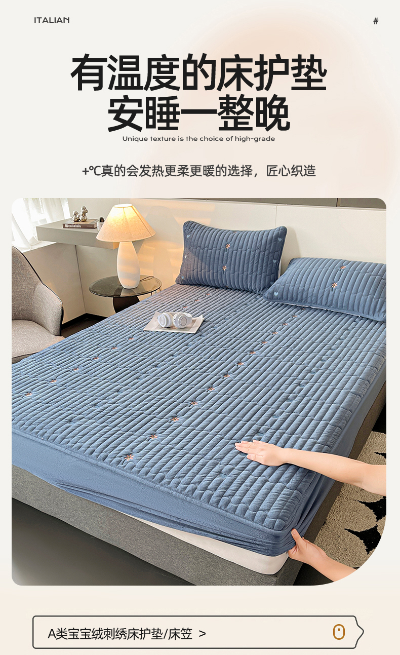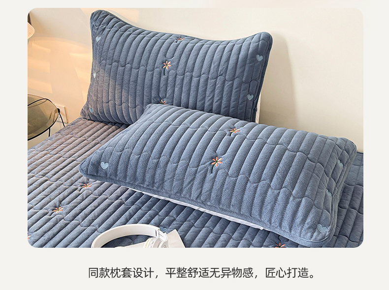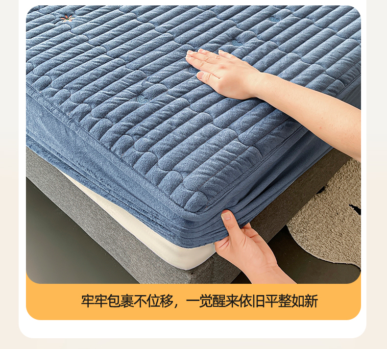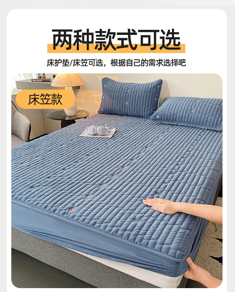 商品名称:2024新款A类纯色牛奶绒刺绣薄款床垫加厚绒保暖床笠床护垫 艾维-蓝(床褥款)