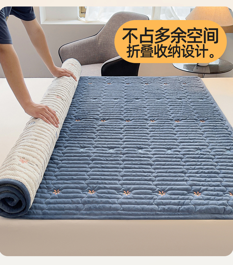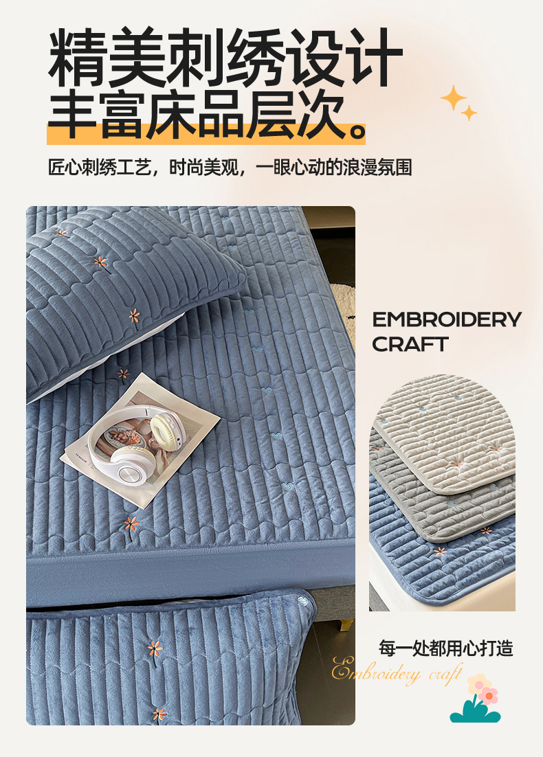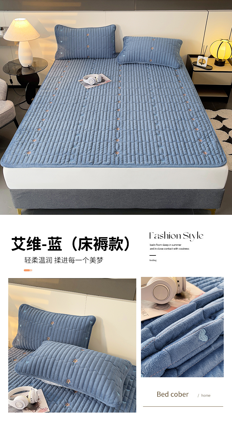 2024新款A类纯色牛奶绒刺绣薄款床垫加厚绒保暖床笠床护垫 艾维-蓝(床褥款)