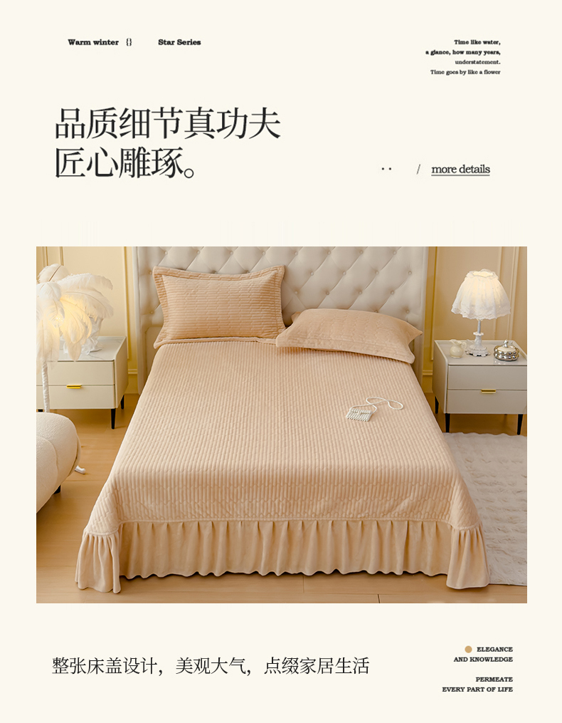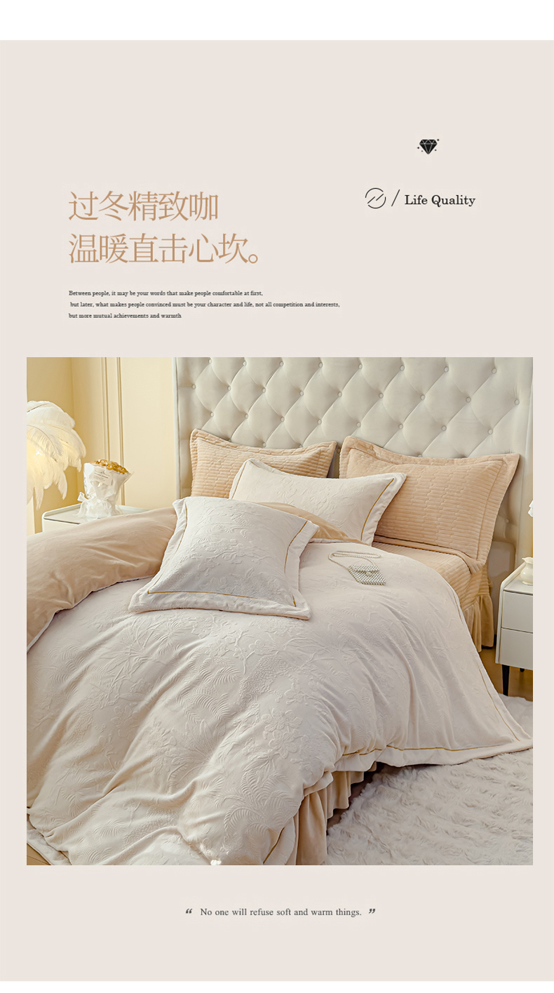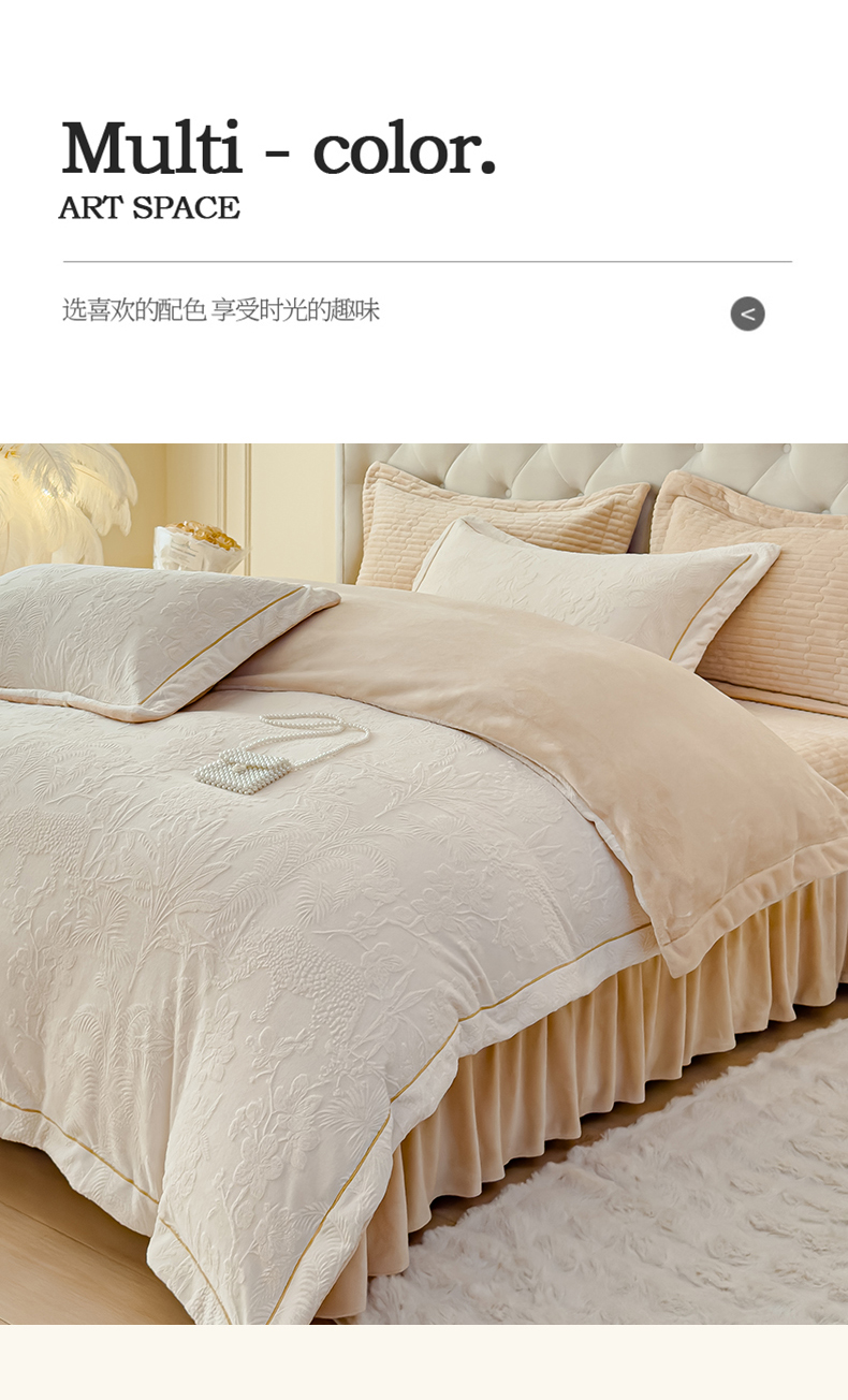 (总)2025新款纯色雕花全消光牛奶绒蕾丝绣花被套夹棉床裙 床盖款四件套(控价268),粉玉,米咖,天蓝,香芋紫,淡紫,豆纱色