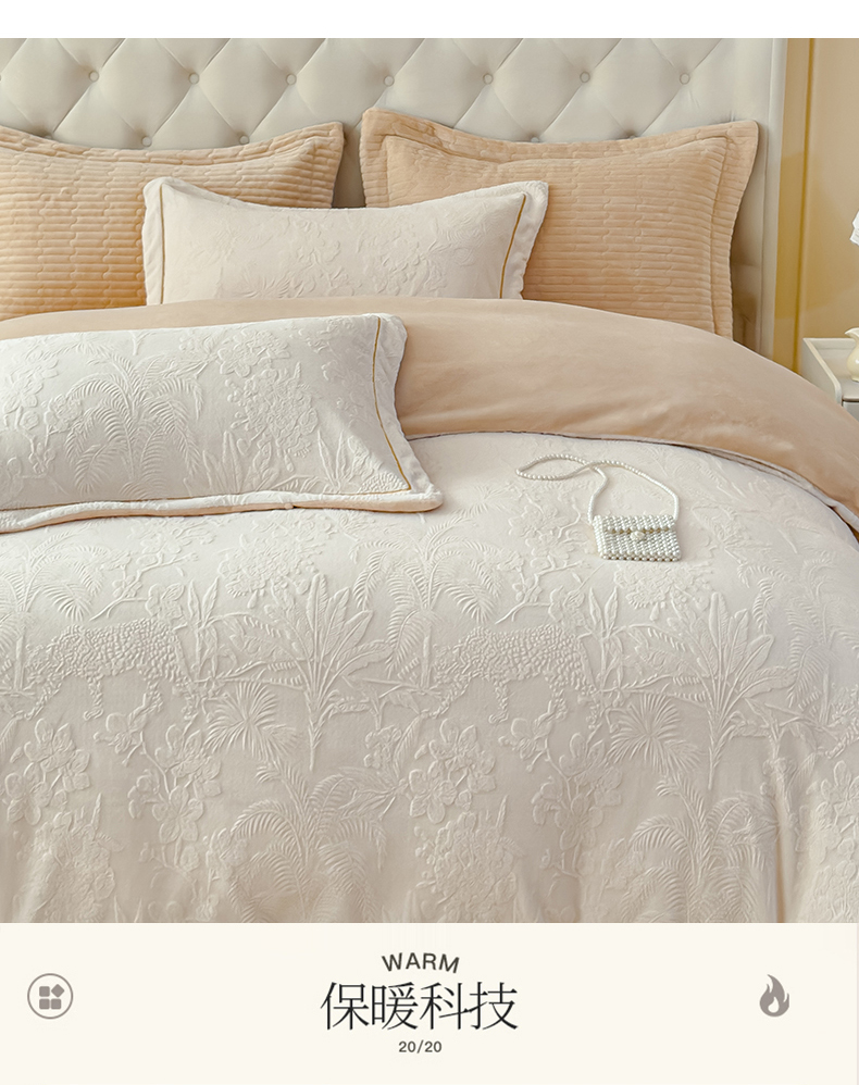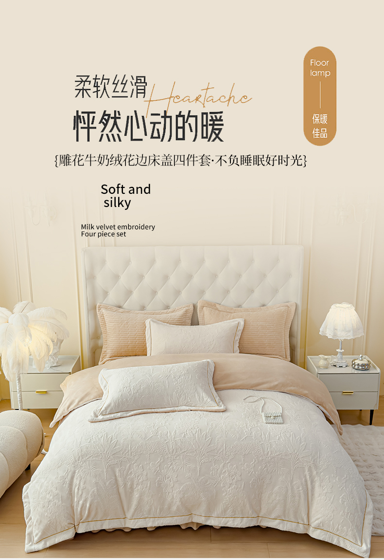 (总)木兰花 2025新款雕花全消光牛奶绒床盖款四件套-浪漫花语,浪漫花语-粉,浪漫花语-米色,浪漫花语-紫色