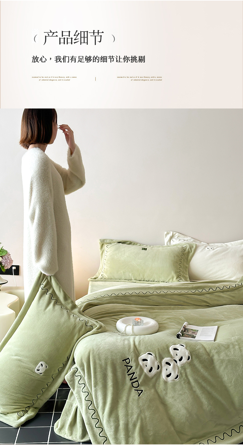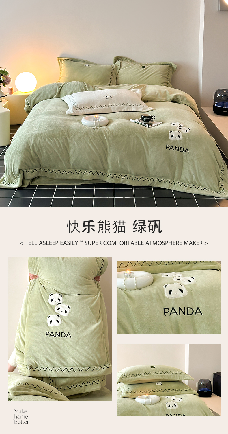 商品名称:名品优仓 2024新款高克重牛奶绒刺绣四件套-快乐熊猫 快乐熊猫 绿矾