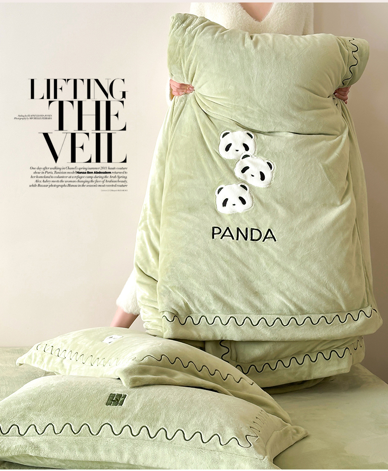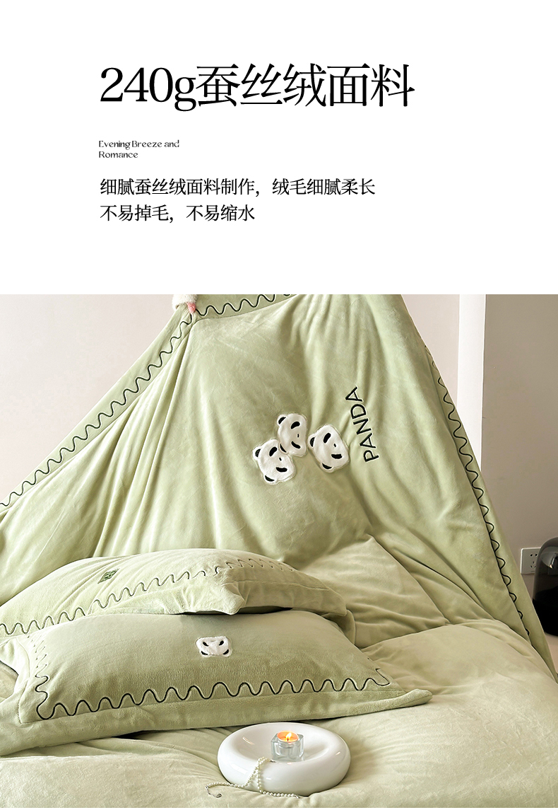 名品优仓 2024新款高克重牛奶绒刺绣四件套-快乐熊猫 快乐熊猫 绿矾