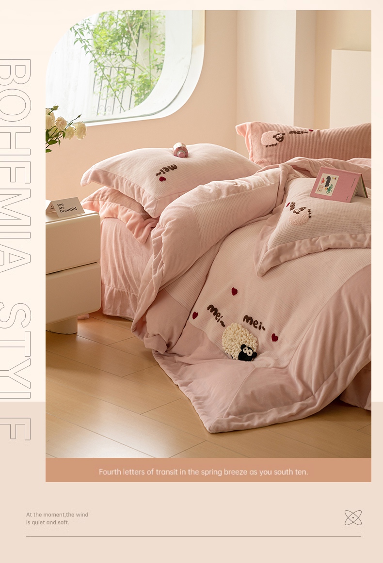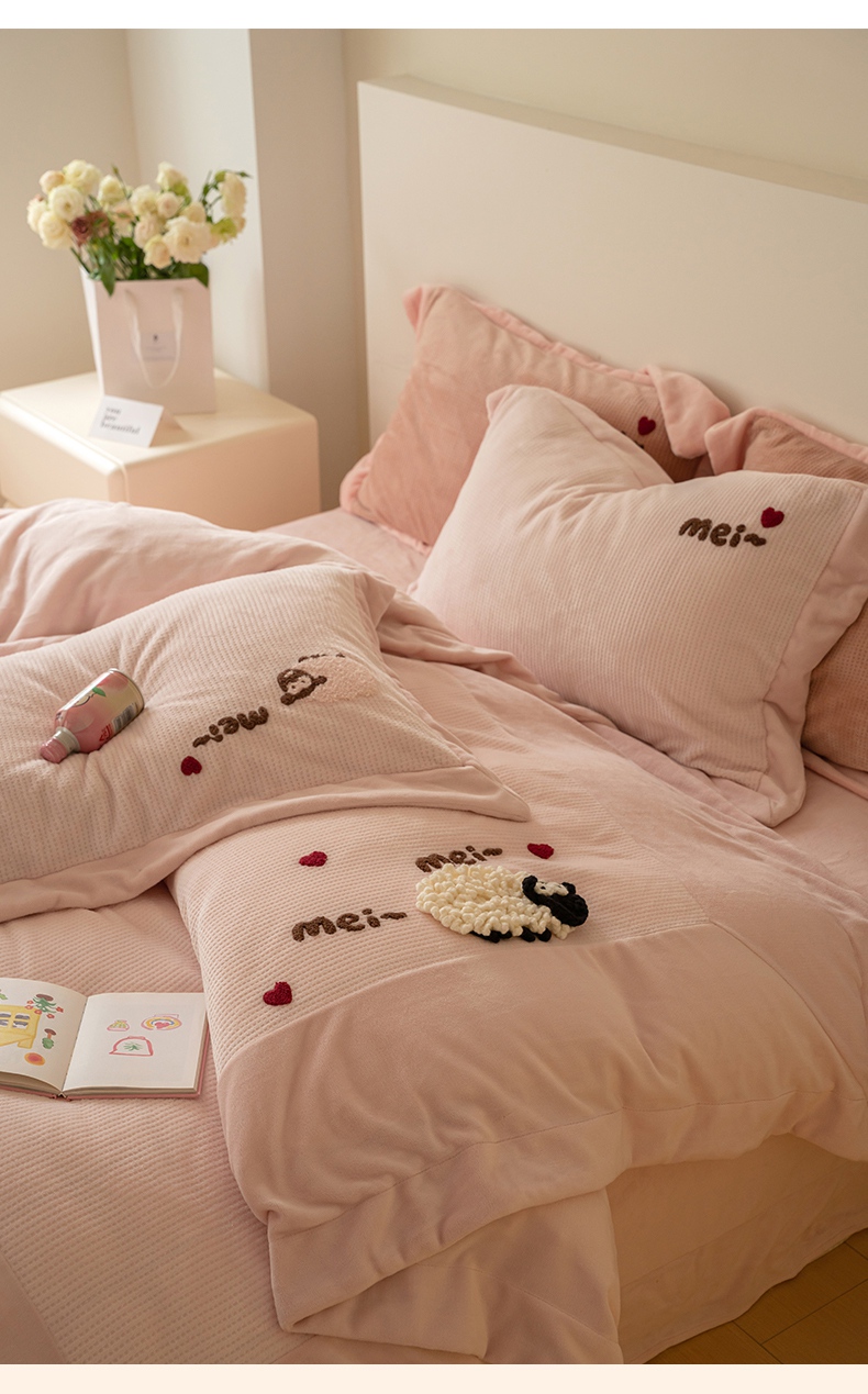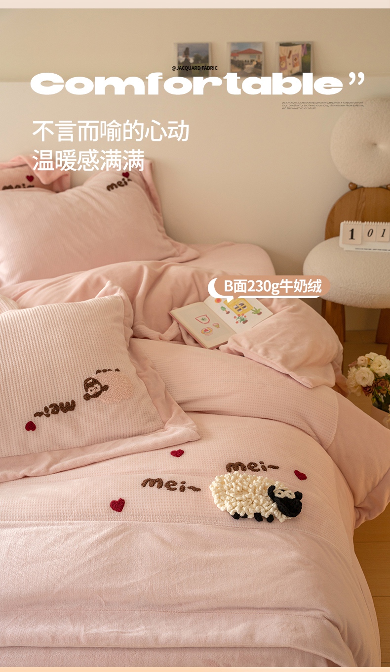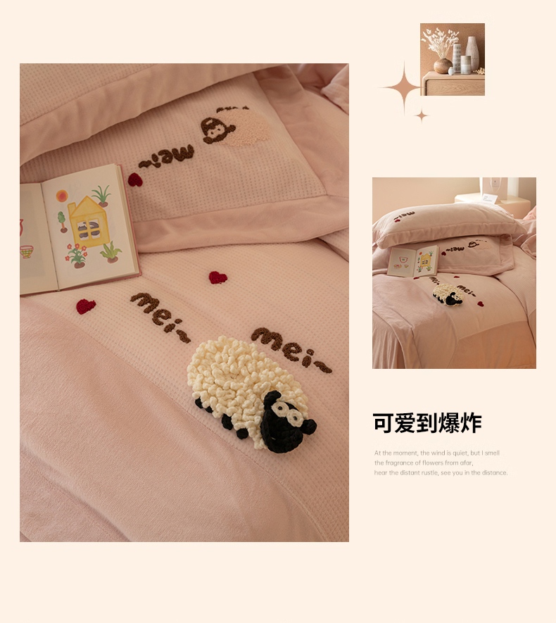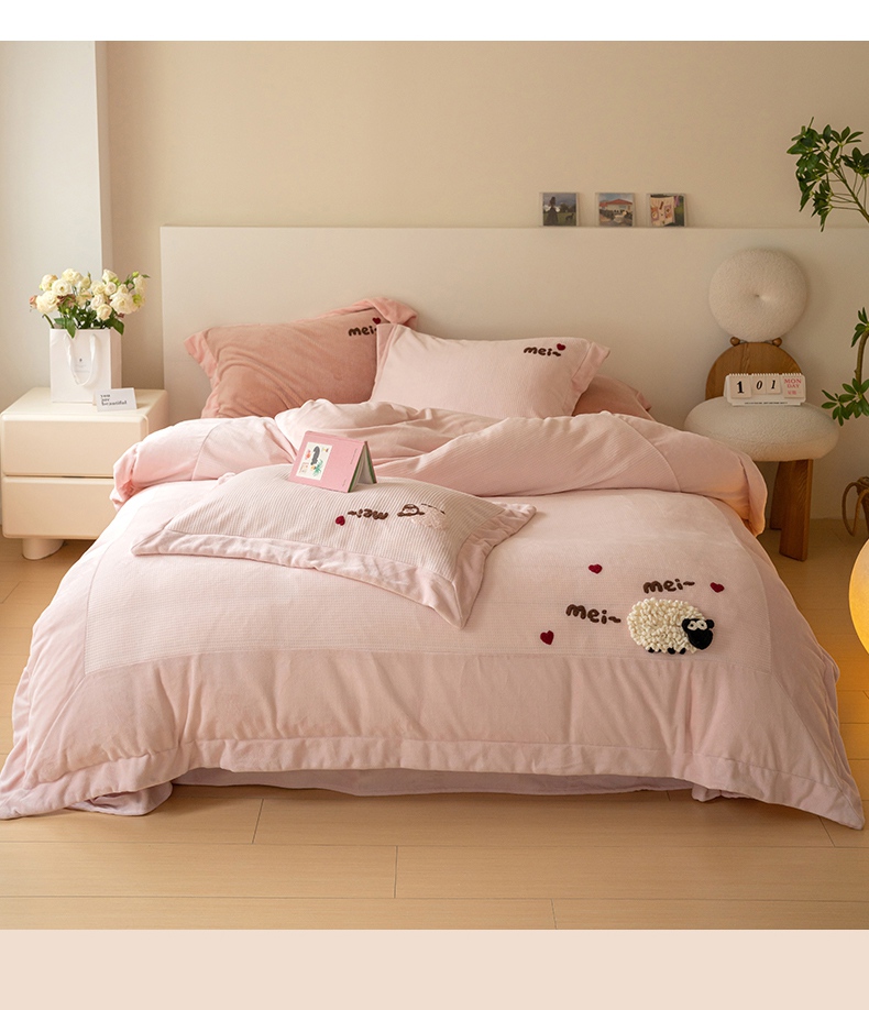 商品名称:名品优仓 2024新款华夫格牛奶绒毛巾绣四件套-喜洋洋 喜洋洋 萝莉粉