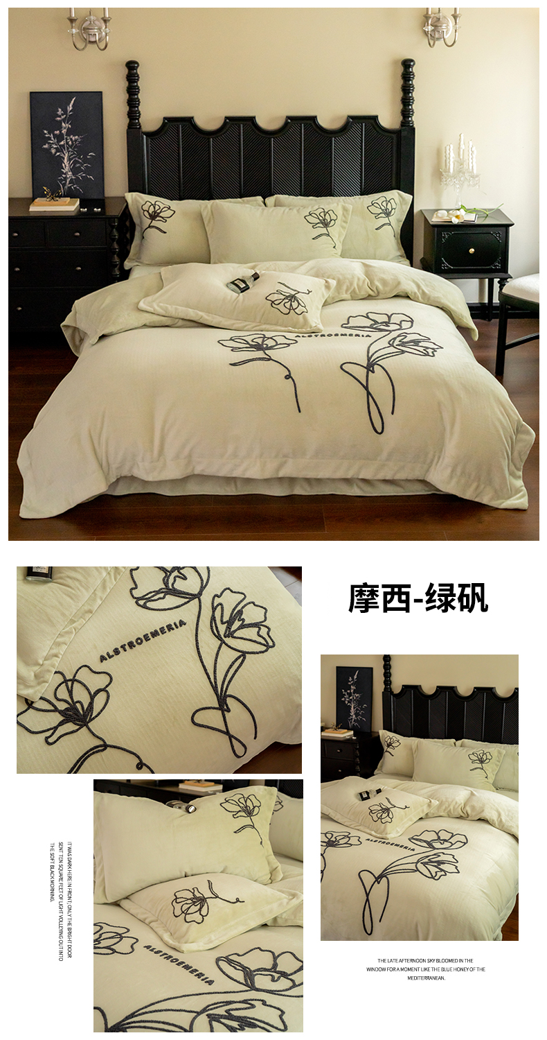 商品名称:名品优仓 2024新款牛奶绒毛巾绣花四件套-摩西 摩西-春山杏