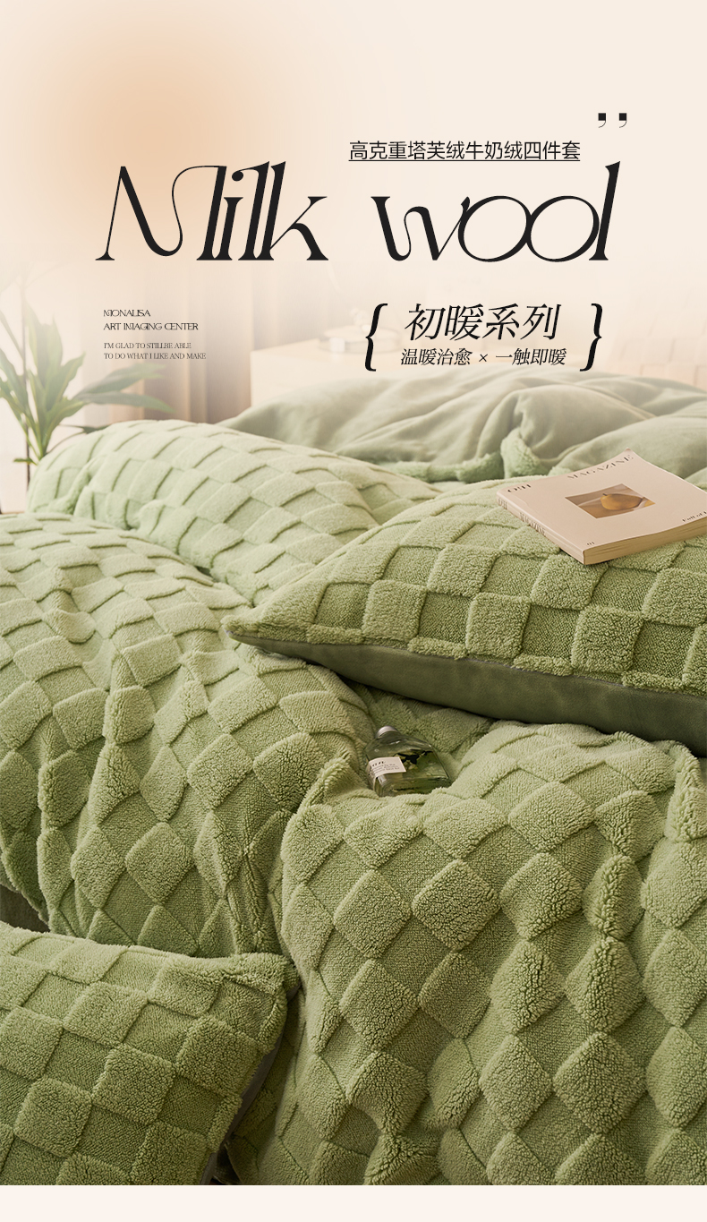 • 91家纺网 家纺一手货源 找家纺 晨曦家纺 2024塔芙绒牛奶绒单被套-初暖系列 初暖-果绿