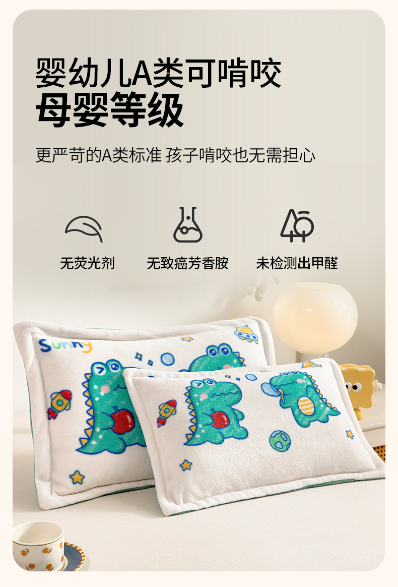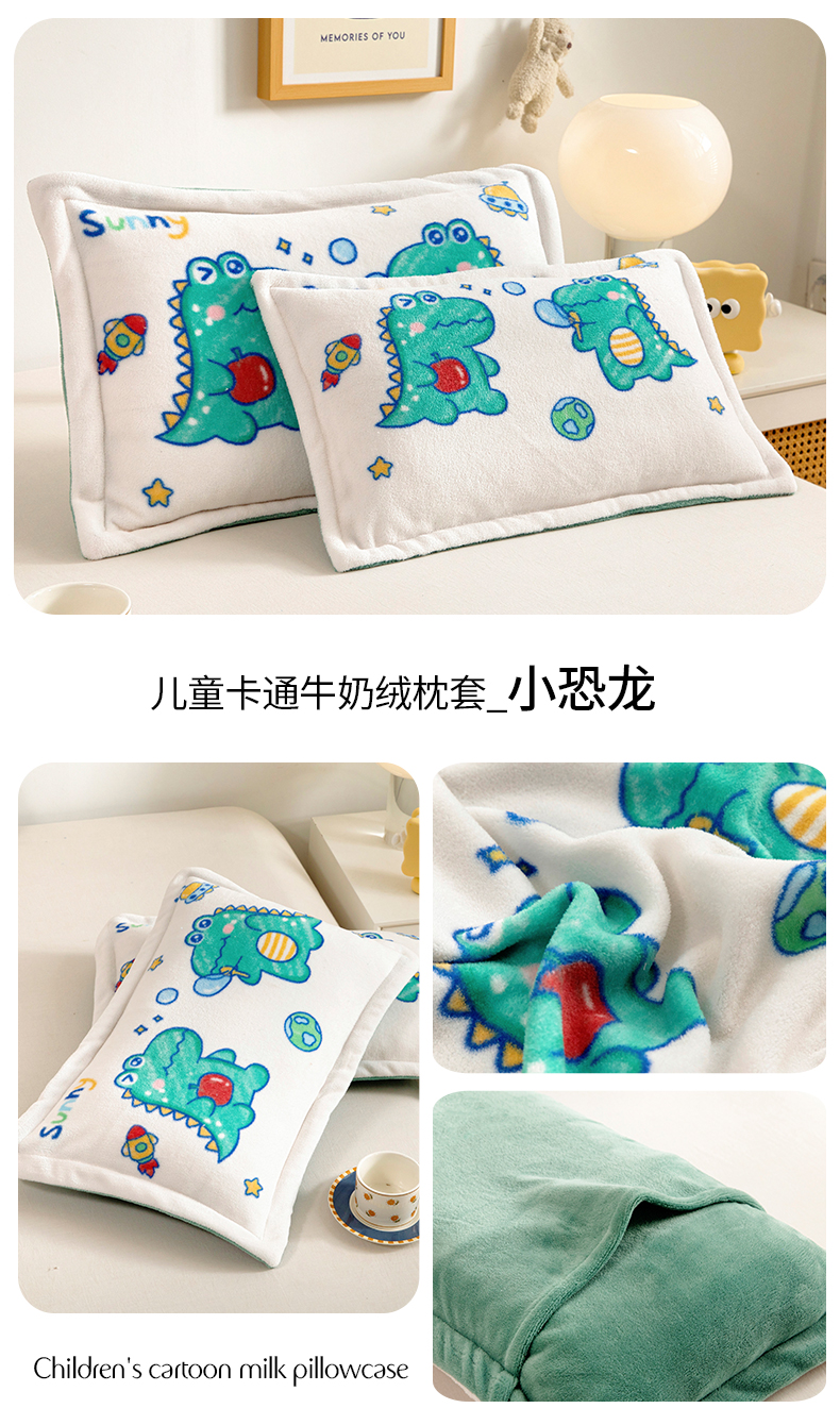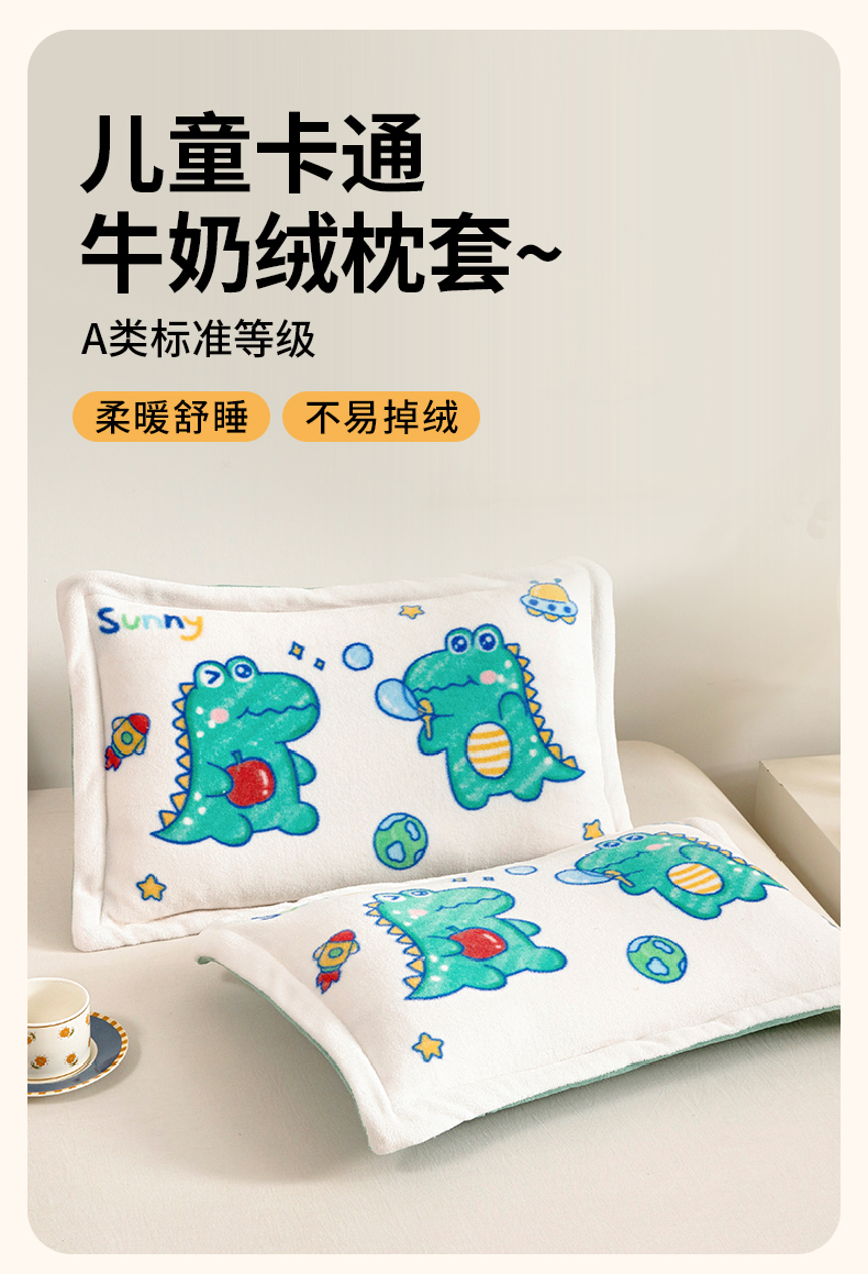 吉咪兔家纺 25年新款大版定位图案儿童卡通牛奶绒枕套加厚秋冬季宝宝枕头套幼儿园枕芯套 小恐龙