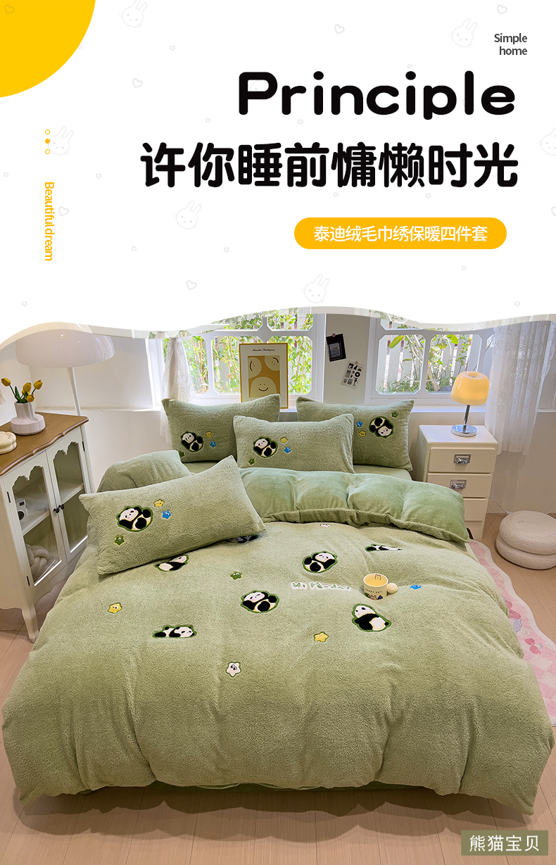 金爱家 2024新款220g加厚防静电泰迪绒牛奶绒刺绣四件套 泰迪绒-熊猫宝贝