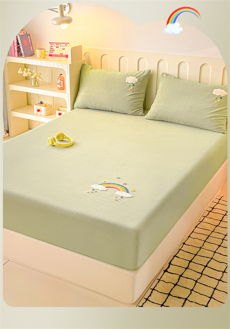 布卢姆床垫 2025新款A类牛奶绒毛巾绣床笠 彩虹云朵-抹茶绿