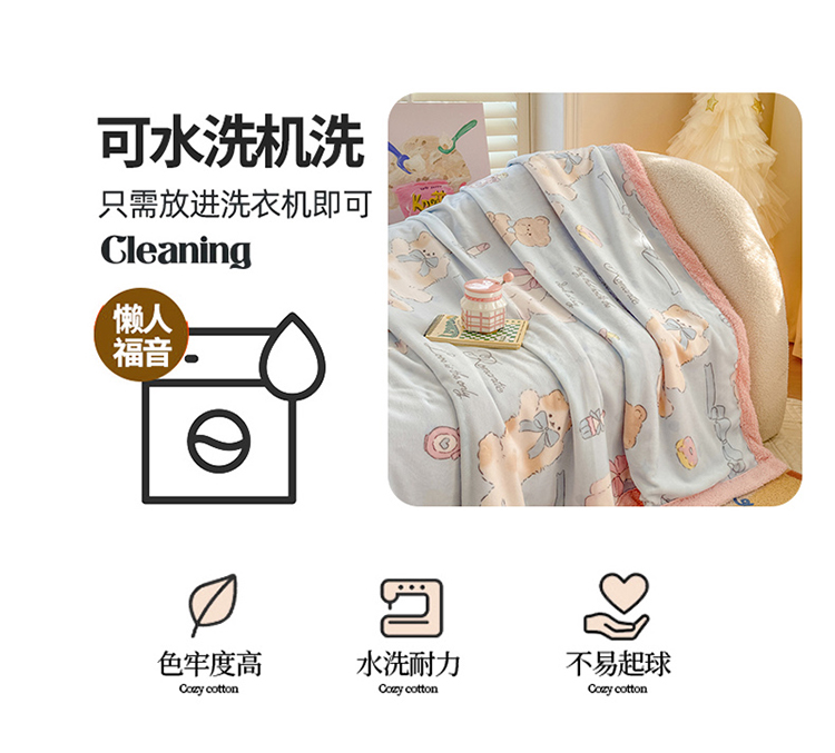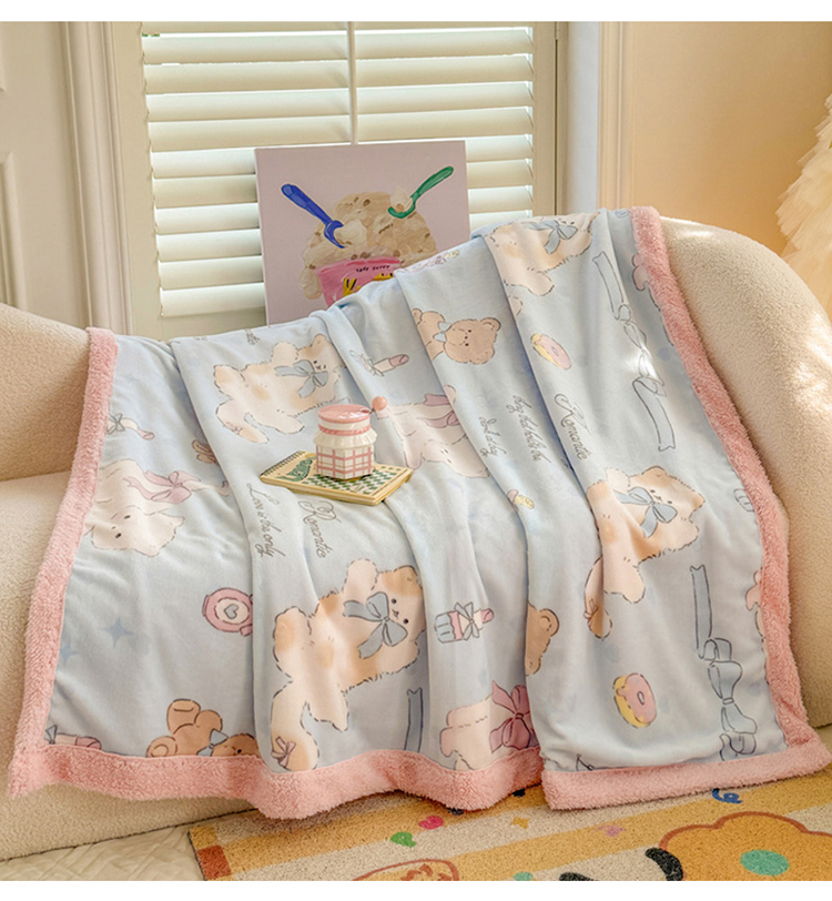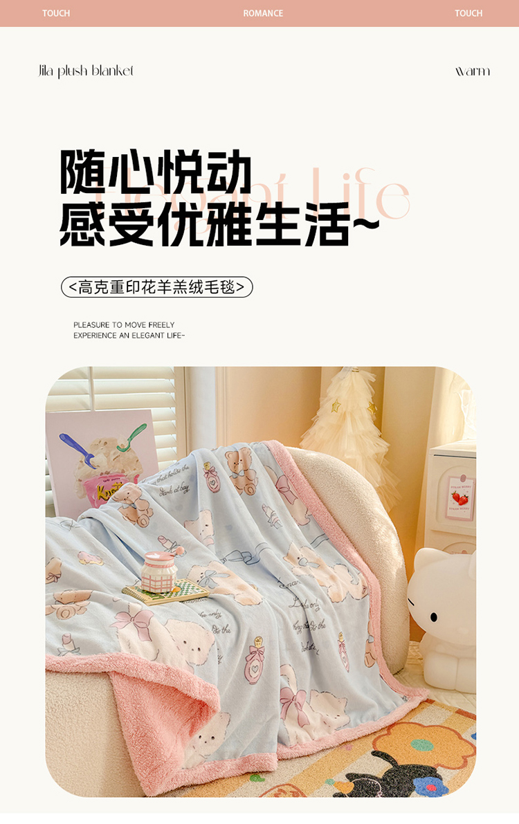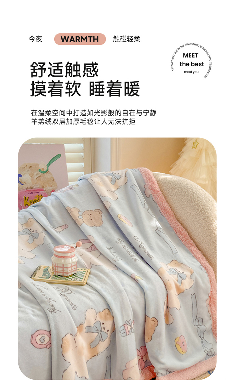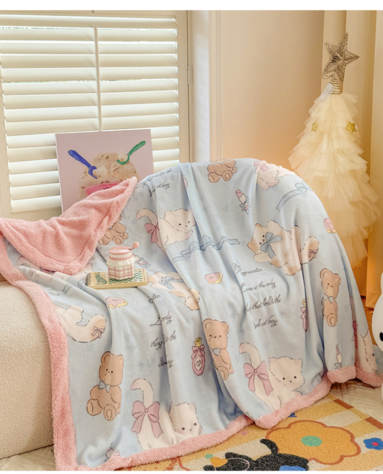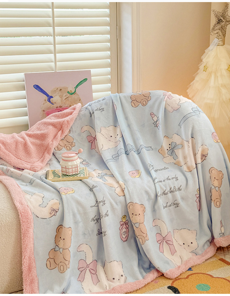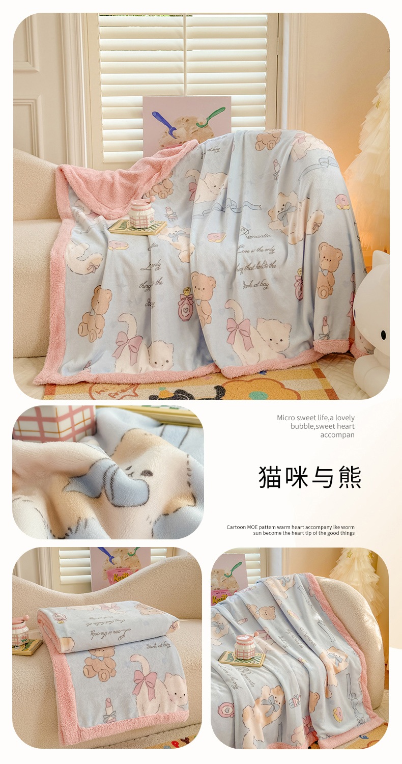 眷恋家纺 2024新款高克重牛奶绒印花羊羔绒毛毯毯子 猫咪与熊