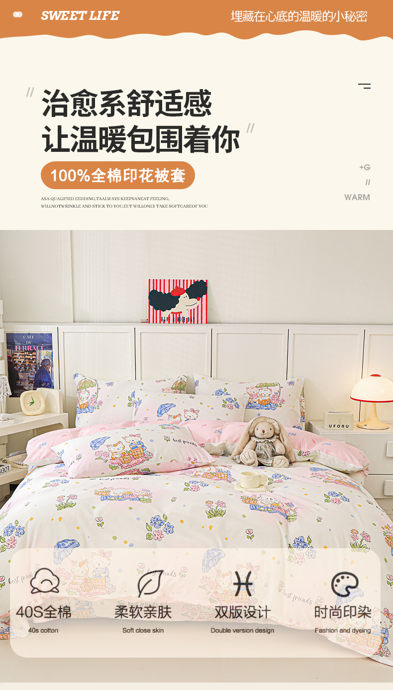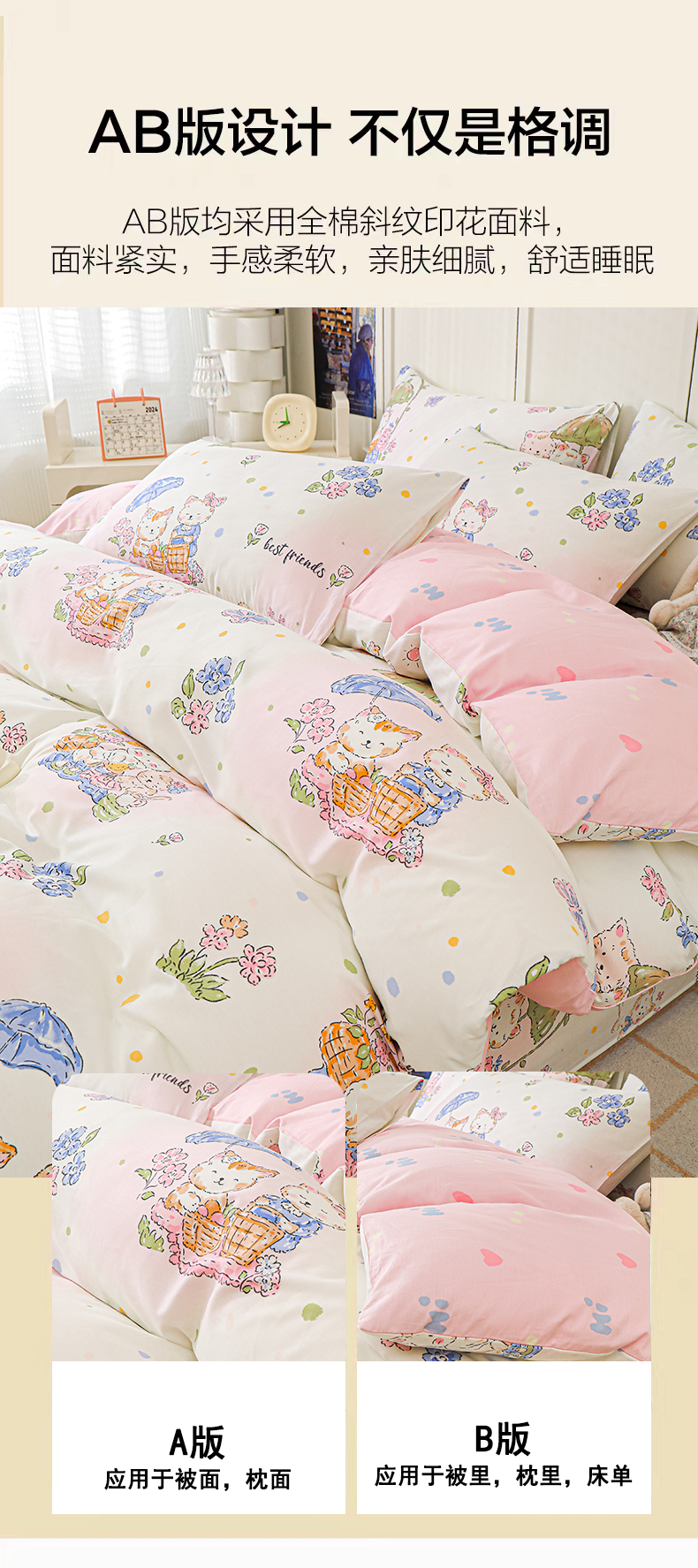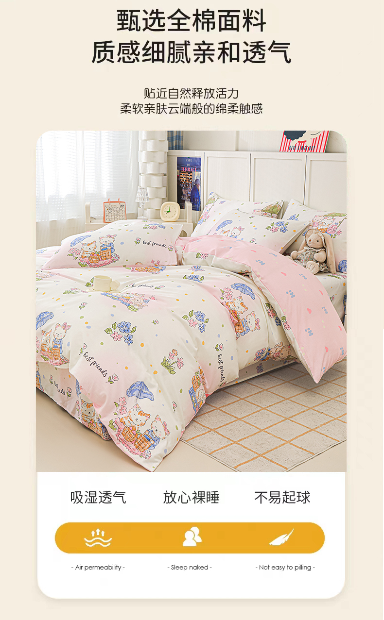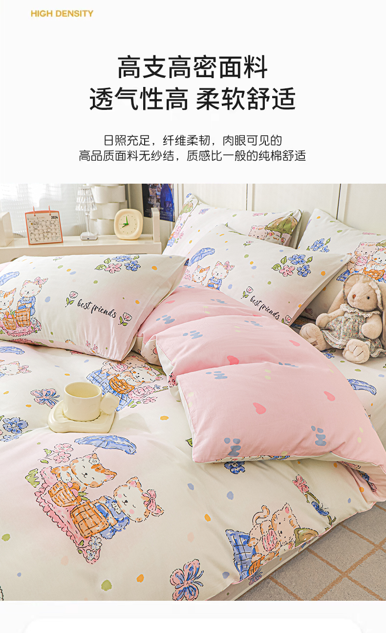 商品名称:金鑫汇家纺 2025新款全棉印花单被套 喵喵日记