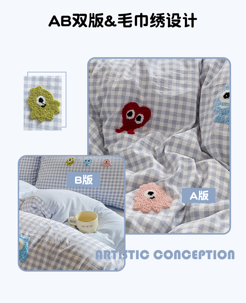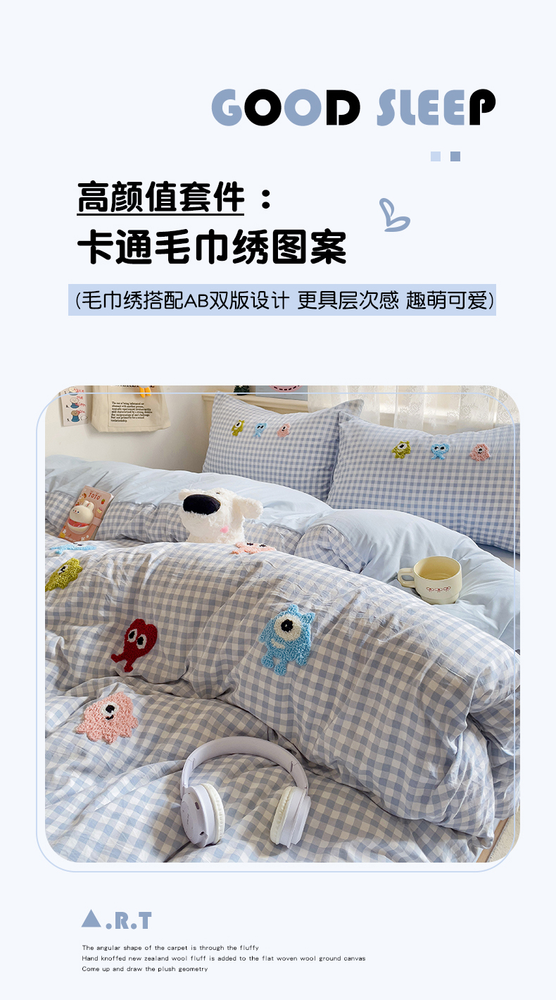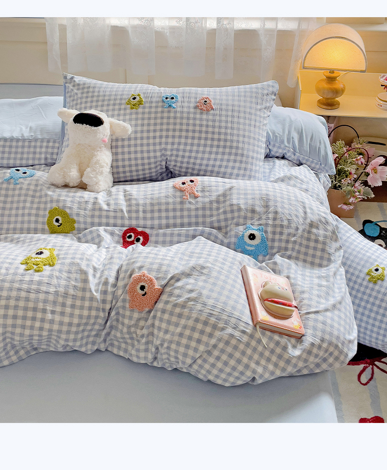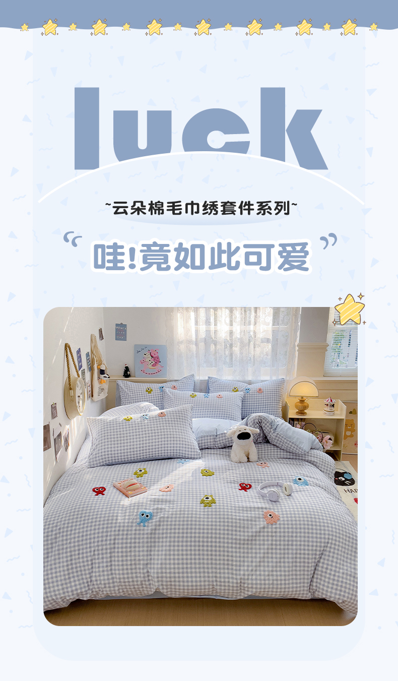 当前位置: 91家纺网 > 商品网购 > 床品套件 > 四件套 > 其它四件套 > 梦之岛 2025新款多巴胺ins云朵棉小怪兽可爱毛巾绣四件套 格子小怪兽-蓝