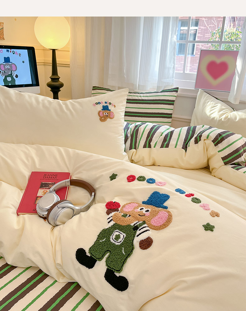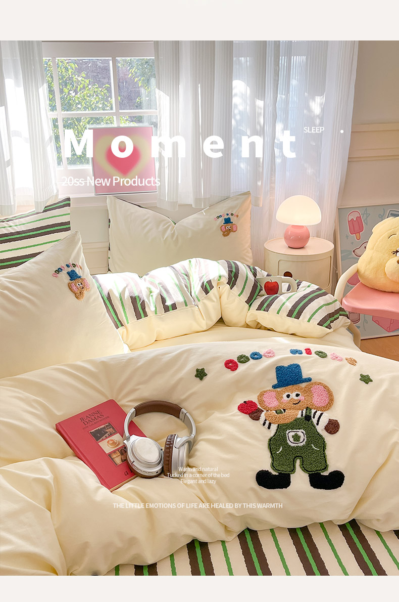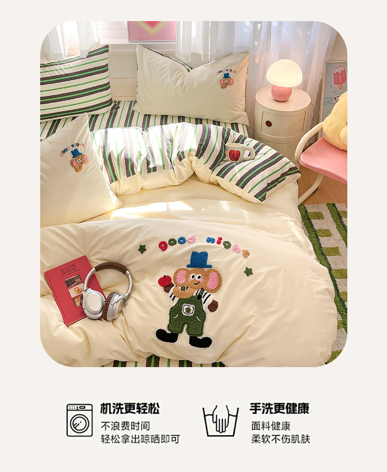 (总)泽西家纺 2024新款可爱卡通风全棉水洗棉四件套毛巾绣大拼角四件套,吉吉酱,福象,奶香泡芙,米兰龙,娜塔莉,伲莱奥,跳跳兔,摩卡乐园,童话镇,歪头鸭,星星梨,一家四口,奇妙物语