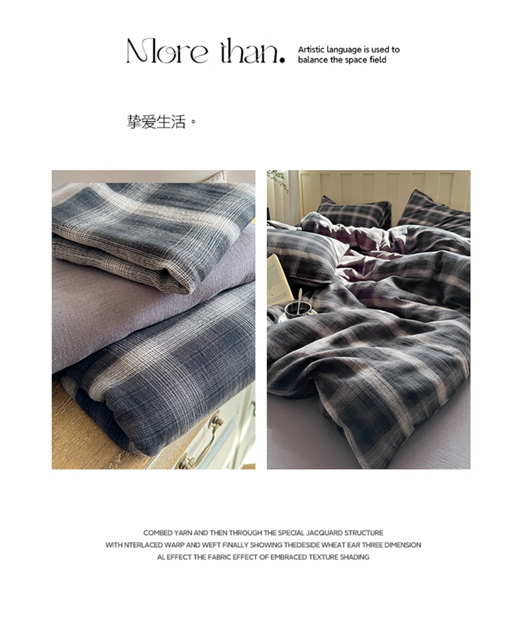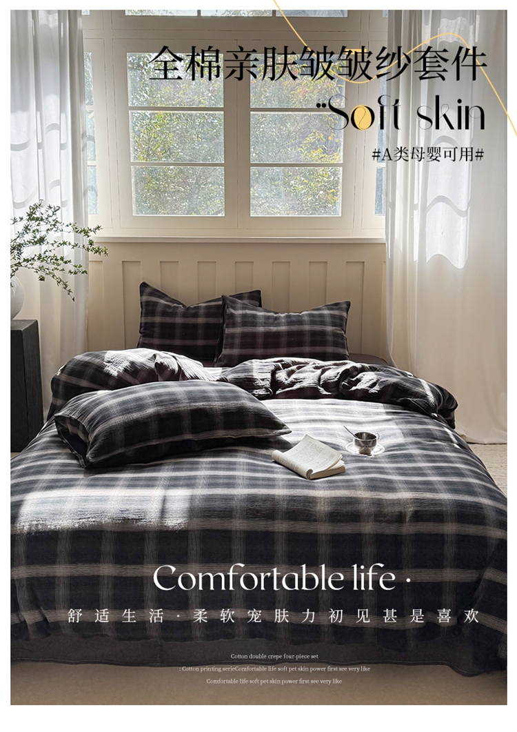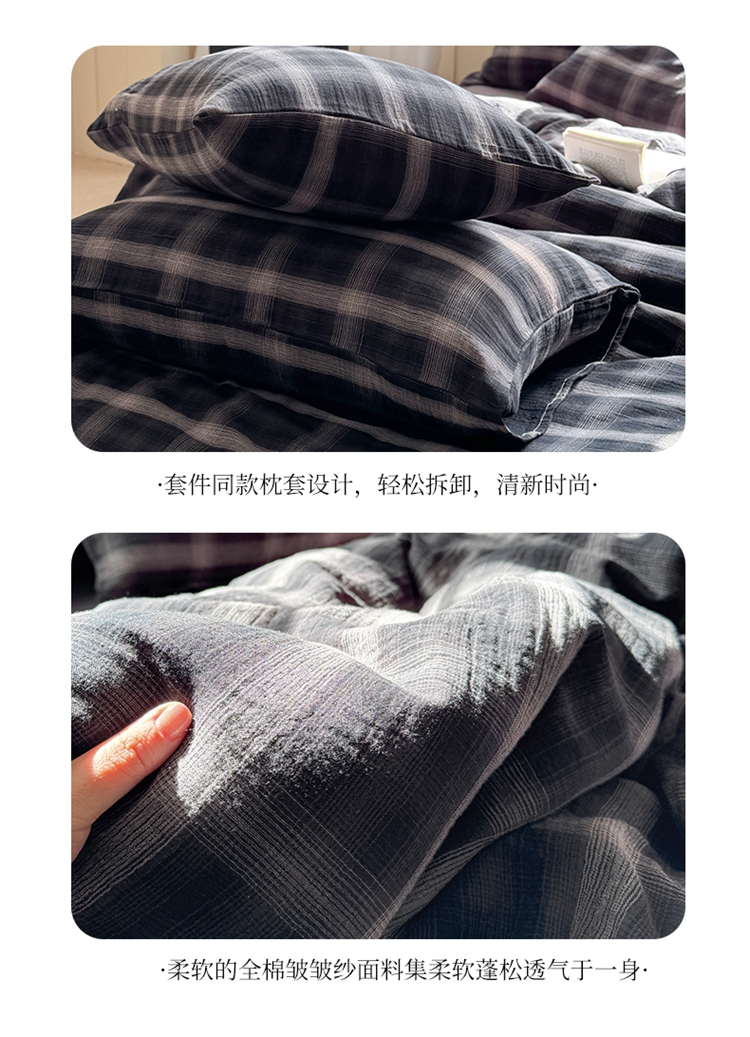 商品名称:萝莉家纺 2025新款复古全棉A类色织双层纱皱皱纱格子四件套 黑大格