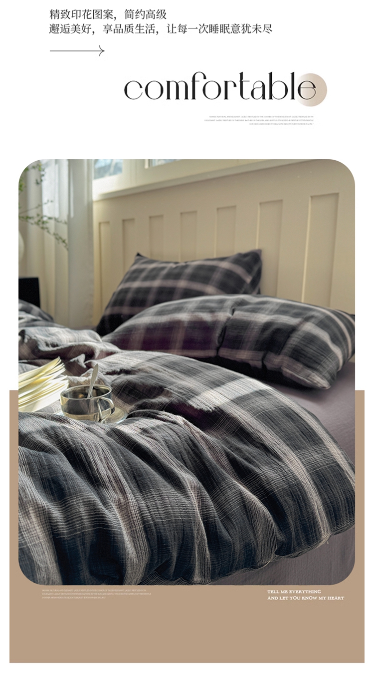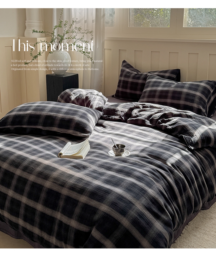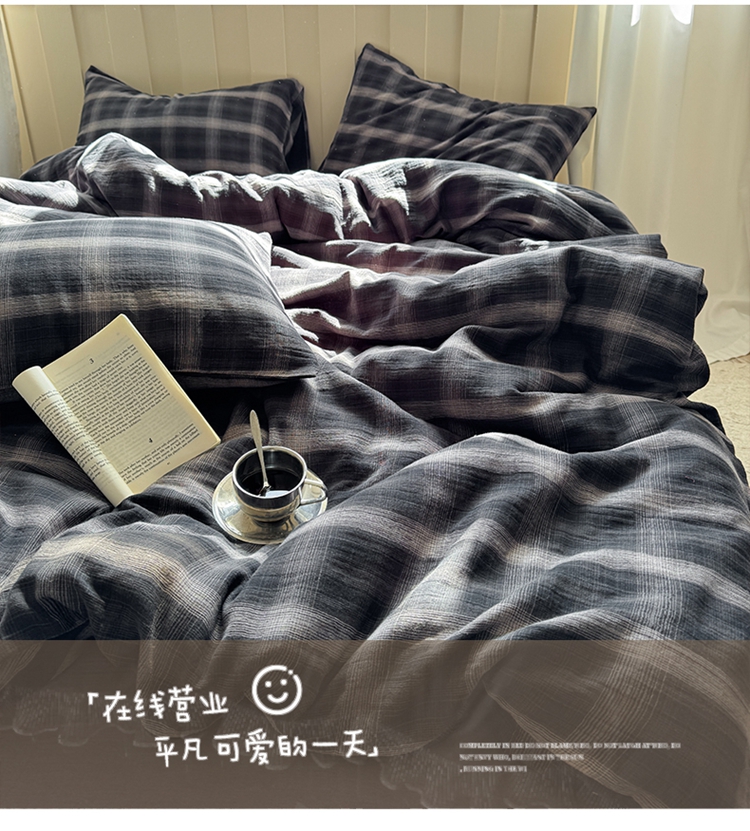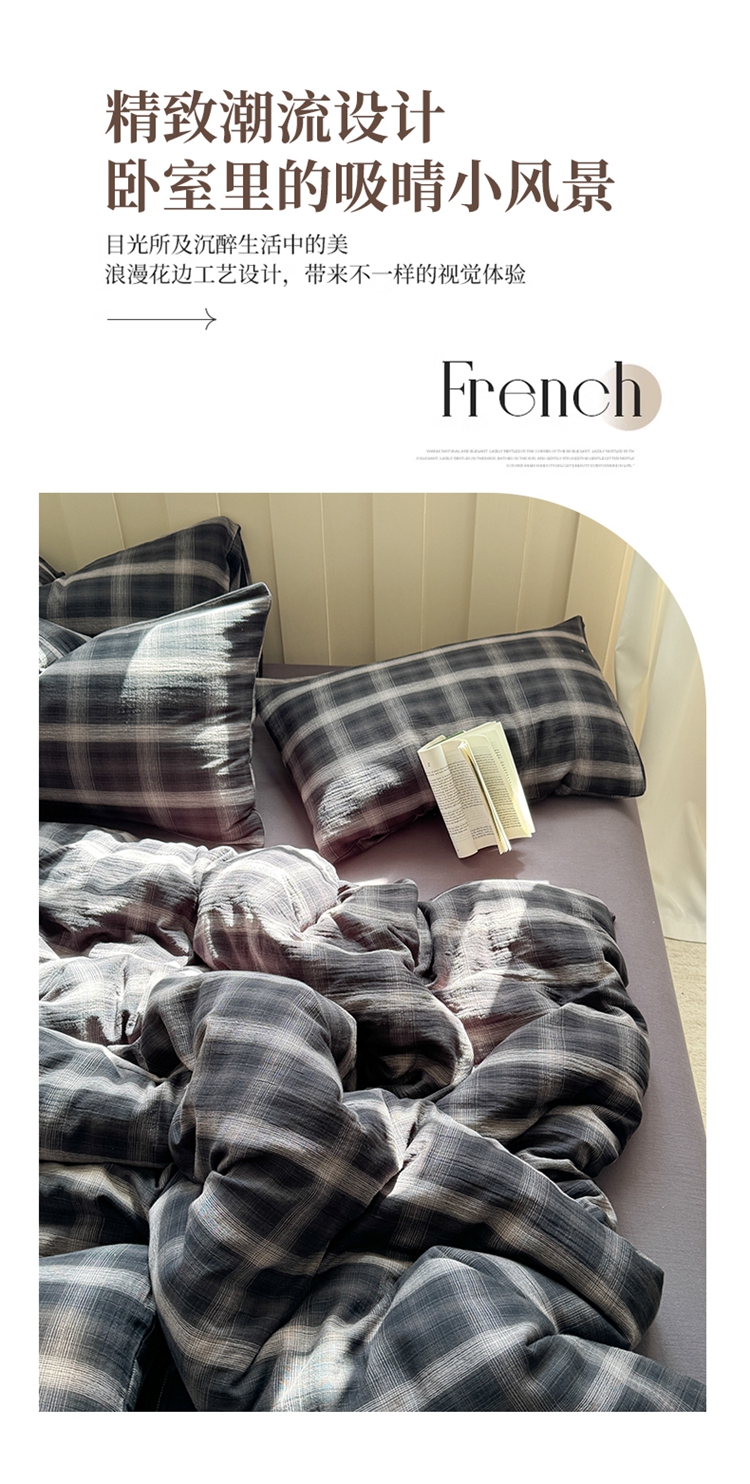 萝莉家纺 2025新款复古全棉A类色织双层纱皱皱纱格子四件套 黑大格