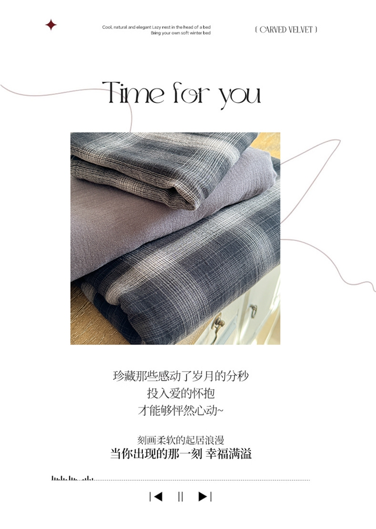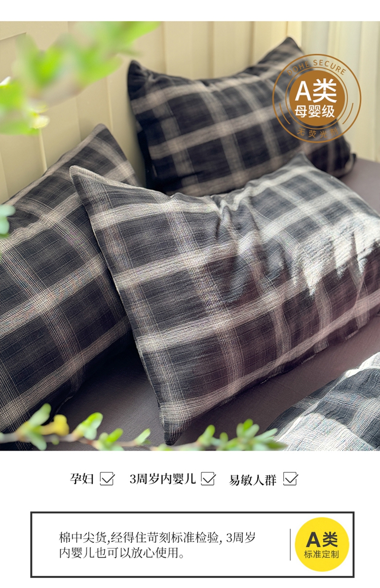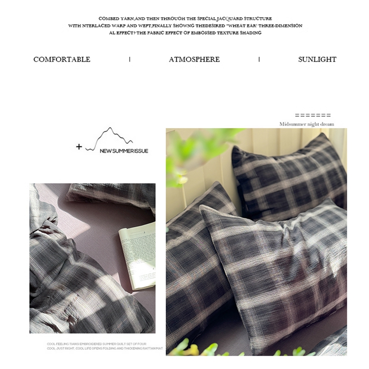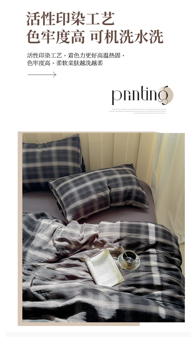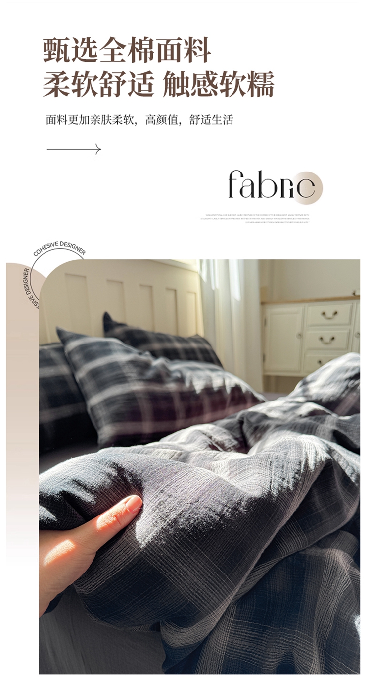 萝莉家纺 2025新款复古全棉A类色织双层纱皱皱纱格子四件套 黑大格