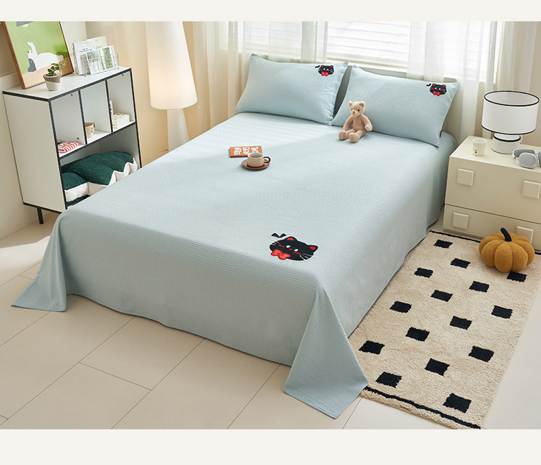 寐绸家纺 2025新款纯棉华夫格毛巾绣单床单 绣花华夫格床单-天蓝