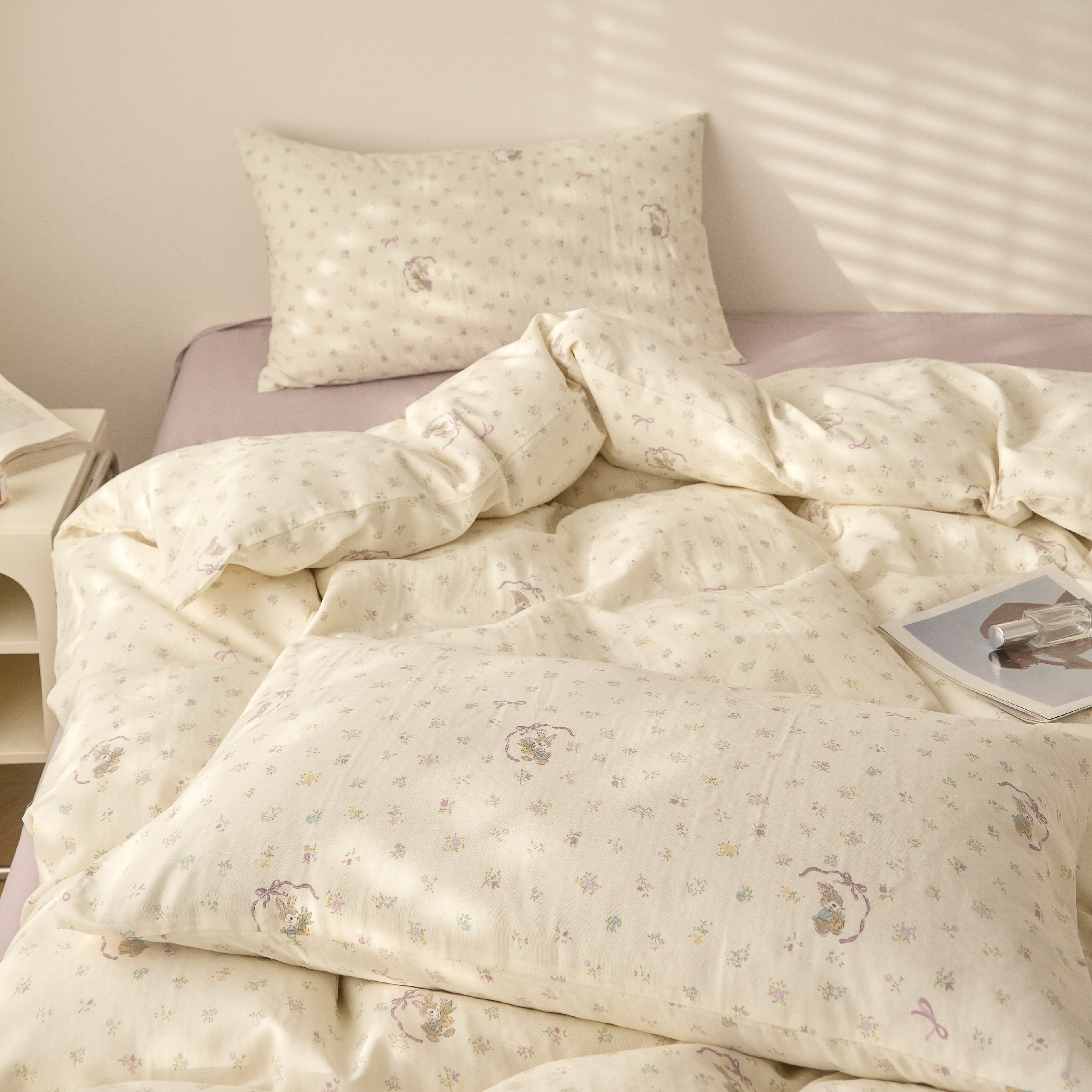 商品名称:嘉汀兰家居 2025新款圆角花边款全棉纯棉A类母婴级有氧全棉双层纱亲肤全棉小清新印花四件套 月亮兔兔
