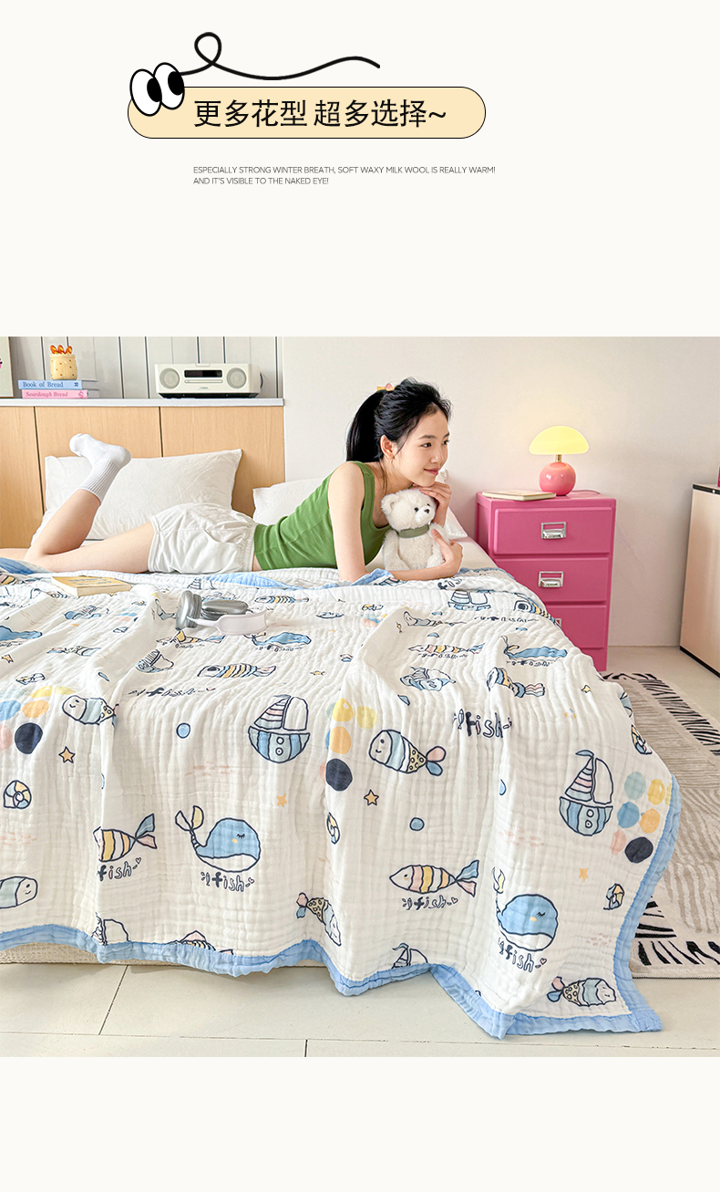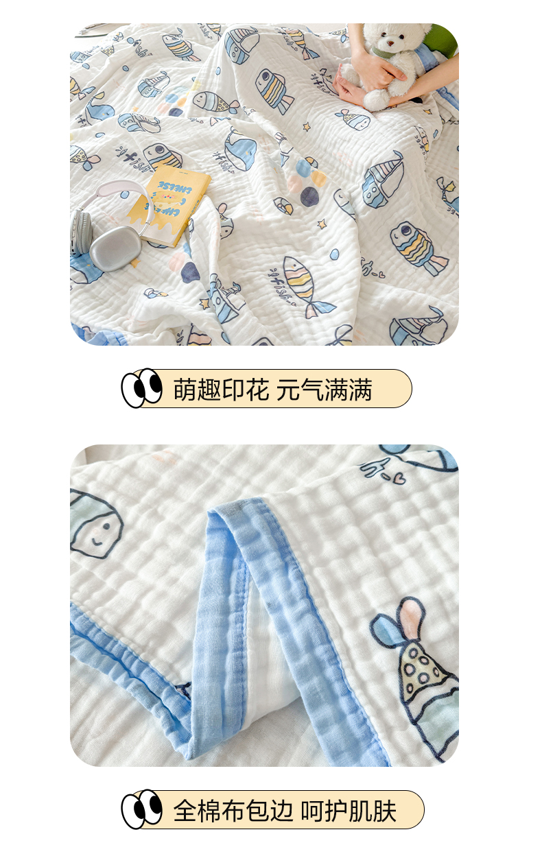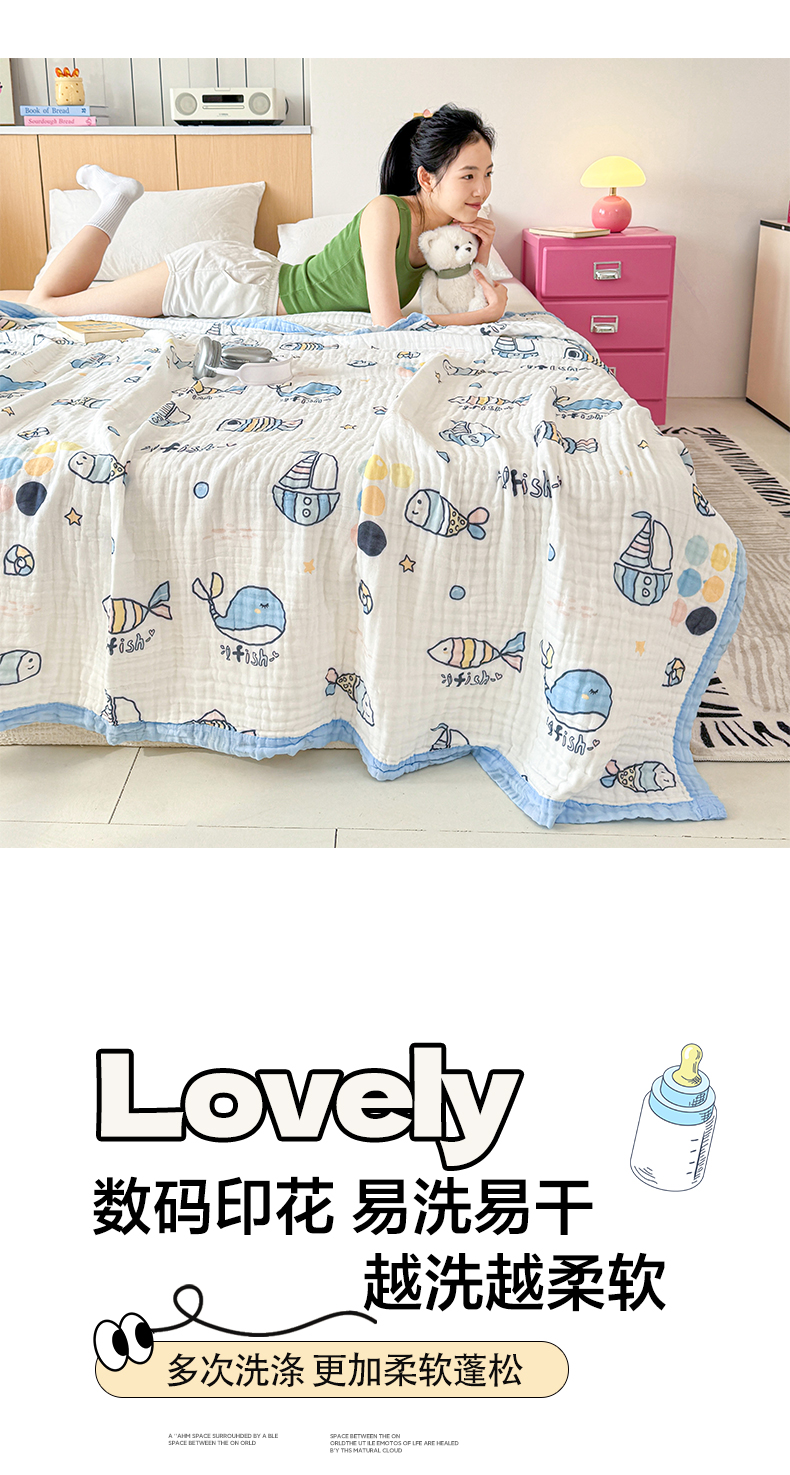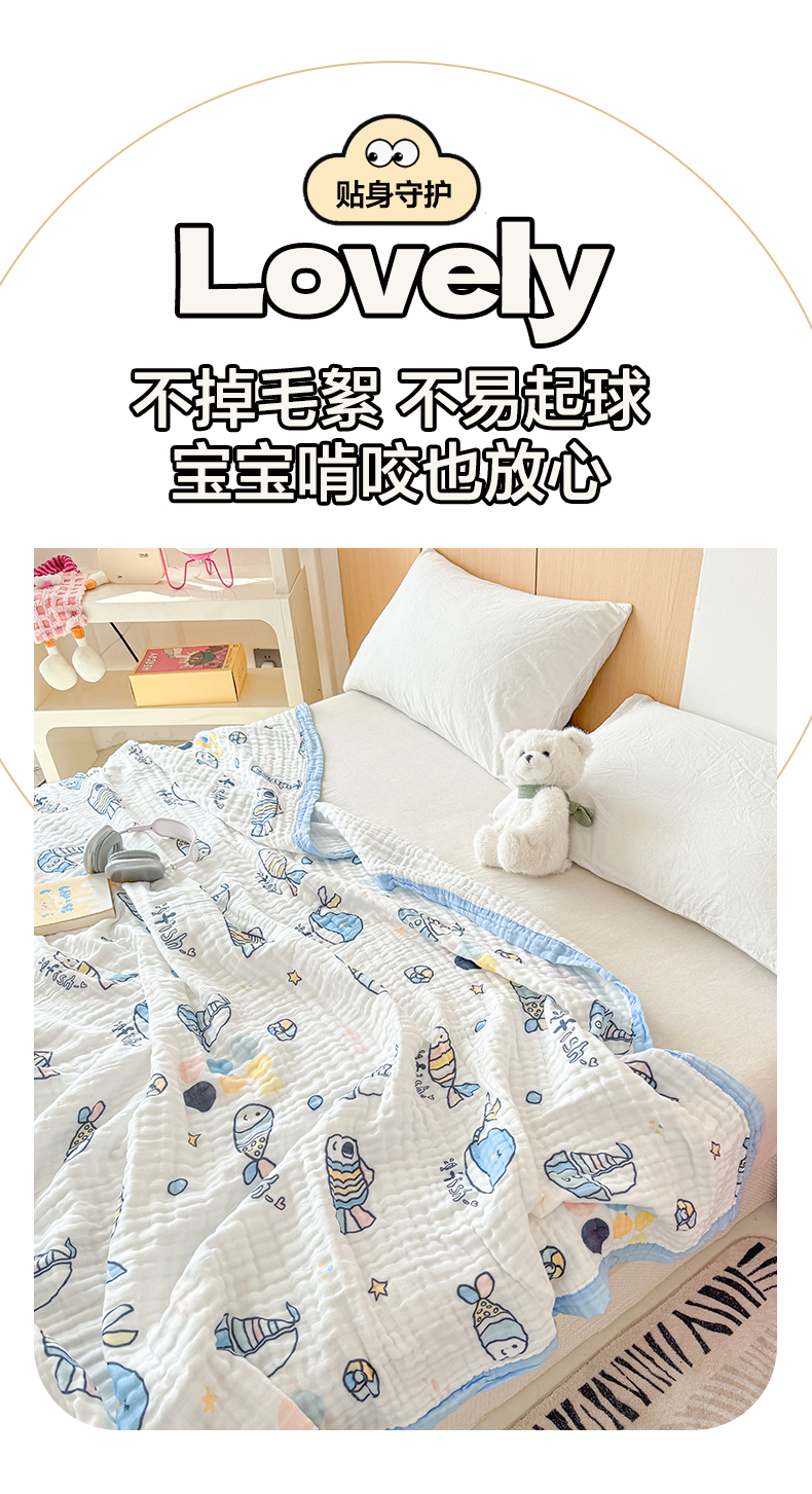 棠薇家纺 2025新款全棉六层皱皱纱婴幼毯泡泡纱印花盖毯包被浴巾 鲸鱼