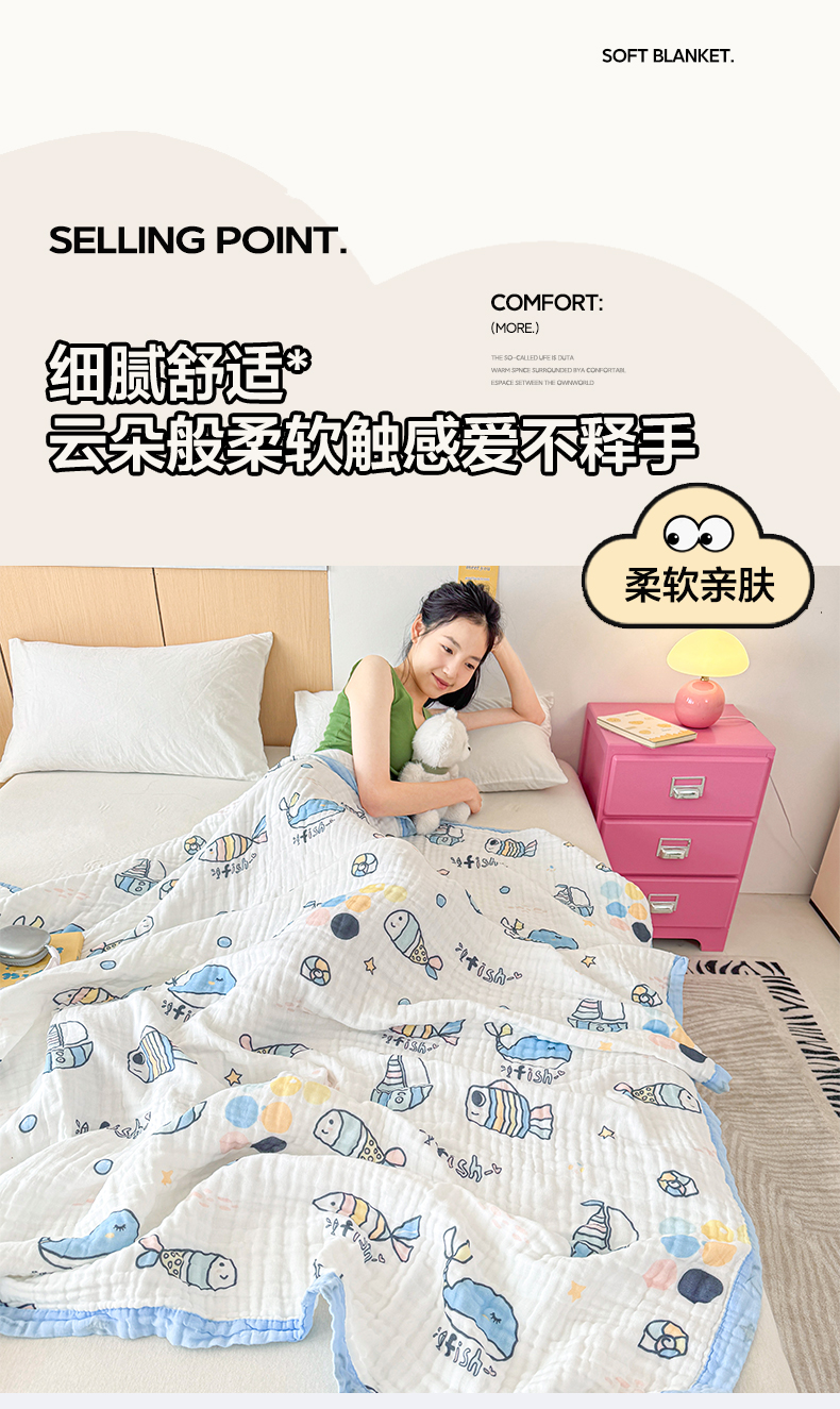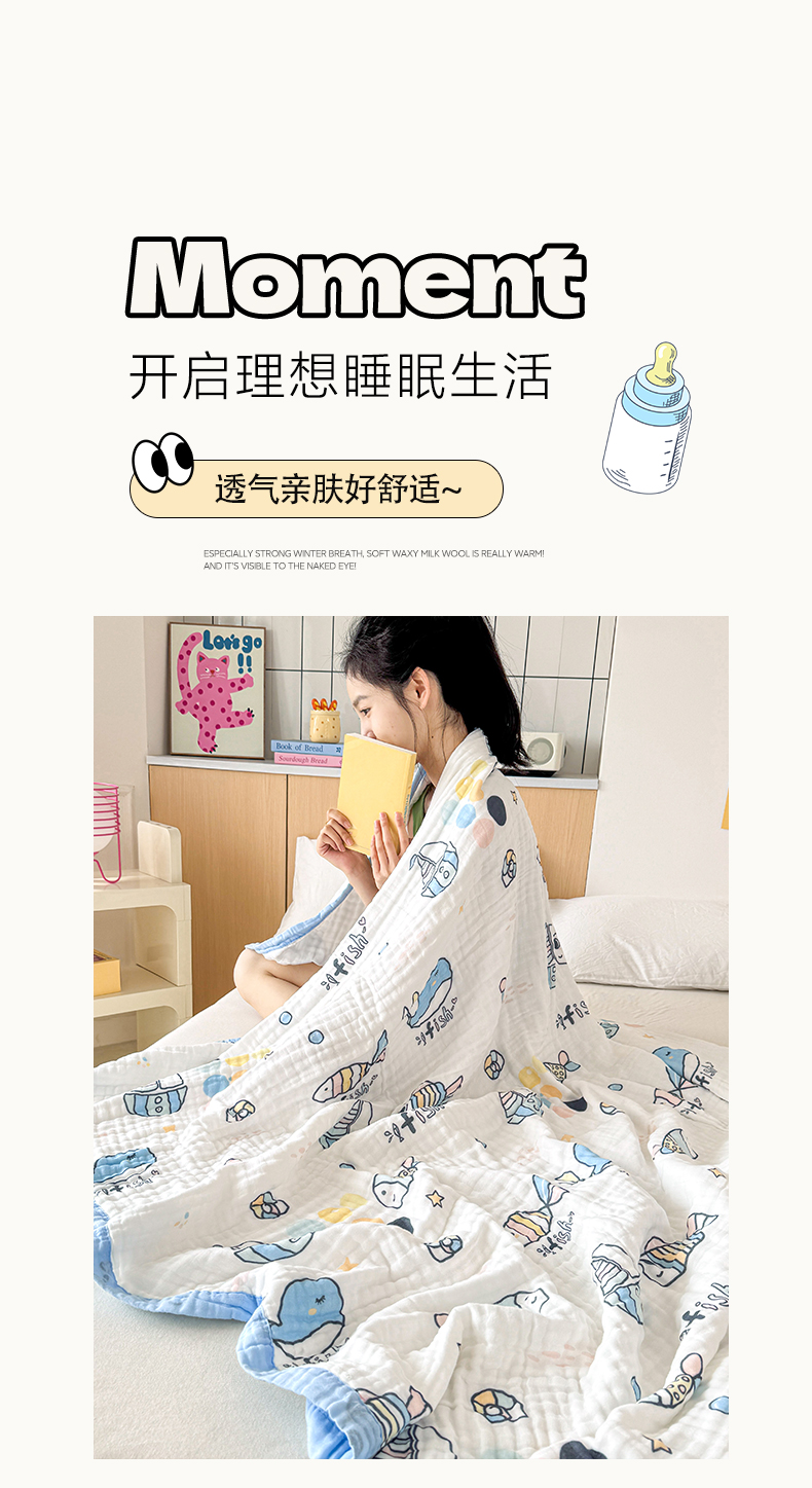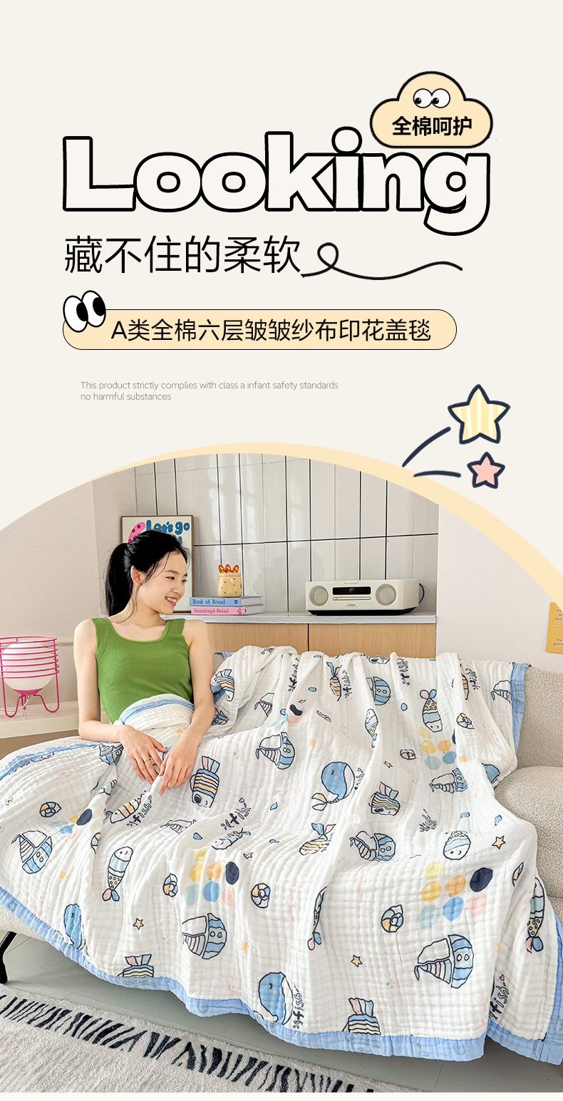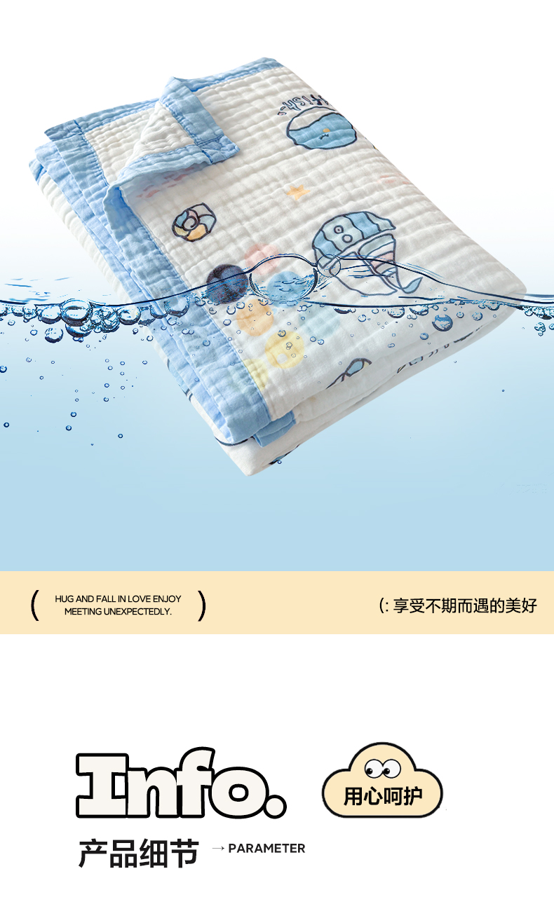 棠薇家纺 2025新款全棉六层皱皱纱婴幼毯泡泡纱印花盖毯包被浴巾 鲸鱼