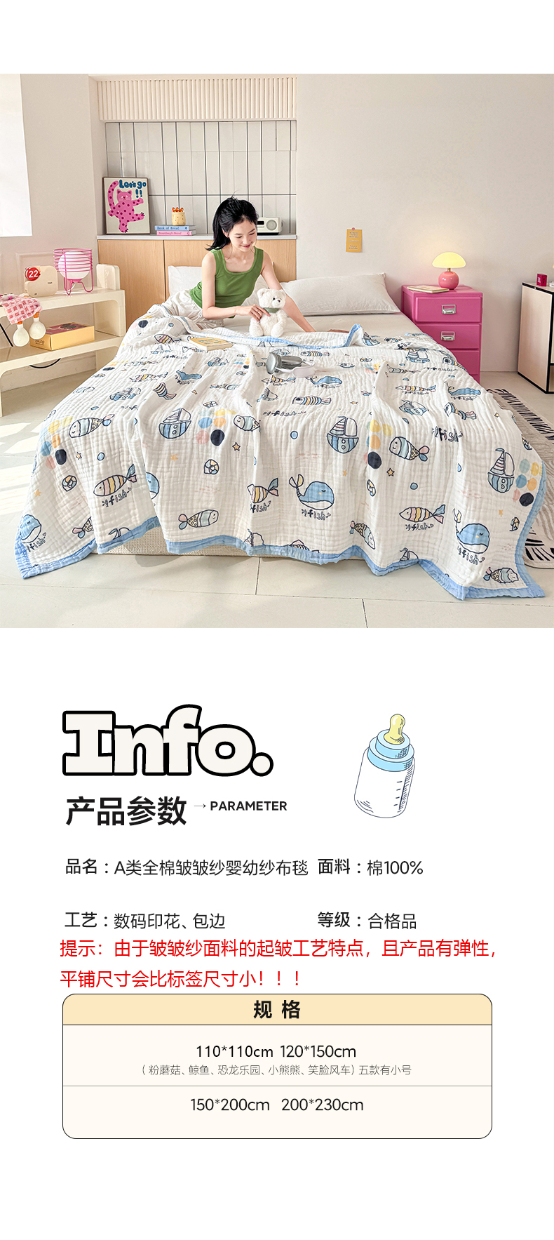 商品名称:棠薇家纺 2025新款全棉六层皱皱纱婴幼毯泡泡纱印花盖毯包被浴巾 鲸鱼