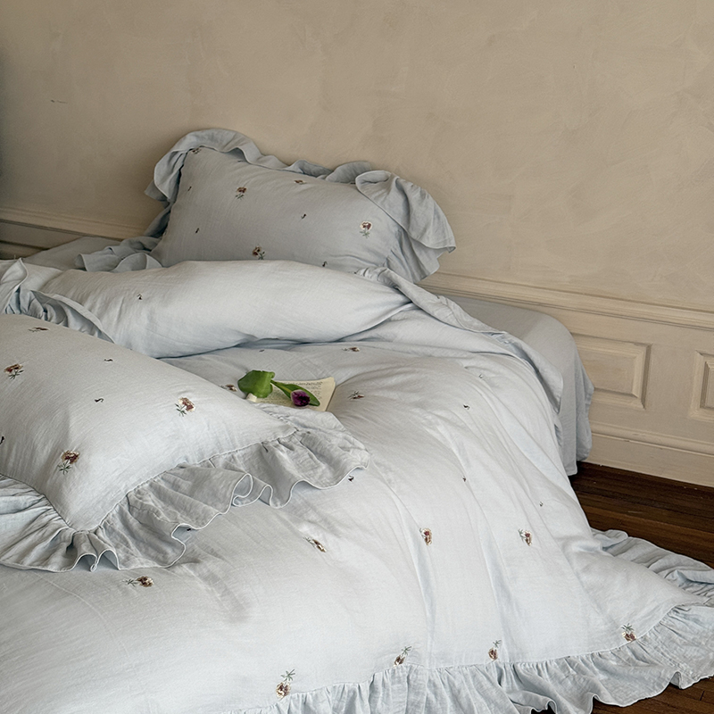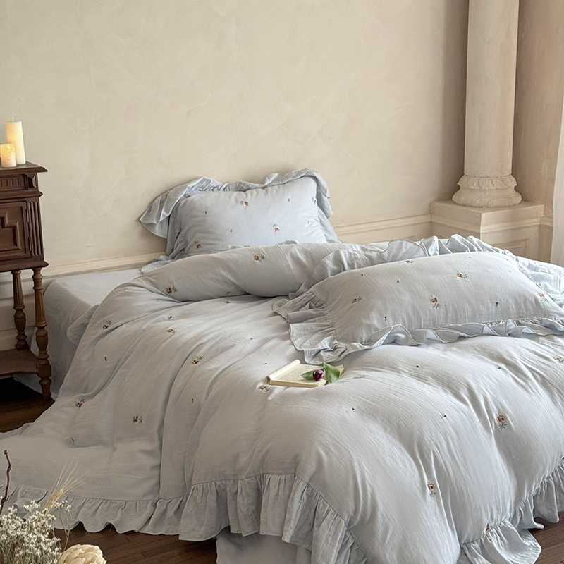 商品名称:(总)佳汐蓝 2025春夏新品双层皱皱纱刺绣+荷叶边四件套--花与浔