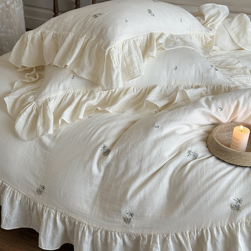 (总)佳汐蓝 2025春夏新品双层皱皱纱刺绣+织带+荷叶边四件套--白茶花,奶白,曲奇