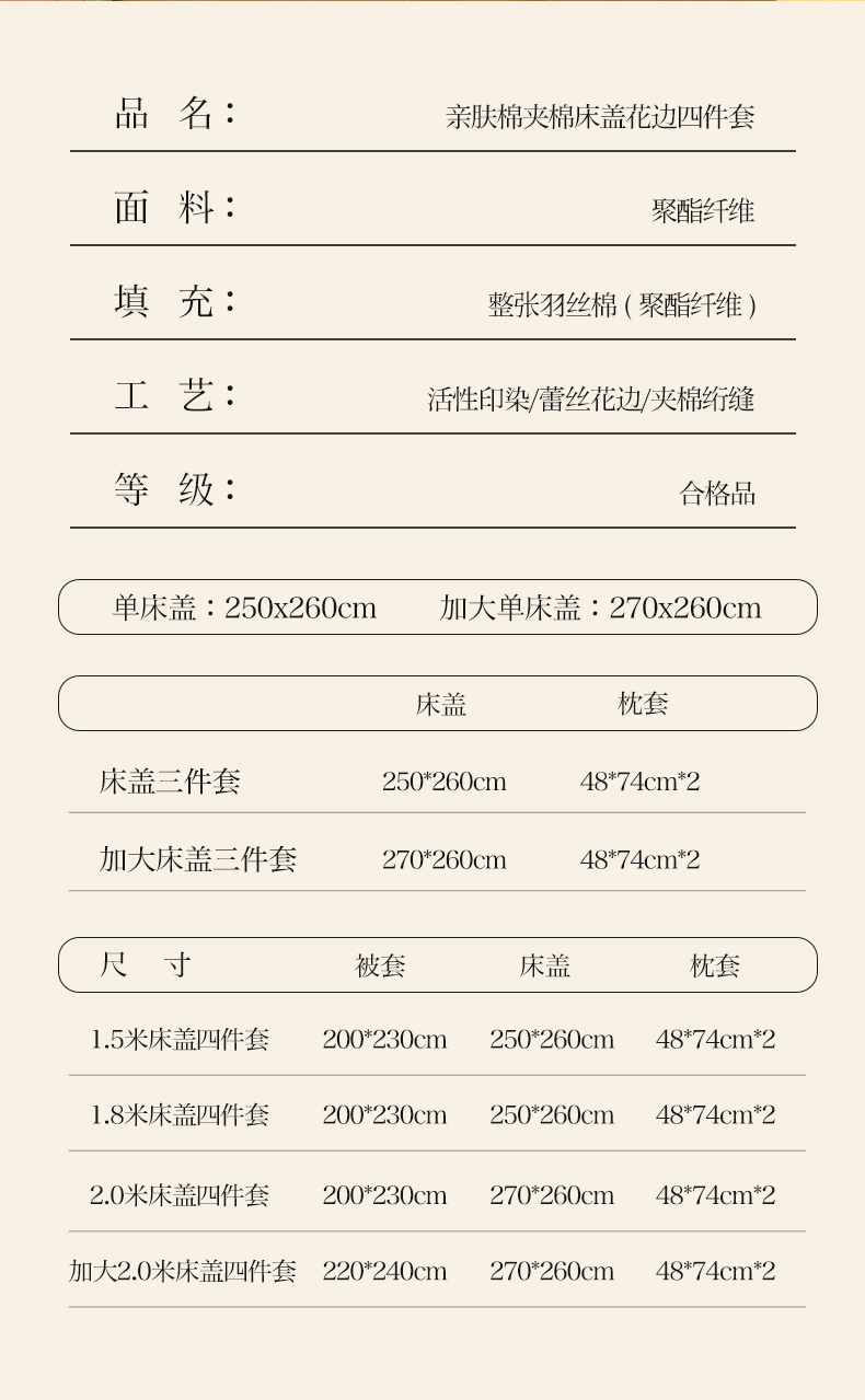 1.8米床盖四件套:被套200x230cm+床盖250x260cm+2只枕套 | ¥80.00 |