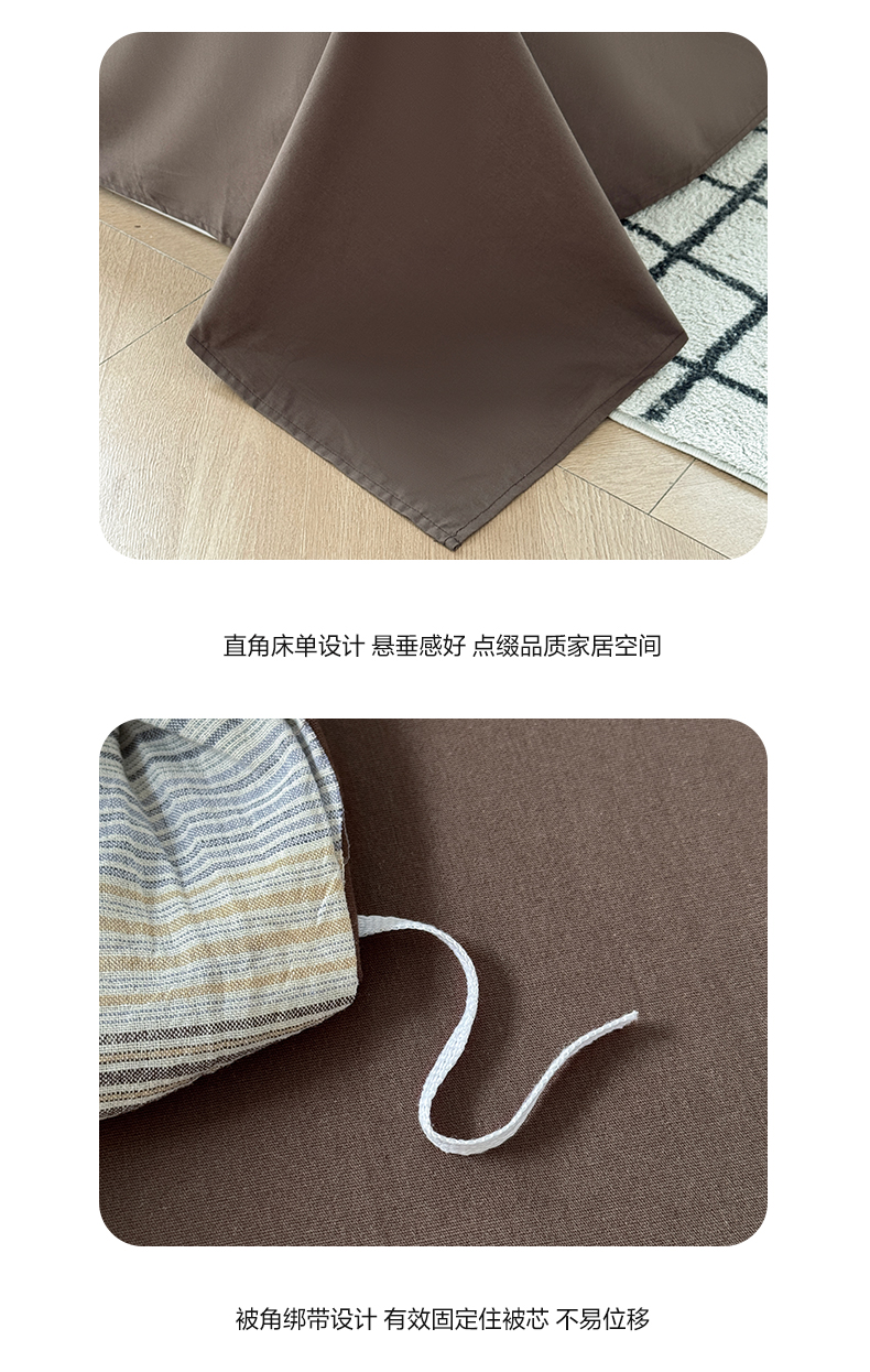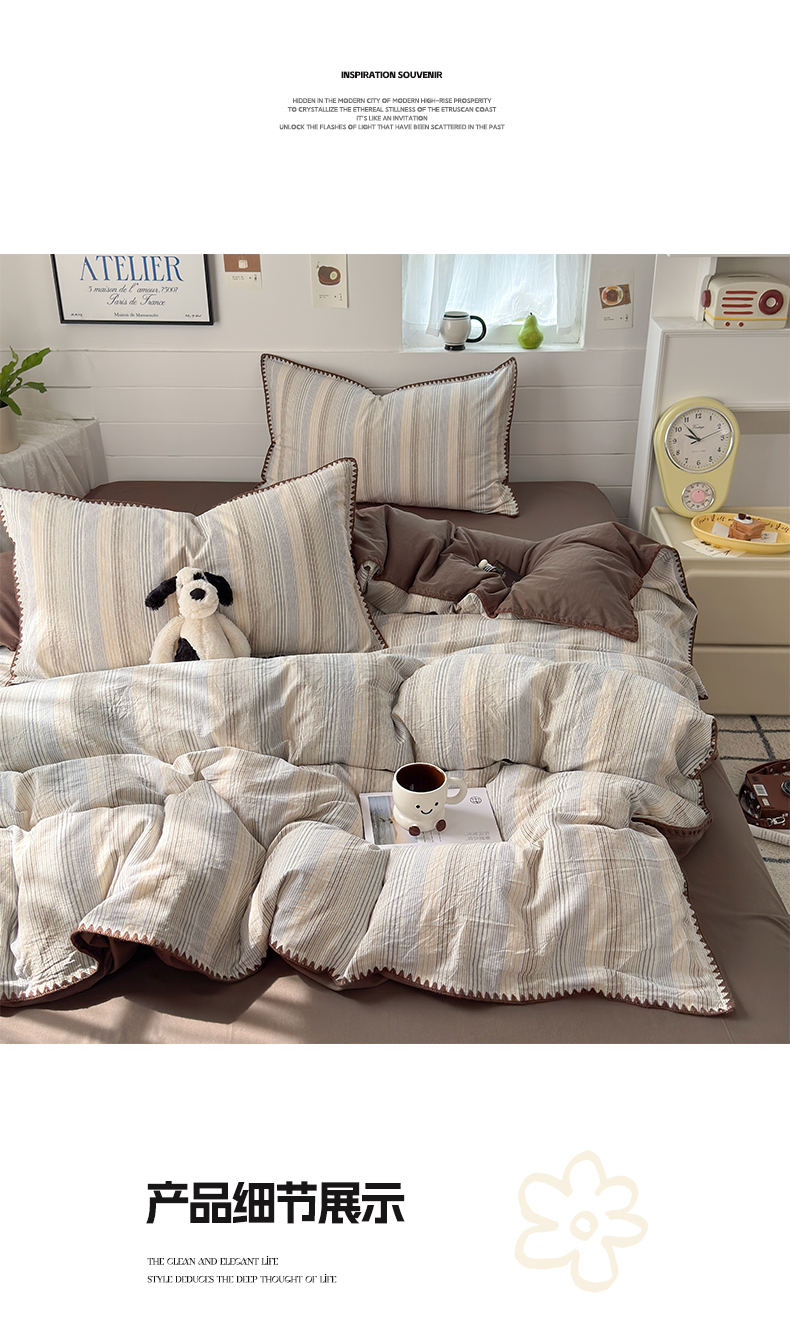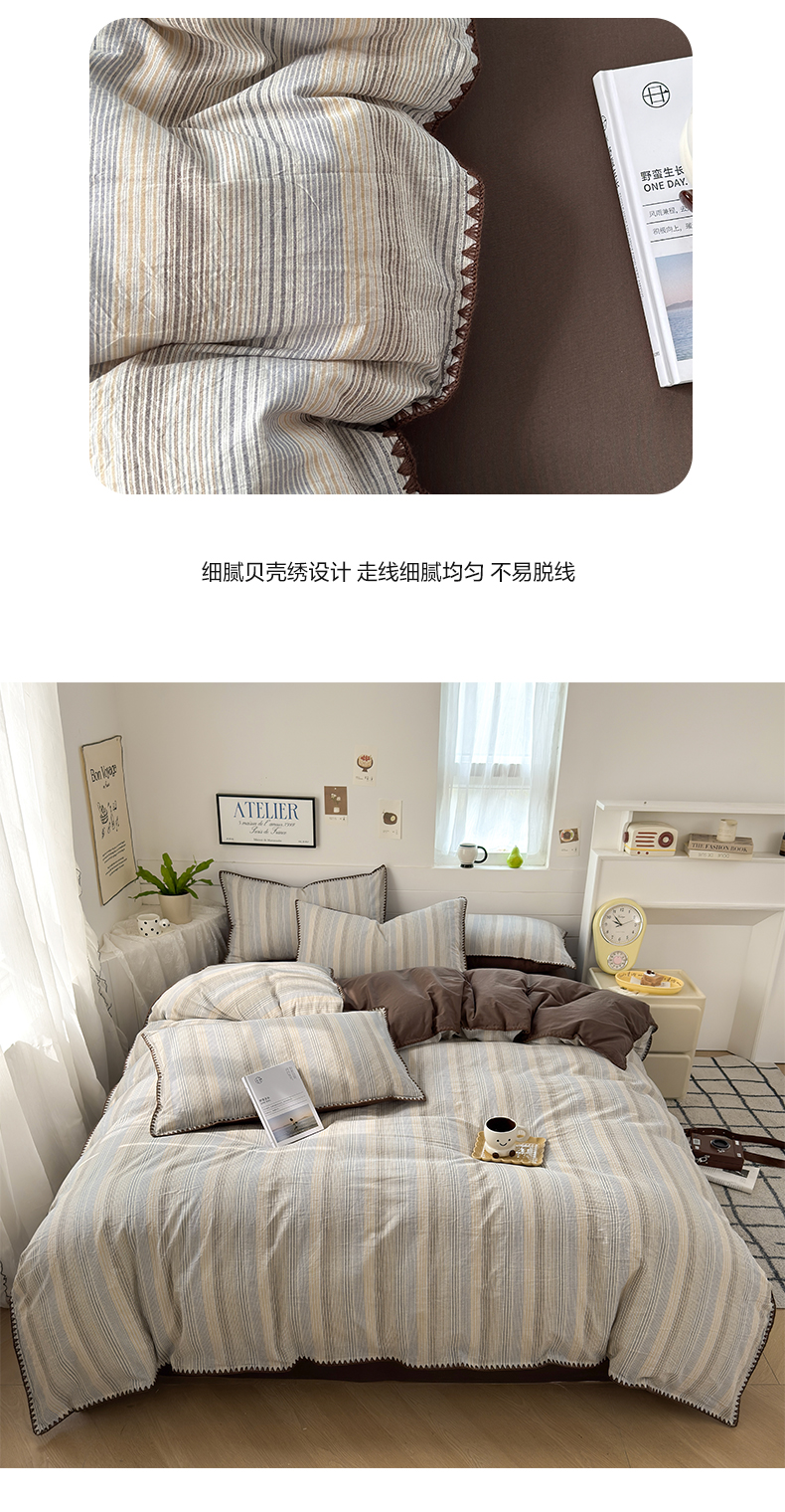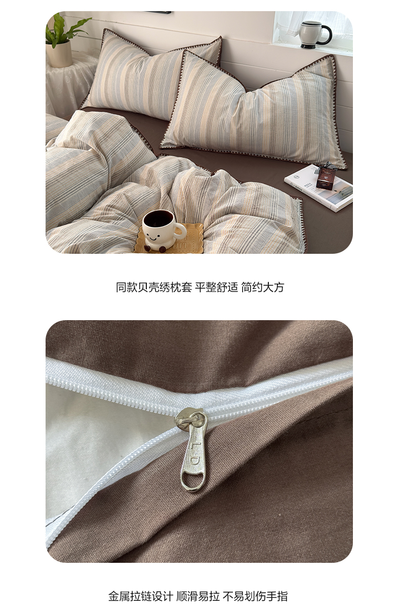 当前位置: 91家纺网 > 商品网购 > 床品套件 > 四件套 > 水洗棉四件套 > 2025新款A类全棉色织水洗棉贝壳绣条纹系列四件套 凯西亚深咖