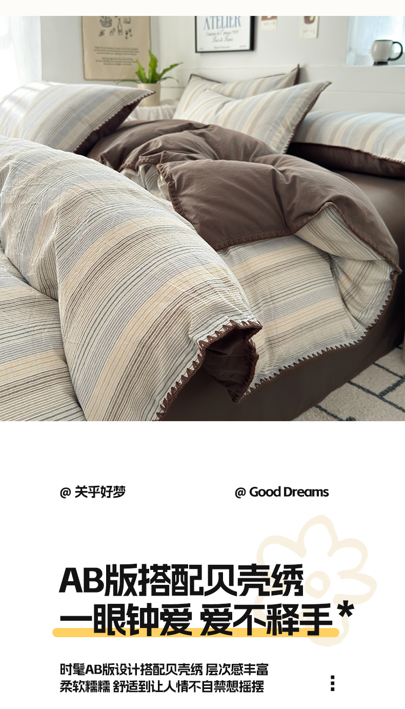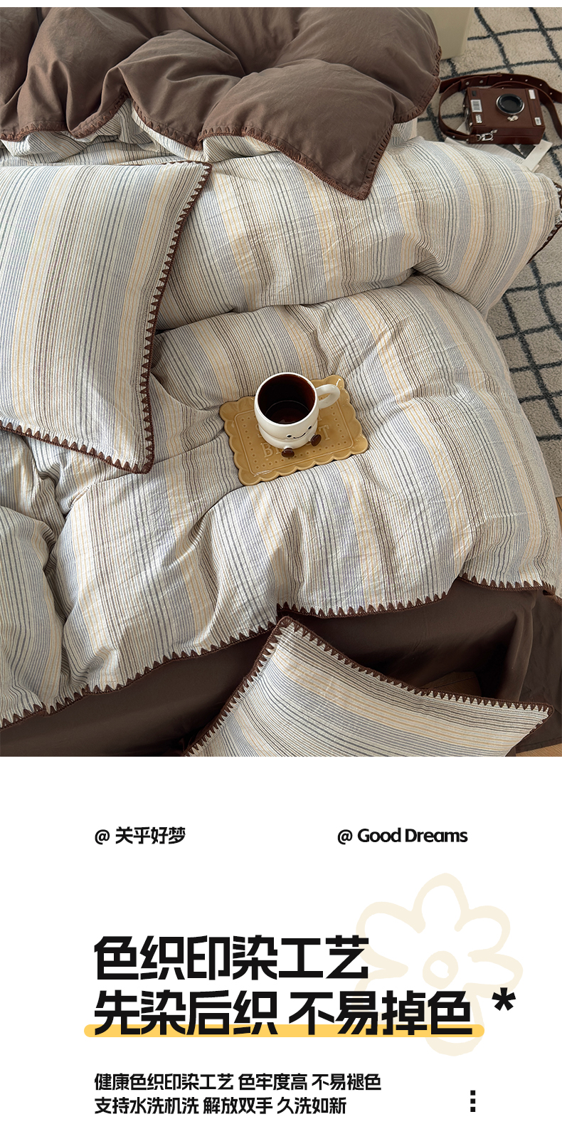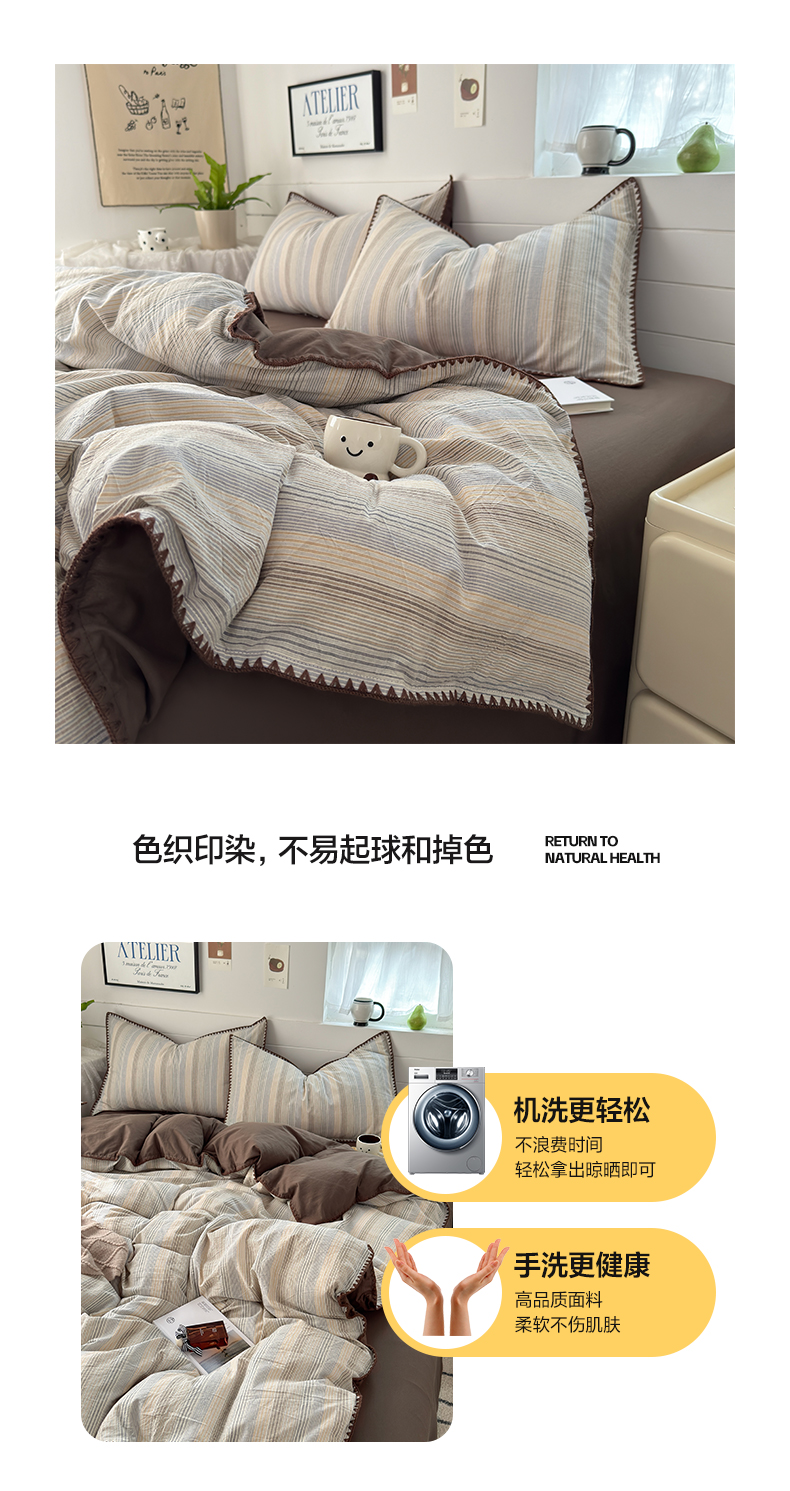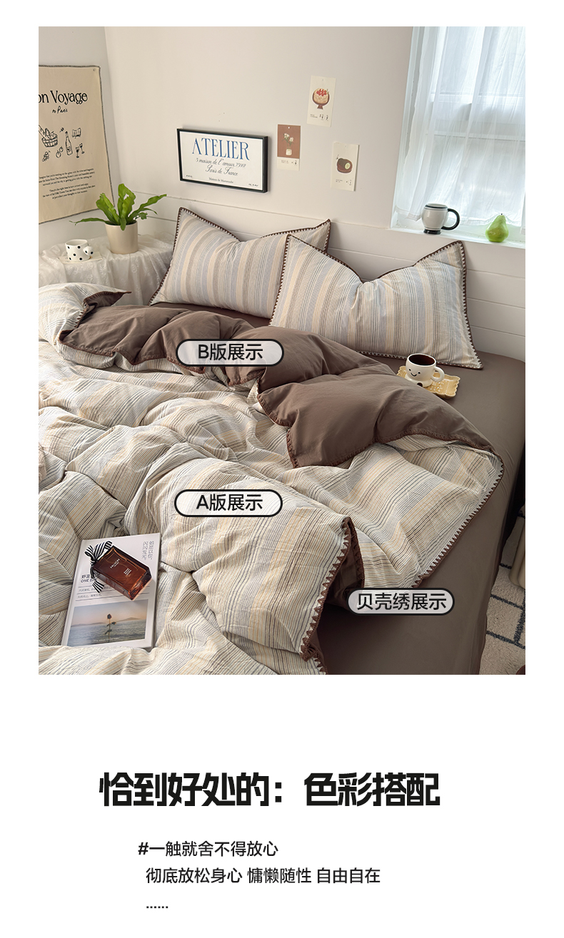 当前位置: 91家纺网 > 商品网购 > 床品套件 > 四件套 > 水洗棉四件套 > 2025新款A类全棉色织水洗棉贝壳绣条纹系列四件套 凯西亚深咖