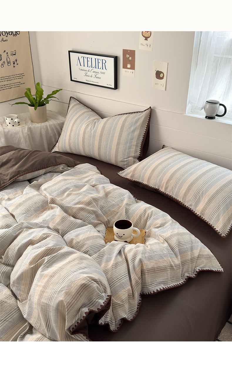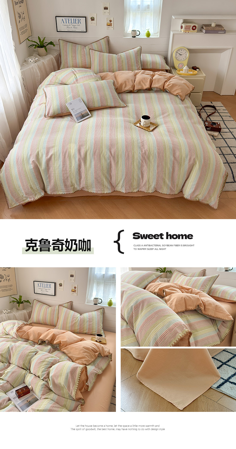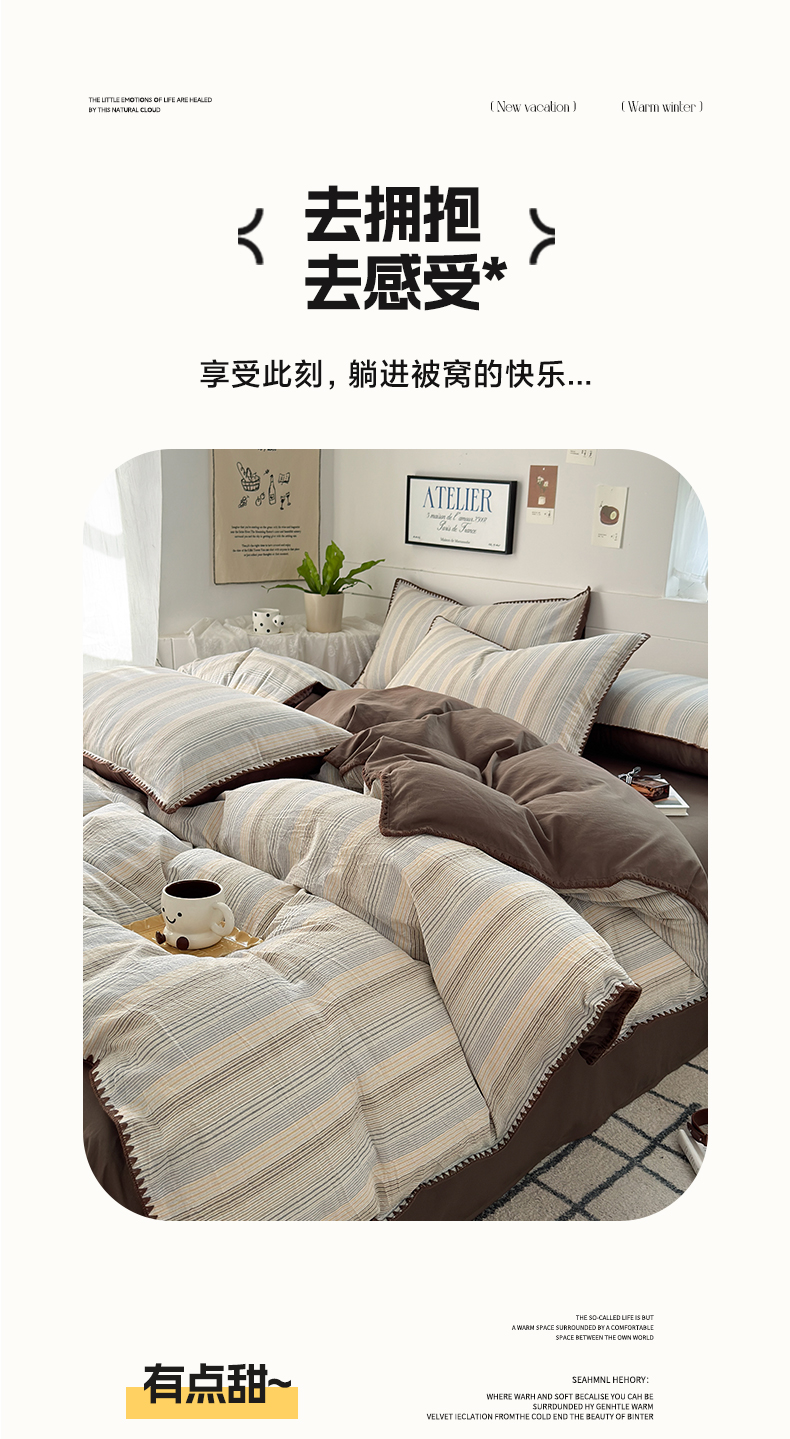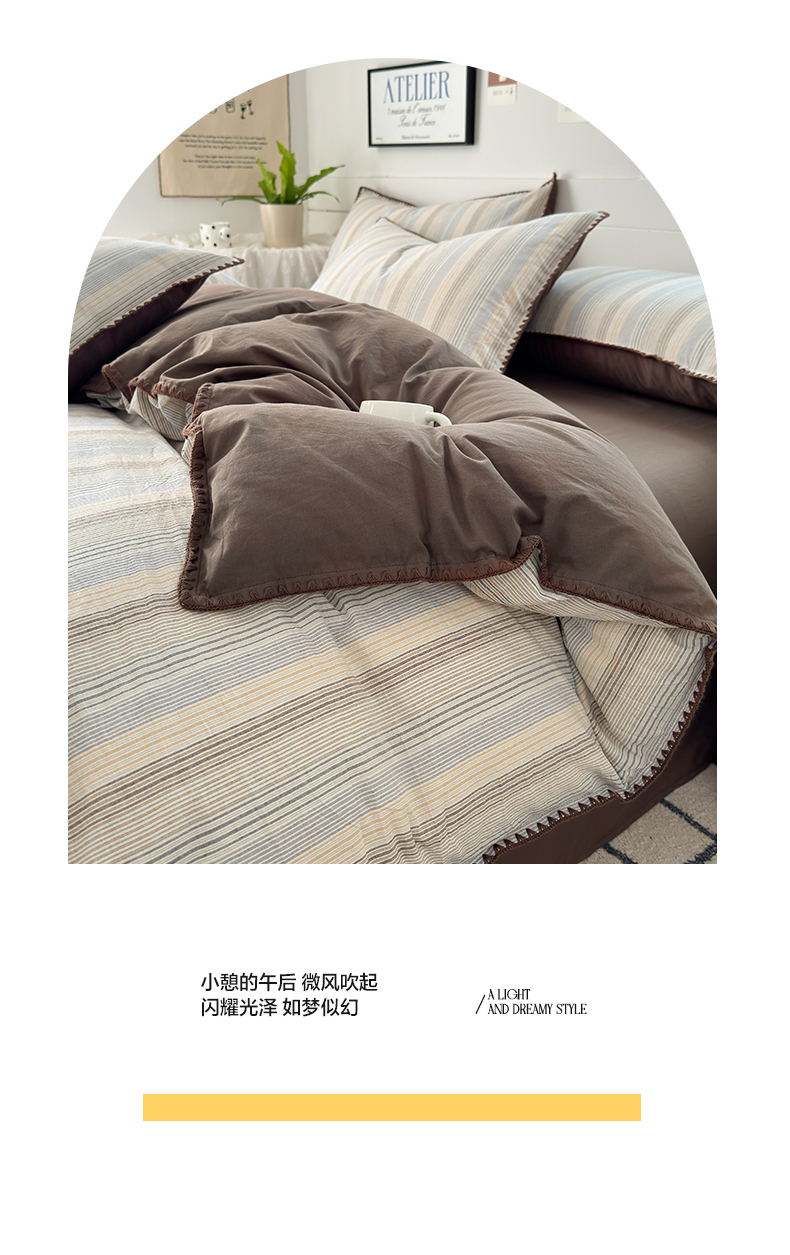 当前位置: 91家纺网 > 商品网购 > 床品套件 > 四件套 > 水洗棉四件套 > 2025新款A类全棉色织水洗棉贝壳绣条纹系列四件套 凯西亚深咖