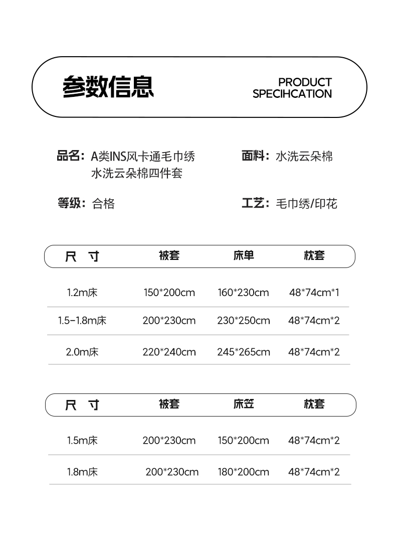 [{"sp_id":11,"sp_name":"\u989c\u8272\u5206\u7c7b","sp_format":2,"sp_list":[{"sp_value_id":55,"sp_value_name":"\u5c0f\u82b1\u732b","sp_value_image":{"id":999,"path":"https:\/\/img3.91jf.com\/ghelp\/2025\/20250318\/2327ae4e-c4d1-4675-8679-5ca326f184d520250318092115424.jpg_30_30.jpg"},"sp_value_video":{"id":1278706,"img":"https:\/\/img3.91jf.com\/ghelp\/2025\/20250318\/d168e9a0-38c3-45c7-858a-bb8e8ca8722520250318092021_298.png","path":"https:\/\/img3.91jf.com\/ghelp\/2025\/20250318\/e54e6421-0d50-4b0c-955d-0ccfcecc7bc720250318091610_147.mp4","time":21,"download_num":0,"play_num":0},"price":"55.00","storage":599,"weight":"2.200","is_check_weight":0,"plus_price":"","sp_sort":5}]},{"sp_id":10,"sp_name":"\u9002\u7528\u5e8a\u5c3a\u5bf8","sp_format":1,"sp_list":[{"sp_value_id":37,"sp_value_name":"1.2m\u5e8a\u5355\u6b3e\u4e09\u4ef6\u5957","sp_value_image":{"id":0,"path":""},"sp_value_video":{"id":0,"img":"","path":"","time":0,"download_num":0,"play_num":0},"price":"55.00","storage":100,"weight":"2.200","is_check_weight":0,"plus_price":"","sp_sort":1},{"sp_value_id":38,"sp_value_name":"1.5m\u5e8a\u5355\u6b3e\u56db\u4ef6\u5957","sp_value_image":{"id":0,"path":""},"sp_value_video":{"id":0,"img":"","path":"","time":0,"download_num":0,"play_num":0},"price":"65.00","storage":100,"weight":"2.400","is_check_weight":0,"plus_price":"","sp_sort":2},{"sp_value_id":39,"sp_value_name":"1.8m\u5e8a\u5355\u6b3e\u56db\u4ef6\u5957","sp_value_image":{"id":0,"path":""},"sp_value_video":{"id":0,"img":"","path":"","time":0,"download_num":0,"play_num":0},"price":"65.00","storage":99,"weight":"2.400","is_check_weight":0,"plus_price":"","sp_sort":3},{"sp_value_id":40,"sp_value_name":"2.0m\u5e8a\u5355\u6b3e\u56db\u4ef6\u5957","sp_value_image":{"id":0,"path":""},"sp_value_video":{"id":0,"img":"","path":"","time":0,"download_num":0,"play_num":0},"price":"70.00","storage":100,"weight":"2.500","is_check_weight":0,"plus_price":"","sp_sort":4},{"sp_value_id":41,"sp_value_name":"1.5m\u5e8a\u7b20\u6b3e\u56db\u4ef6\u5957","sp_value_image":{"id":0,"path":""},"sp_value_video":{"id":0,"img":"","path":"","time":0,"download_num":0,"play_num":0},"price":"70.00","storage":100,"weight":"2.400","is_check_weight":0,"plus_price":"","sp_sort":5},{"sp_value_id":42,"sp_value_name":"1.8m\u5e8a\u7b20\u6b3e\u56db\u4ef6\u5957","sp_value_image":{"id":0,"path":""},"sp_value_video":{"id":0,"img":"","path":"","time":0,"download_num":0,"play_num":0},"price":"70.00","storage":100,"weight":"2.400","is_check_weight":0,"plus_price":"","sp_sort":6}]}]