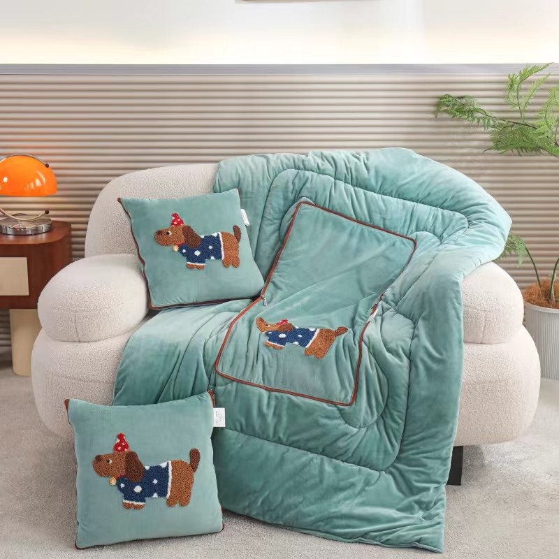 枕芯真意 2025新款毛巾绣刺绣小狗系列多功能抱枕被--腊肠狗 腊肠狗-果绿