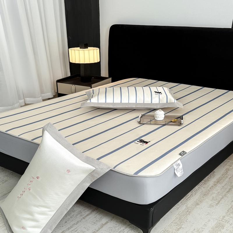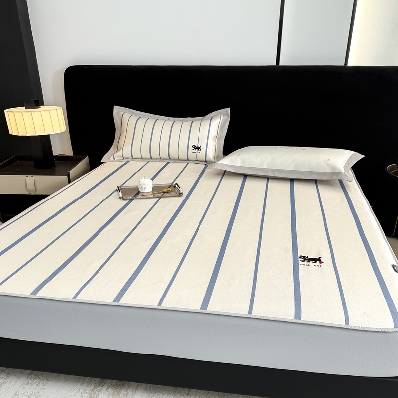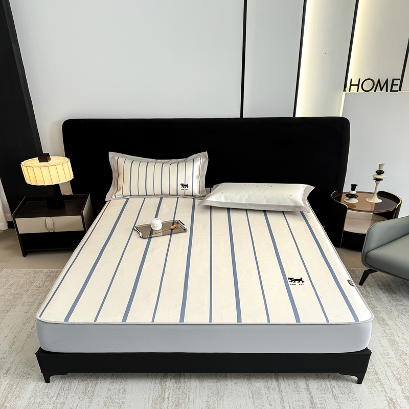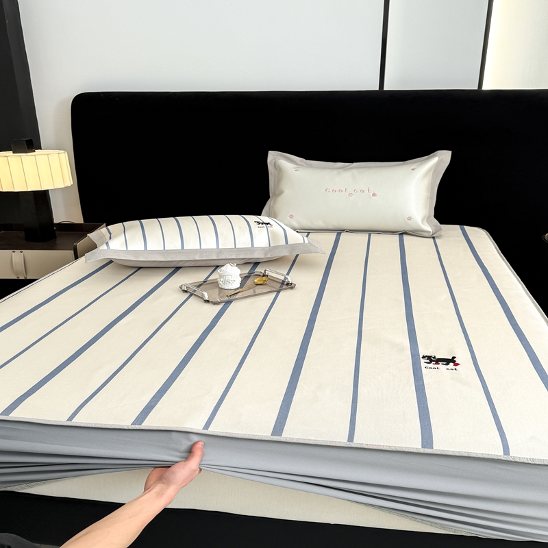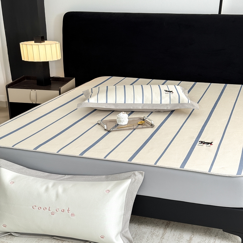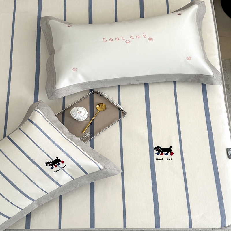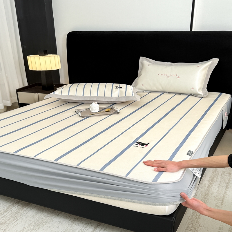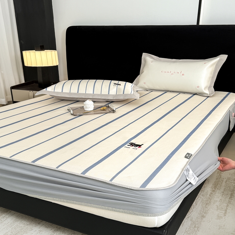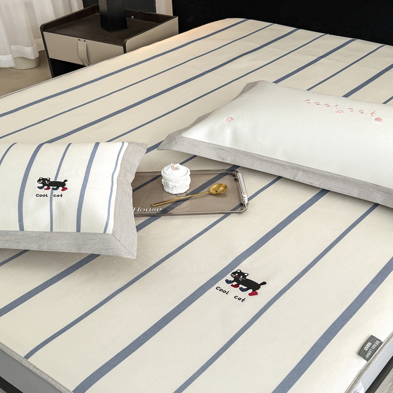 商品名称:木希2025春夏新款可水洗冰丝席幻彩刺绣床笠系列-场景二 臭美小猫咪