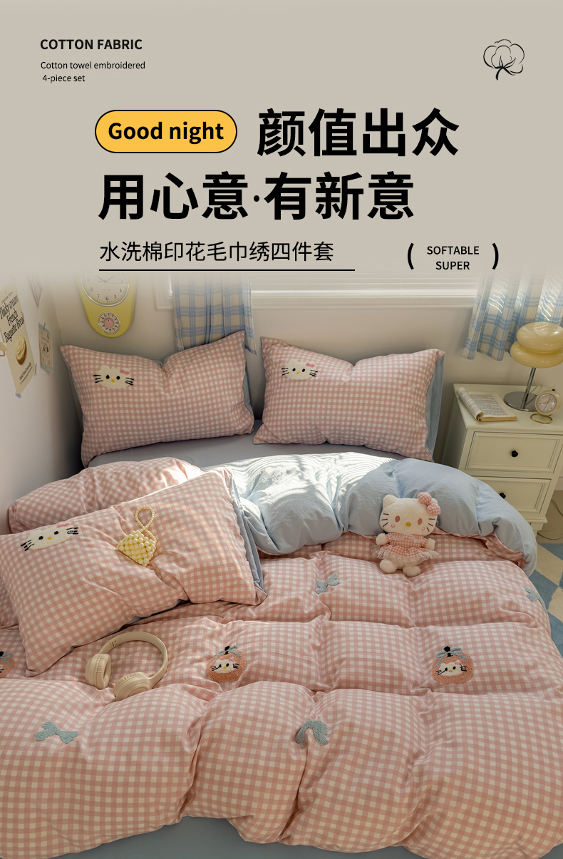 当前位置: 91家纺网 > 商品网购 > 床品套件 > 四件套 > 磨毛活性四件套 > 优兰朵 2025新款学生卡通水洗棉毛巾绣三件套床品四件套系列(提供买家秀) 苹果猫咪-粉格