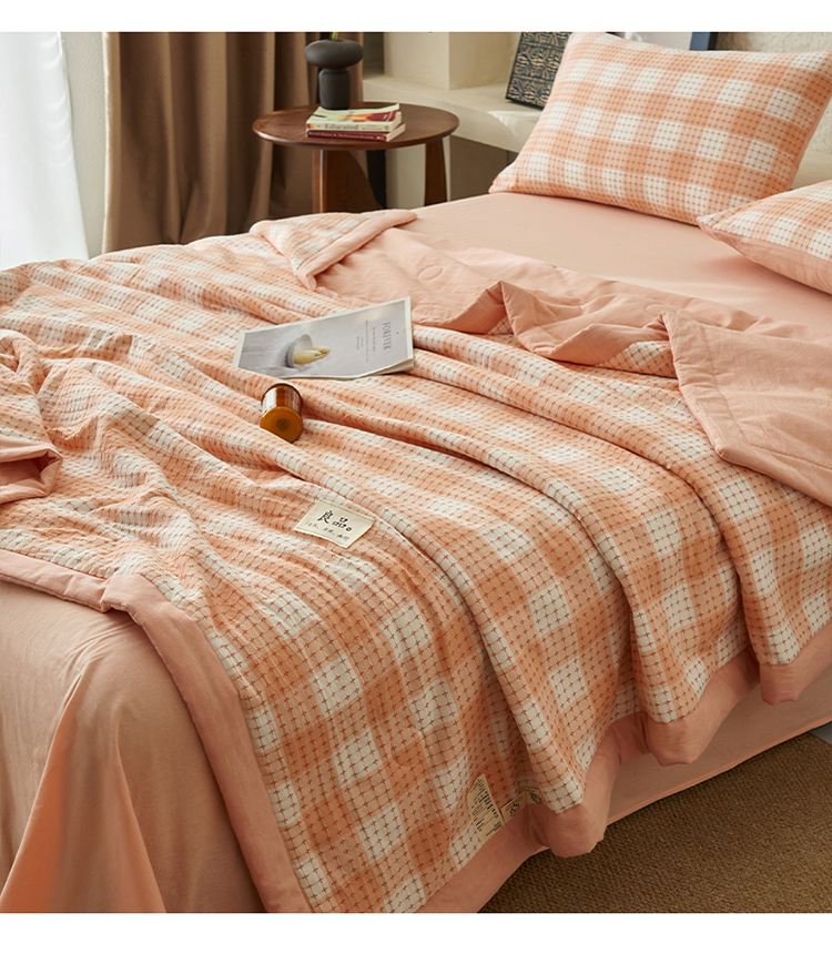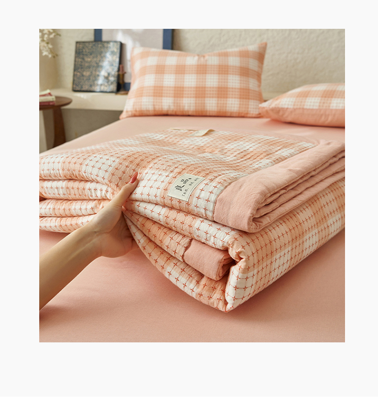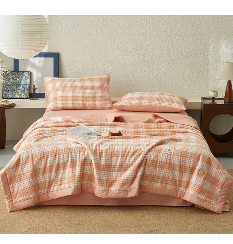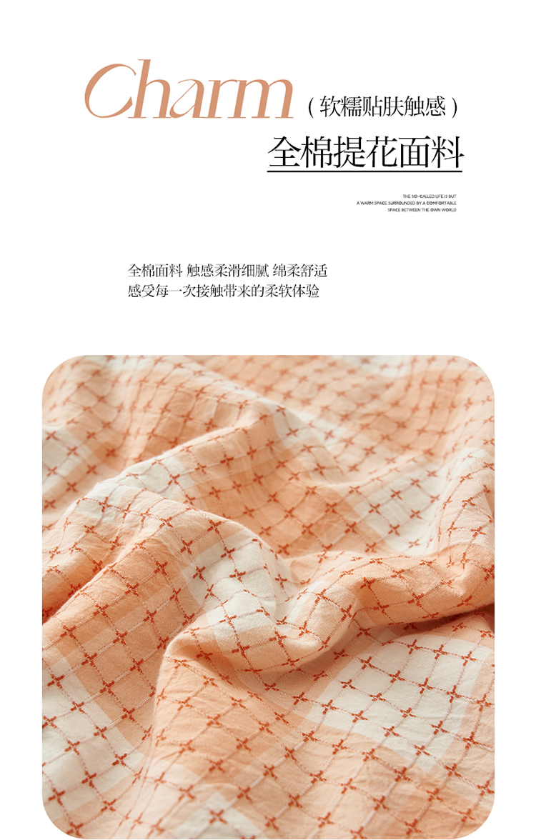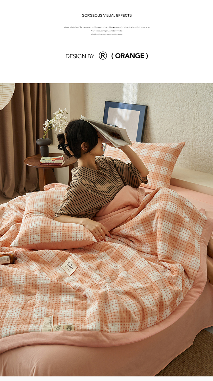 当前位置: 91家纺网 > 商品网购 > 床品套件 > 四件套 > 夏被四件套 > 简如 2025新款A类全棉提花大豆夏被四件套-米格 米格-橘
