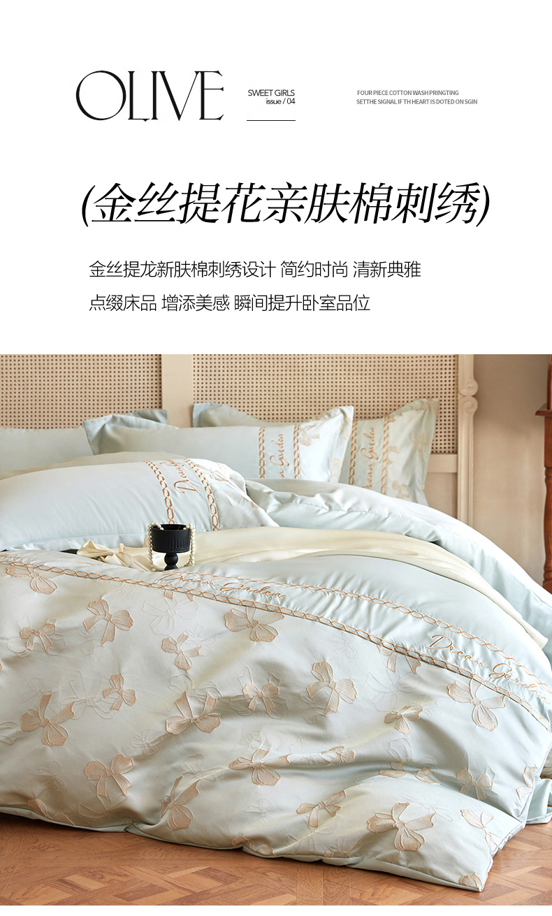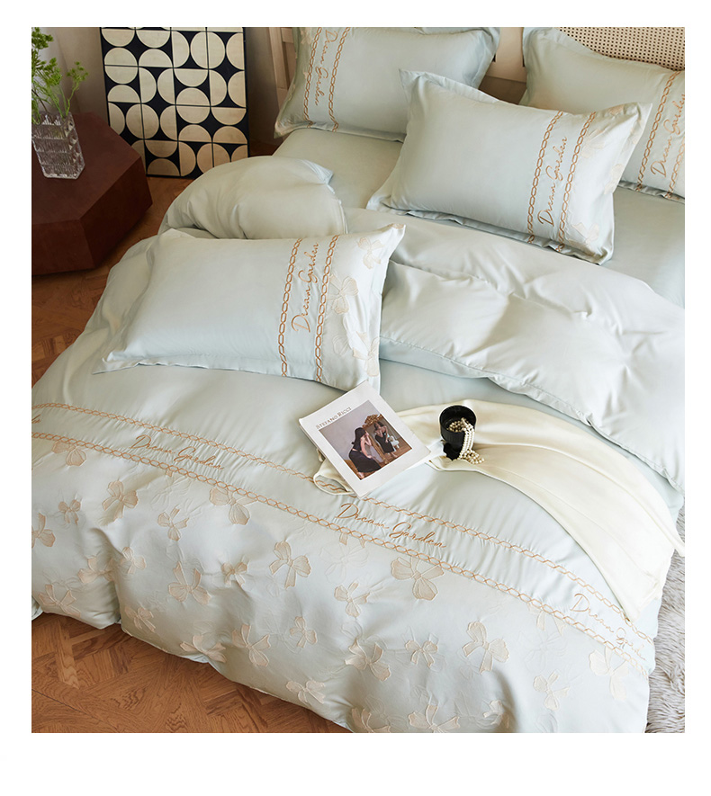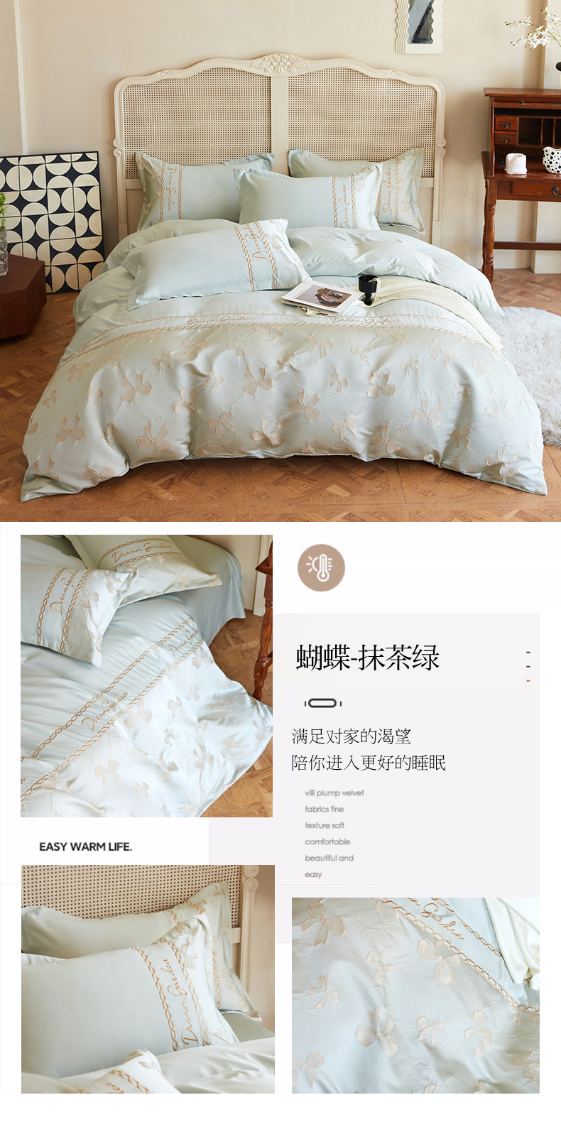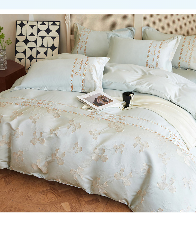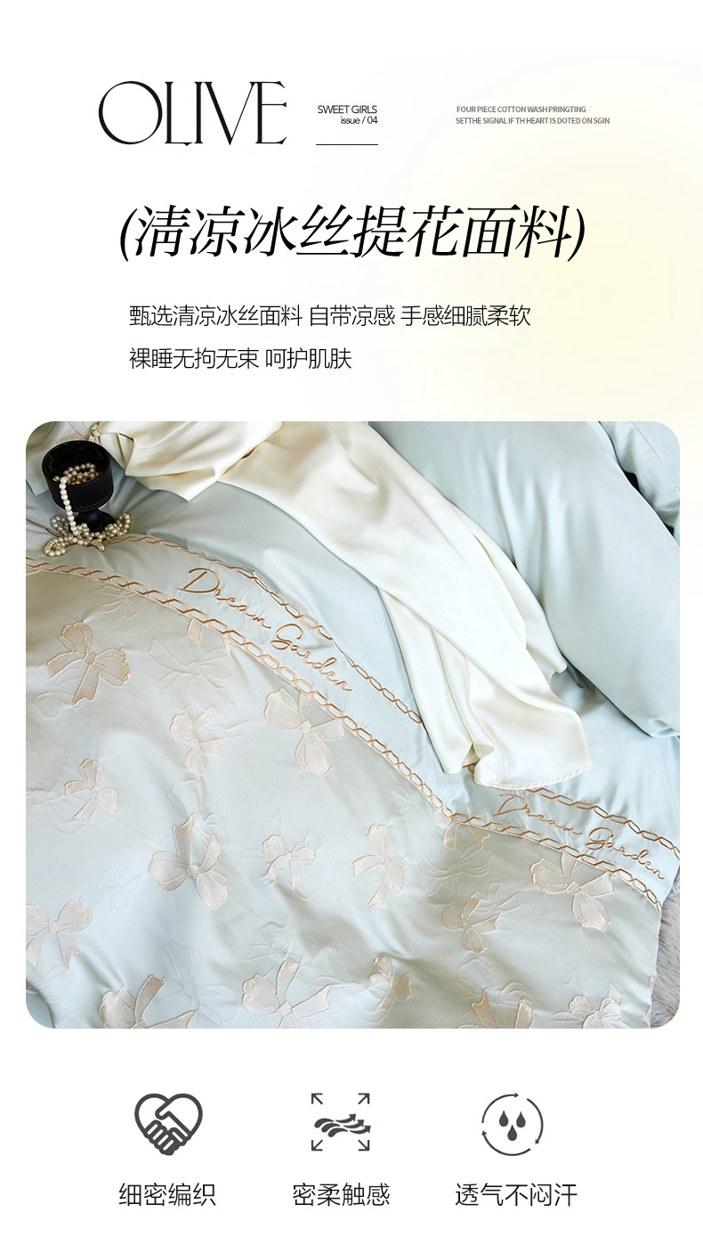 商品名称:菲儿2025新款冰丝浮雕提花绣花四件套 蝴蝶结-抹茶绿