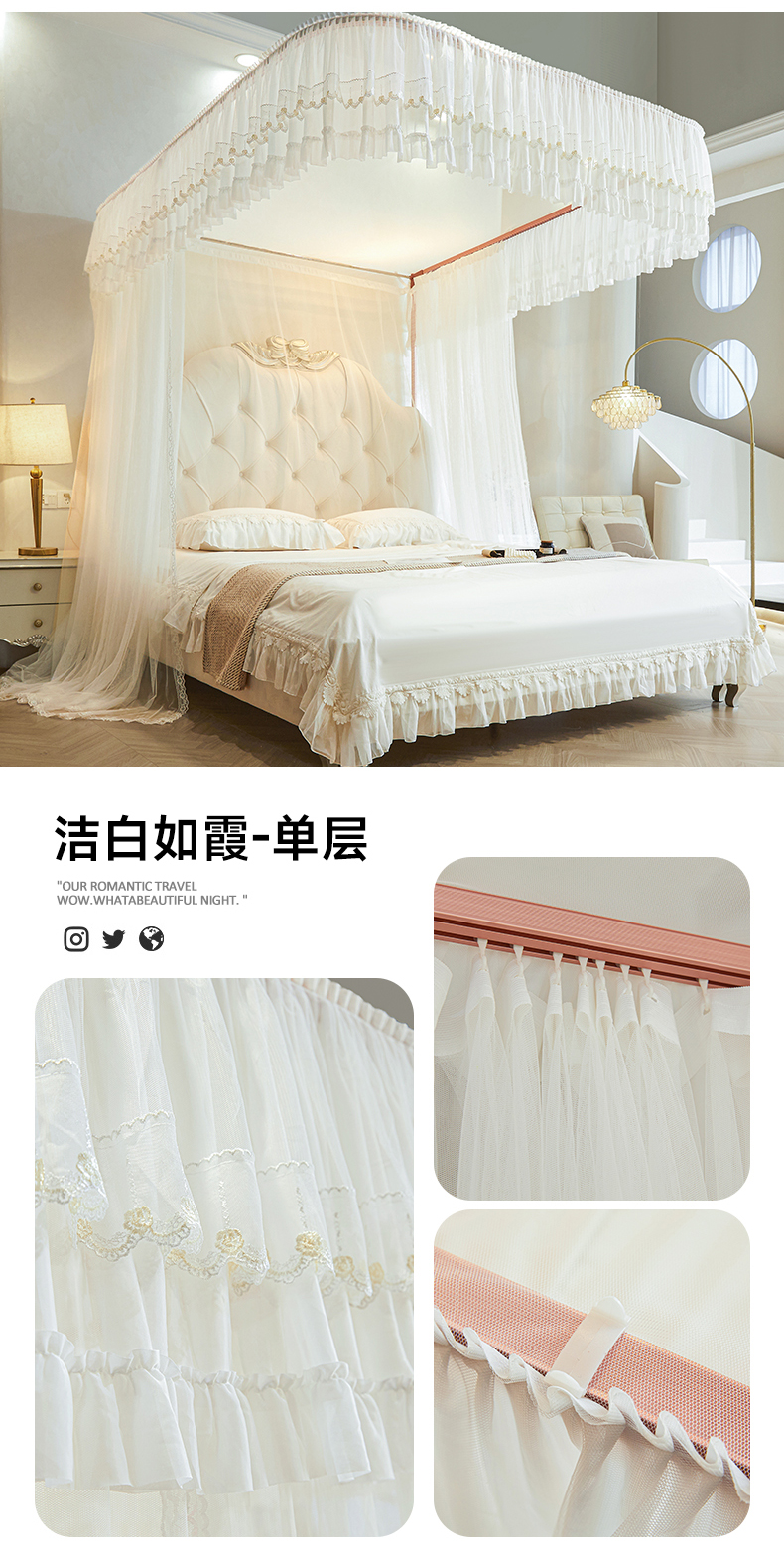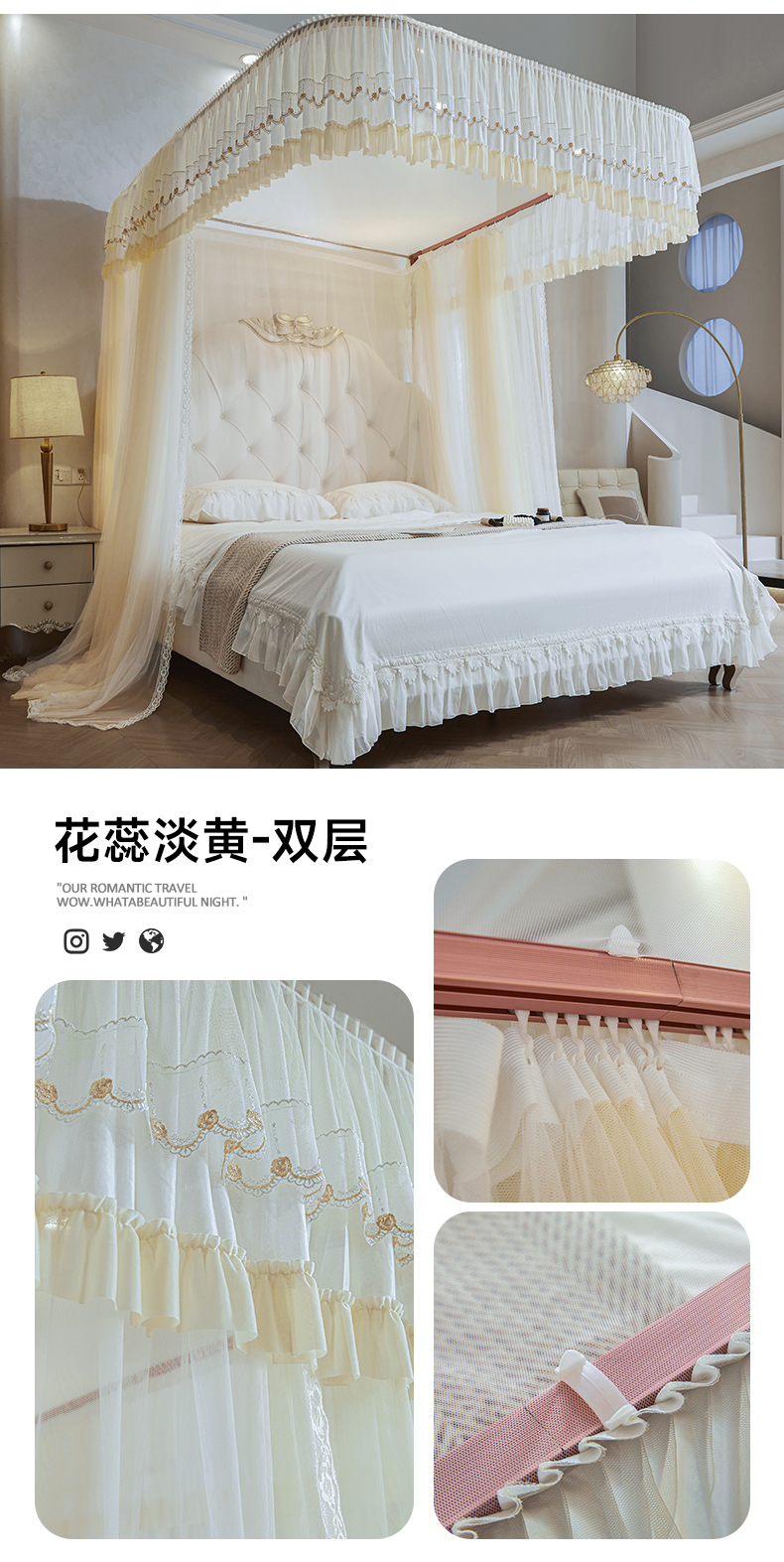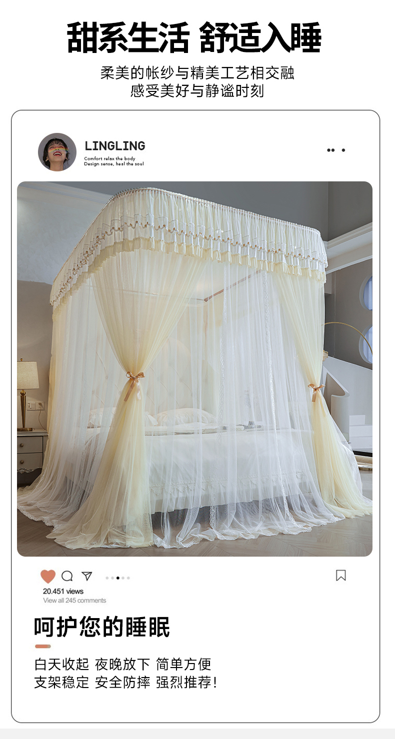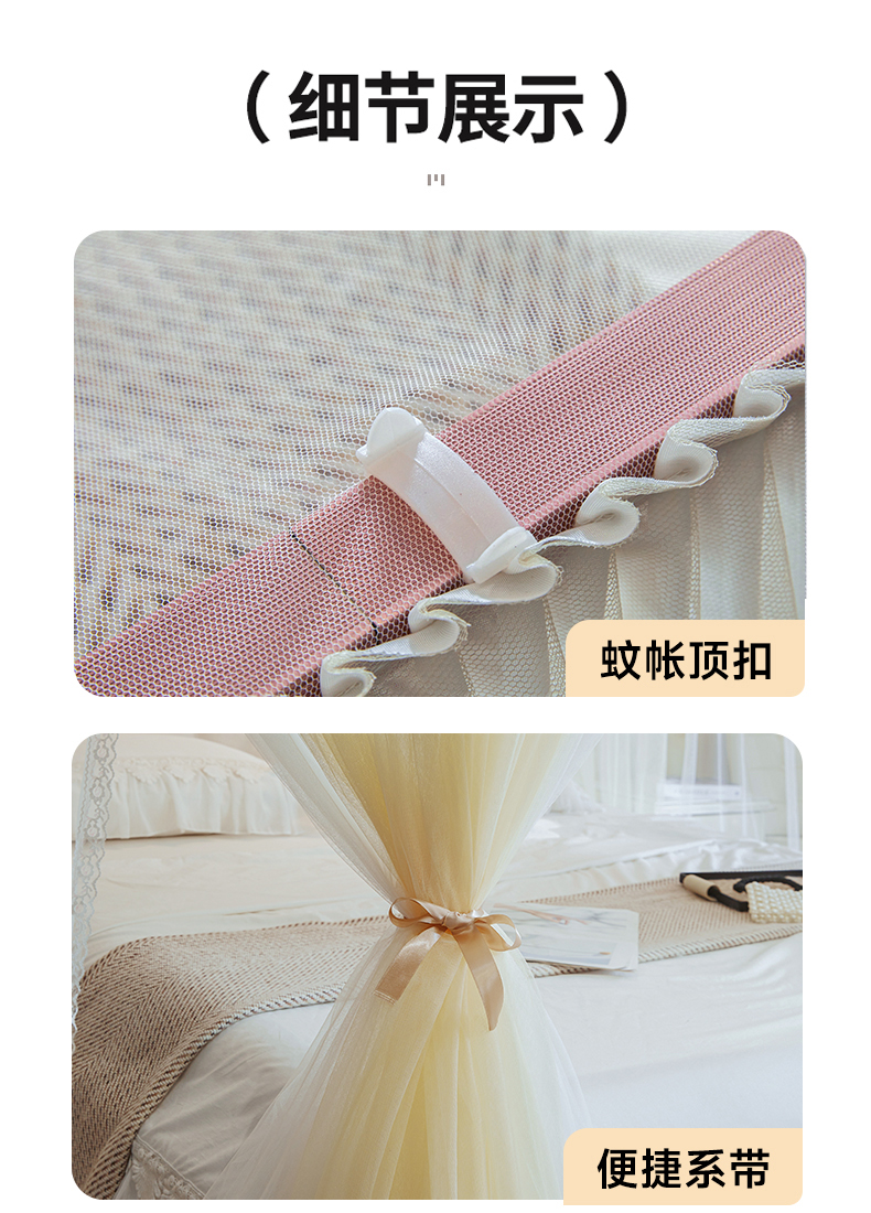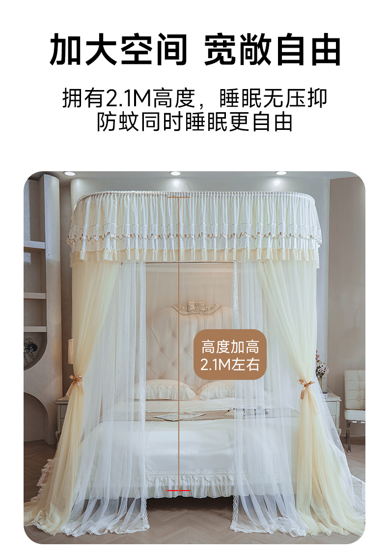 (总)2025新款双层花边全包围床笠款三开门蚊帐-幽梦星辰,奶黄,藕玉,颜淡蓝