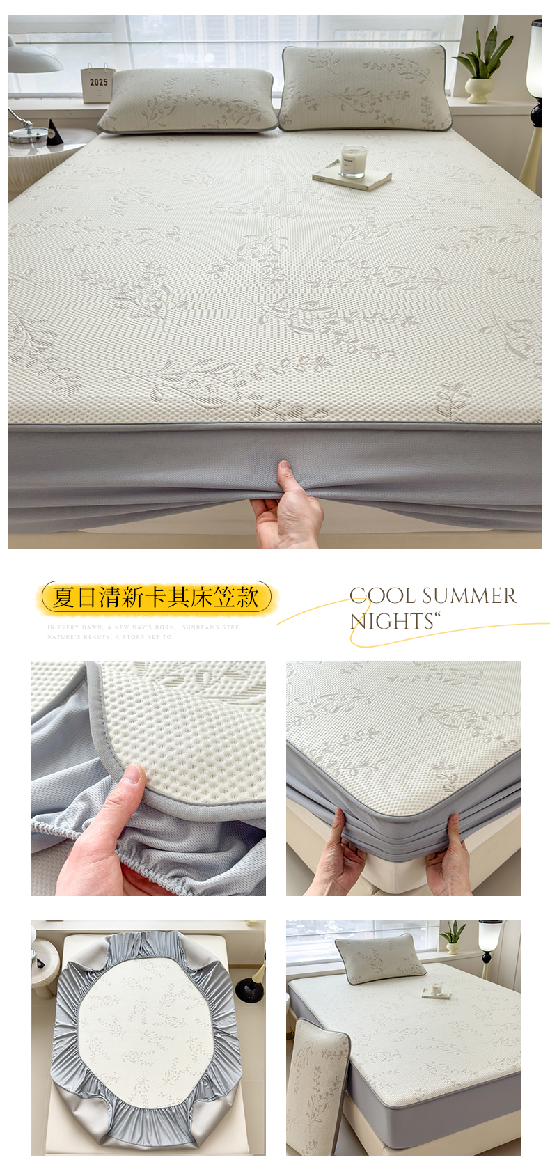 2025年新款PE豆豆提花凉席花卉系列-床笠款 夏日清新卡其