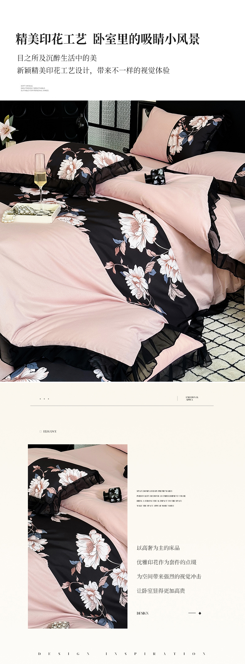 (总)宅家居 2025新款轻法式复古风拼接印花纯棉长绒棉韩式黑色花边40支全棉四件套-赫琳娜