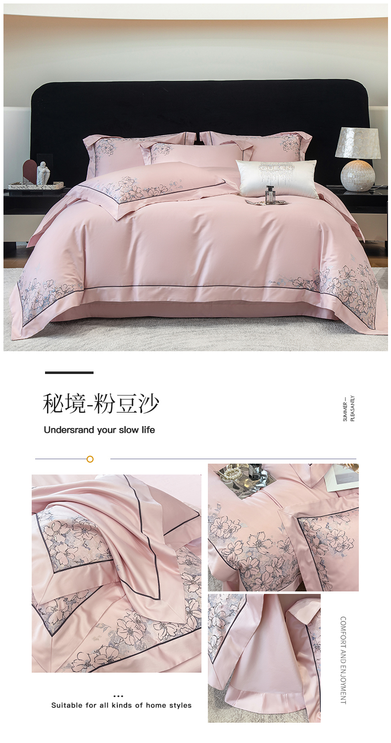 商品名称:张公子婚庆馆 2025新款140支新疆长绒棉纯棉居家绣花拼角工艺系列四件套—秘境 秘境-粉豆沙