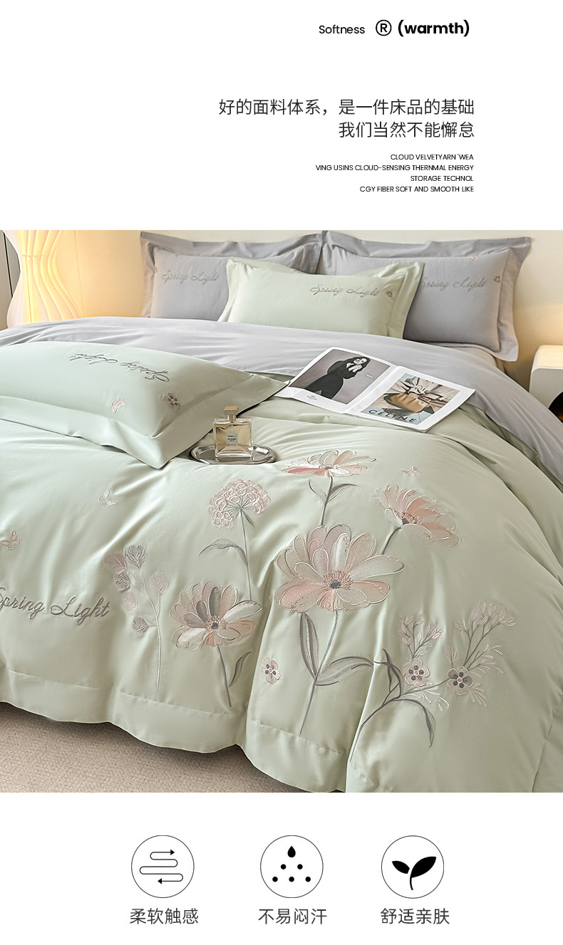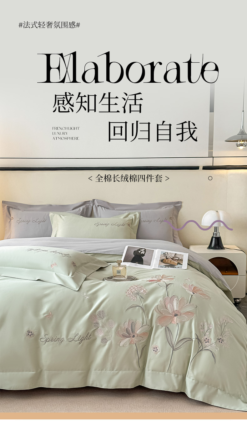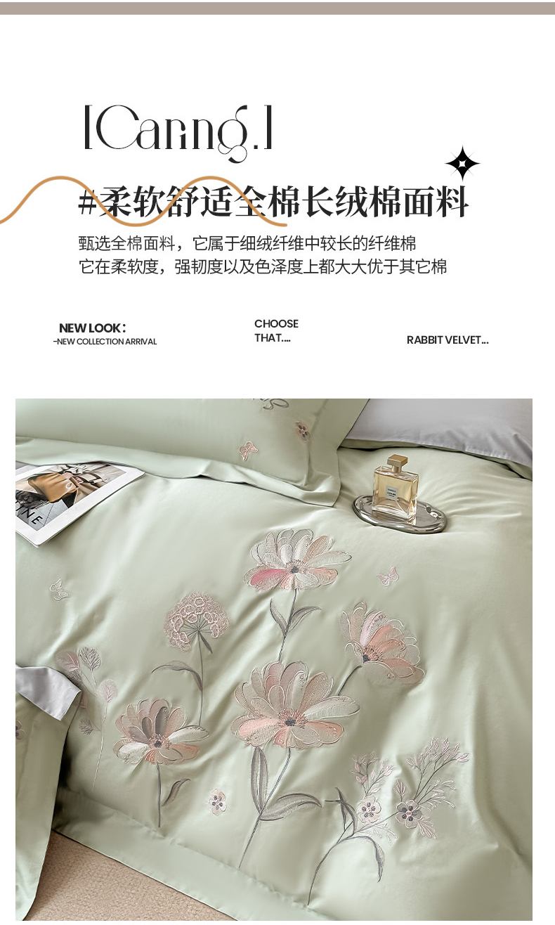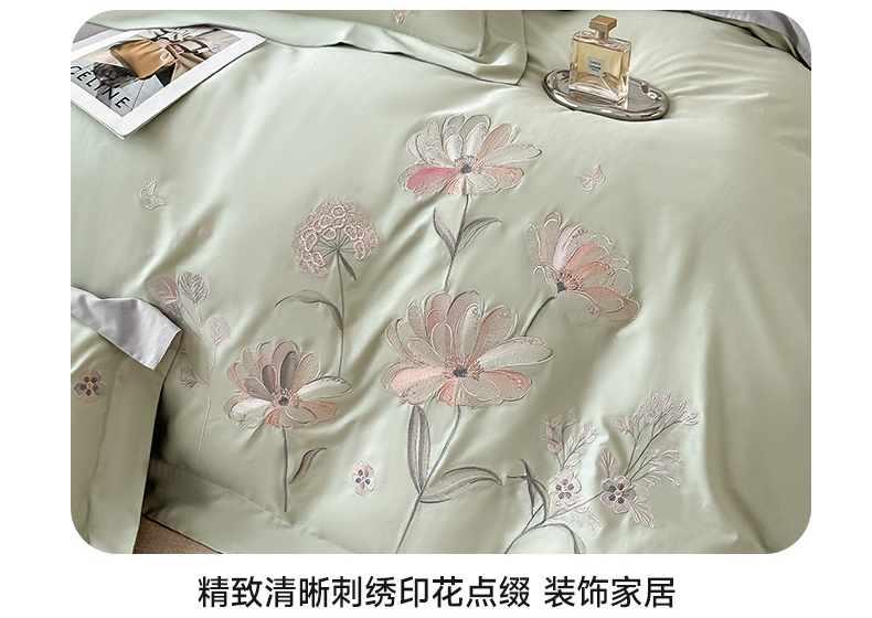 (总)博之洋婚庆 2025新款纯棉全棉长绒棉刺绣绣花高端礼盒四件套-花之语系列,豆绿,豆沙,粉灰,高级灰