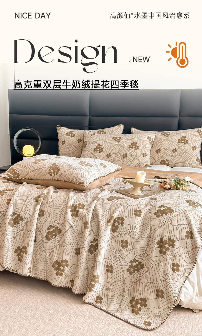 芙绣家纺 2025新款高克重双层牛奶绒毛毯加厚冬季毛毯四季毯办公室午休毯牛奶绒床单 清新叶语-咖