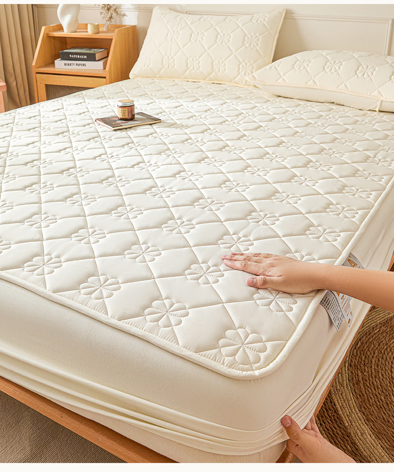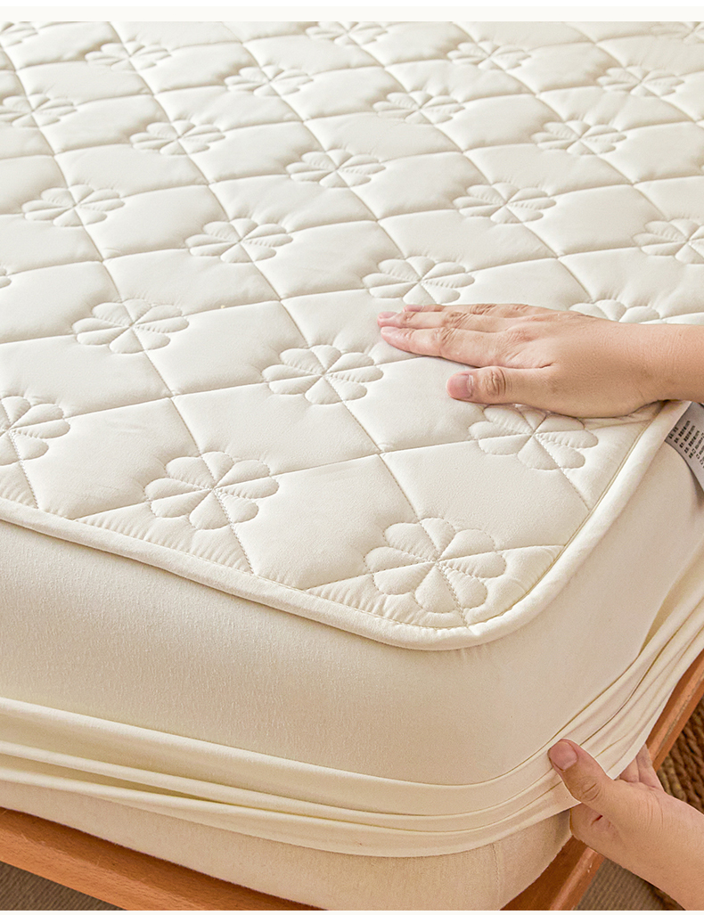 雯豆家纺 2025新款简约防水款水洗棉夹棉床笠 幸运草-月光白