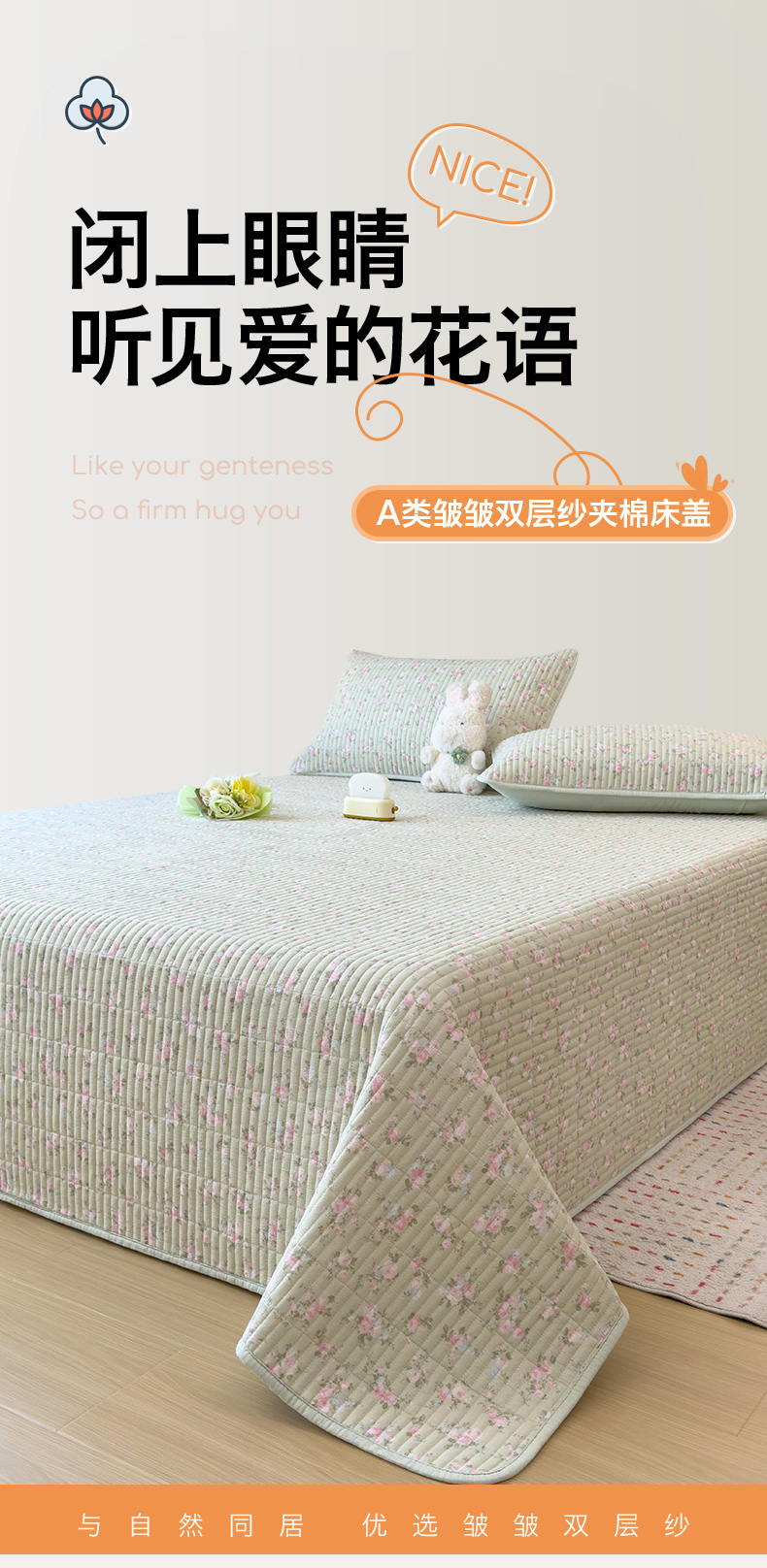 • 91家纺网 家纺一手货源 找家纺 雯豆家纺 2025新品皱皱双层纱床盖泡泡纱床罩保护套 爱尔蓝