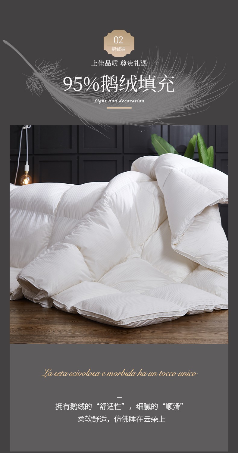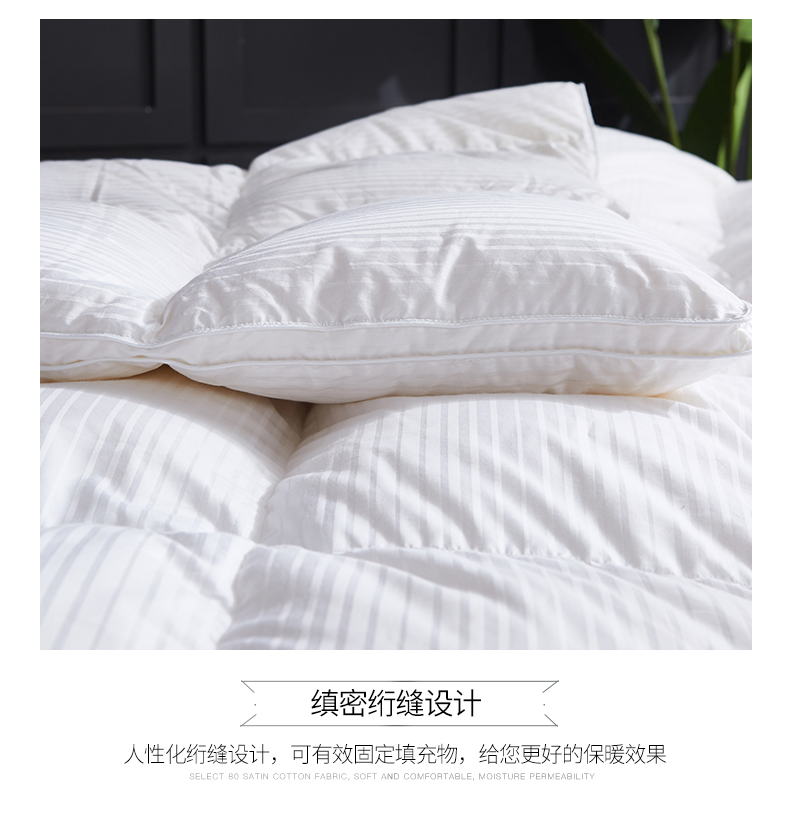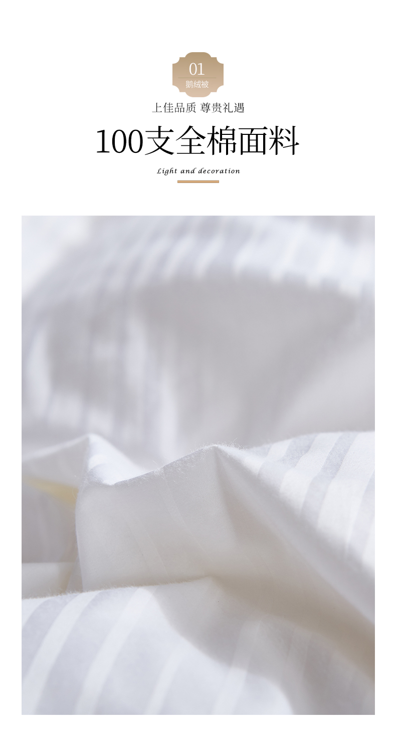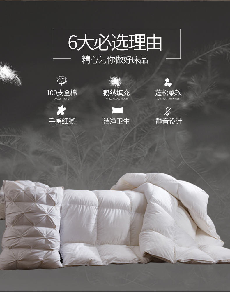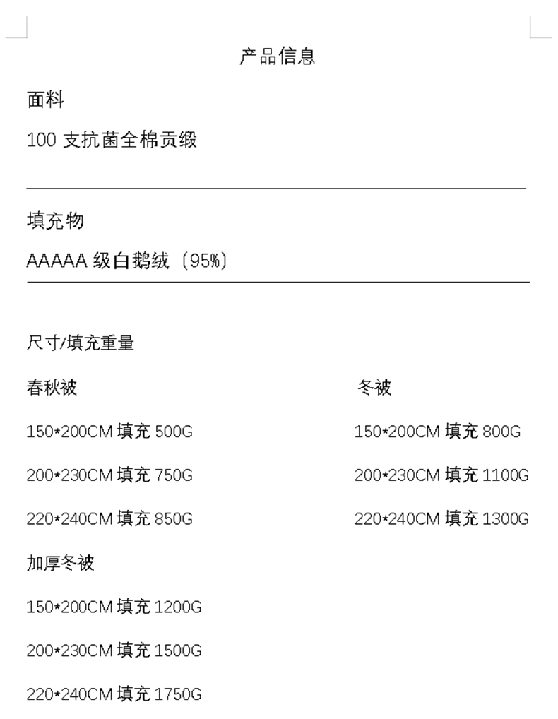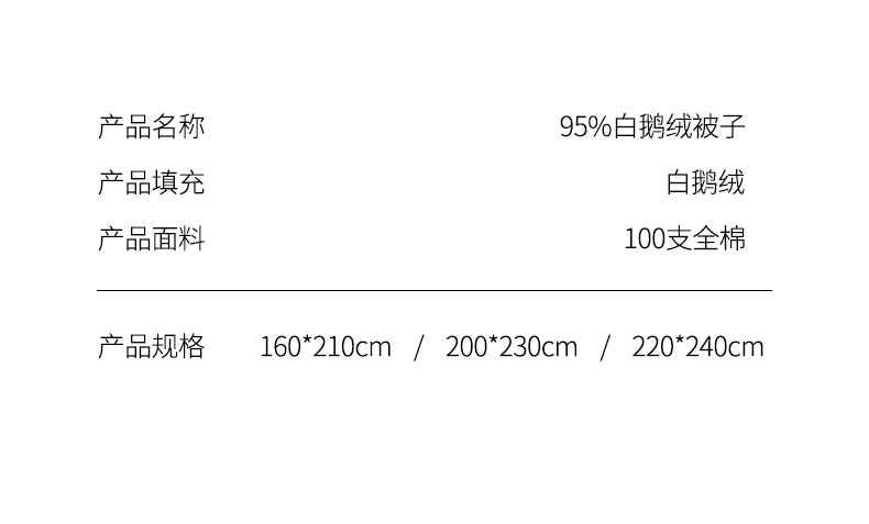 面料:100支纯棉缎纹 填充:95%白鹅绒 尺寸/填充重量 春秋被