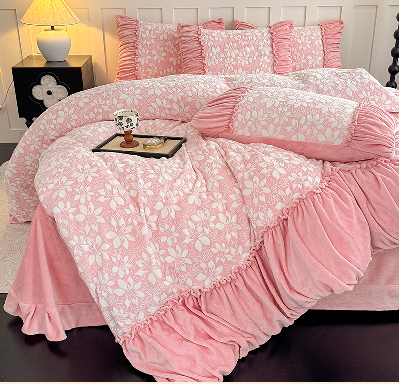 (总)【苏东来】2025高端加厚保暖纯色甜美公主赫本风法式工艺款雕花牛奶绒四件套清新少女婴儿法莱兔绒四件套,蝶恋花,繁花,花香,玫瑰花,一枝花,华尔兹粉,华尔兹卡其,华尔兹水绿,华尔兹天蓝,山茶花,蝴蝶花,梦蝶,如意结,飞舞少女,满天星粉,满天星卡其,满天星水绿