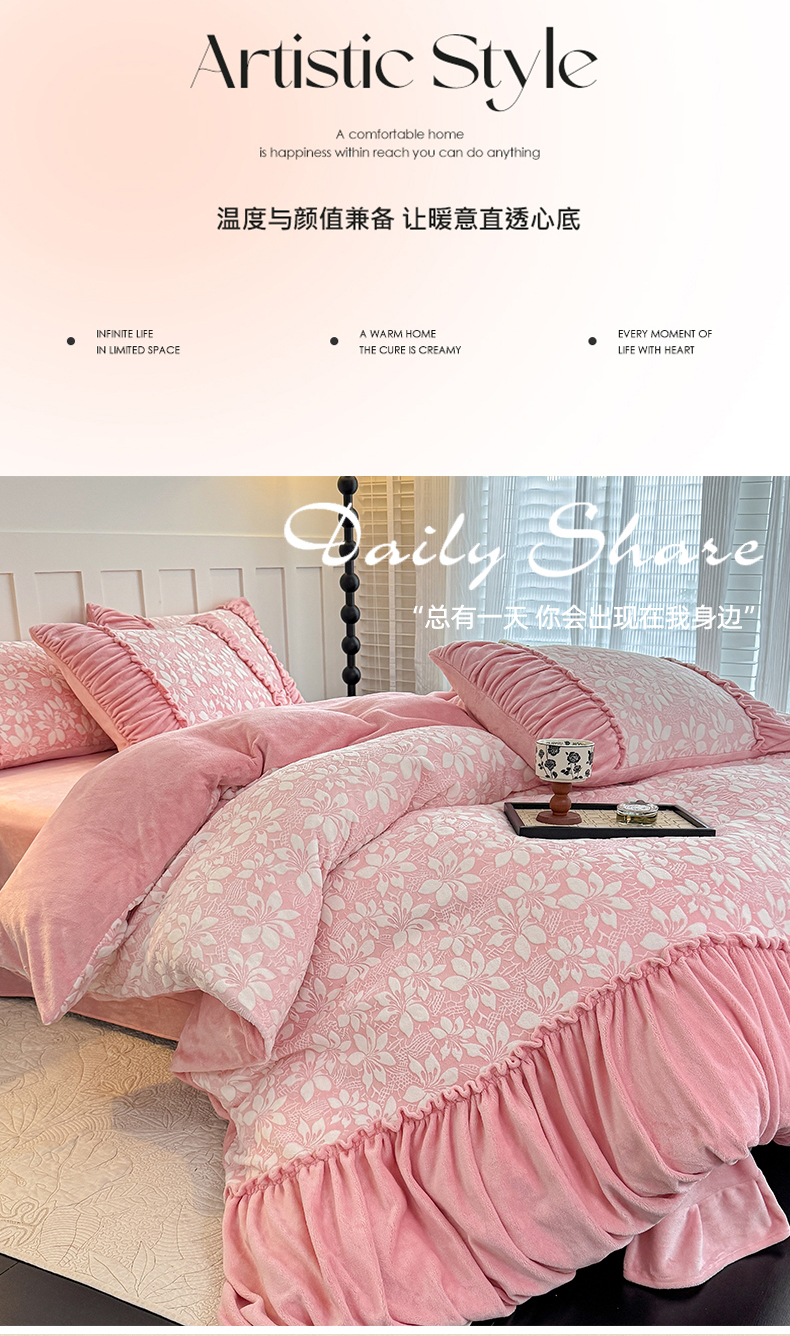 (总) 2025韩版双花边多功能AB面牛奶绒四件套甜美仙女法式花边韩式小碎花印花牛奶绒四件套加绒保暖单被套罩,紫韵花开,富贵花开,简约之家,花语,梦幻花园,春暖花开