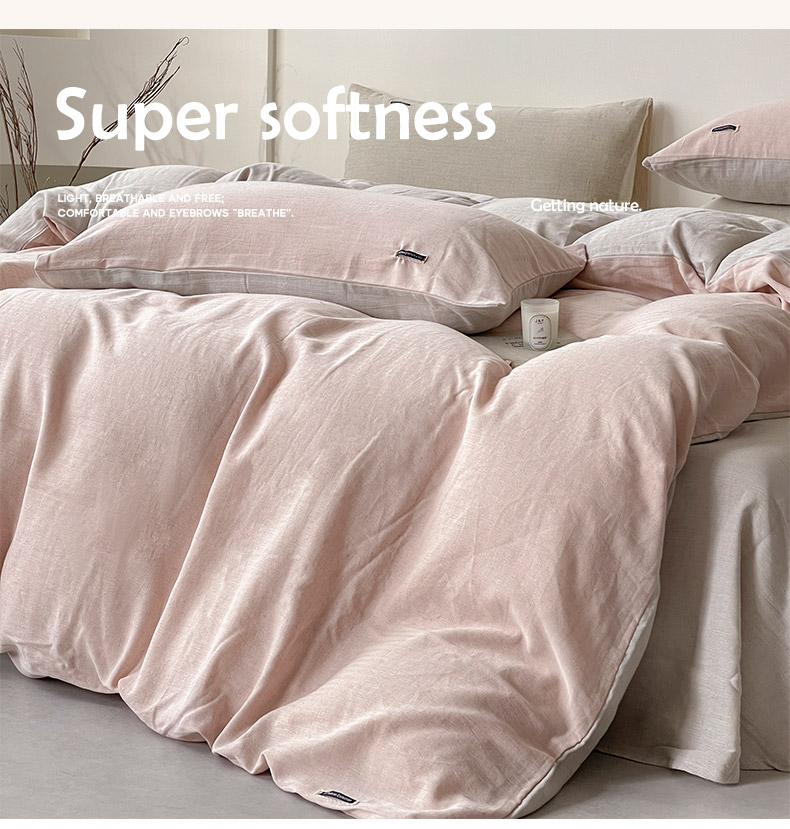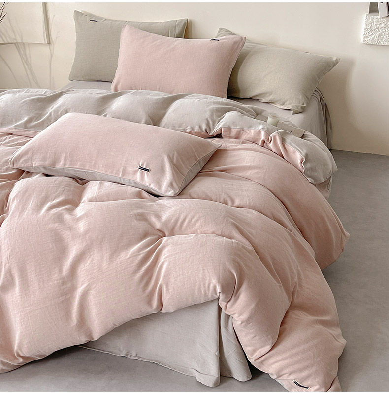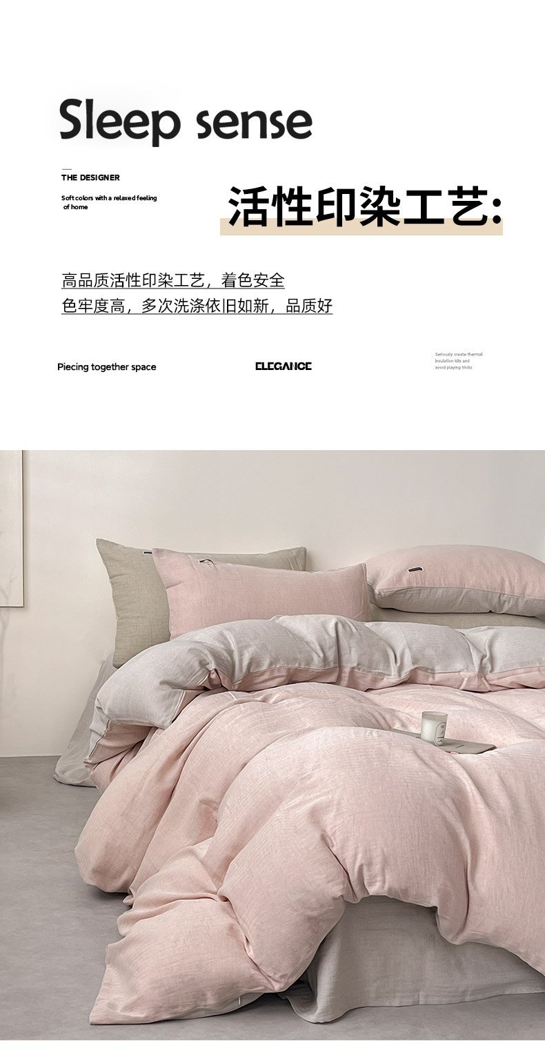 商品名称:2025新款休闲风超柔棉麻四件套简约纯棉全棉复古风素色亚麻高端床上用品四季通用 安缦-粉
