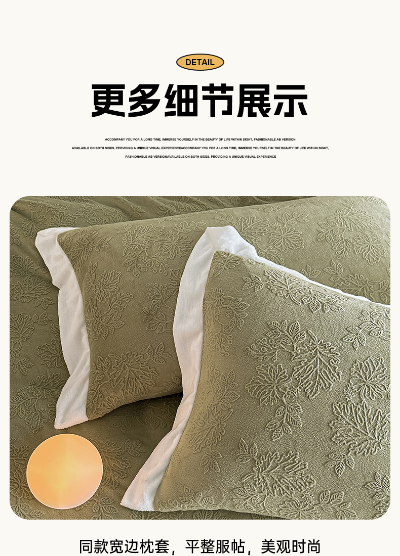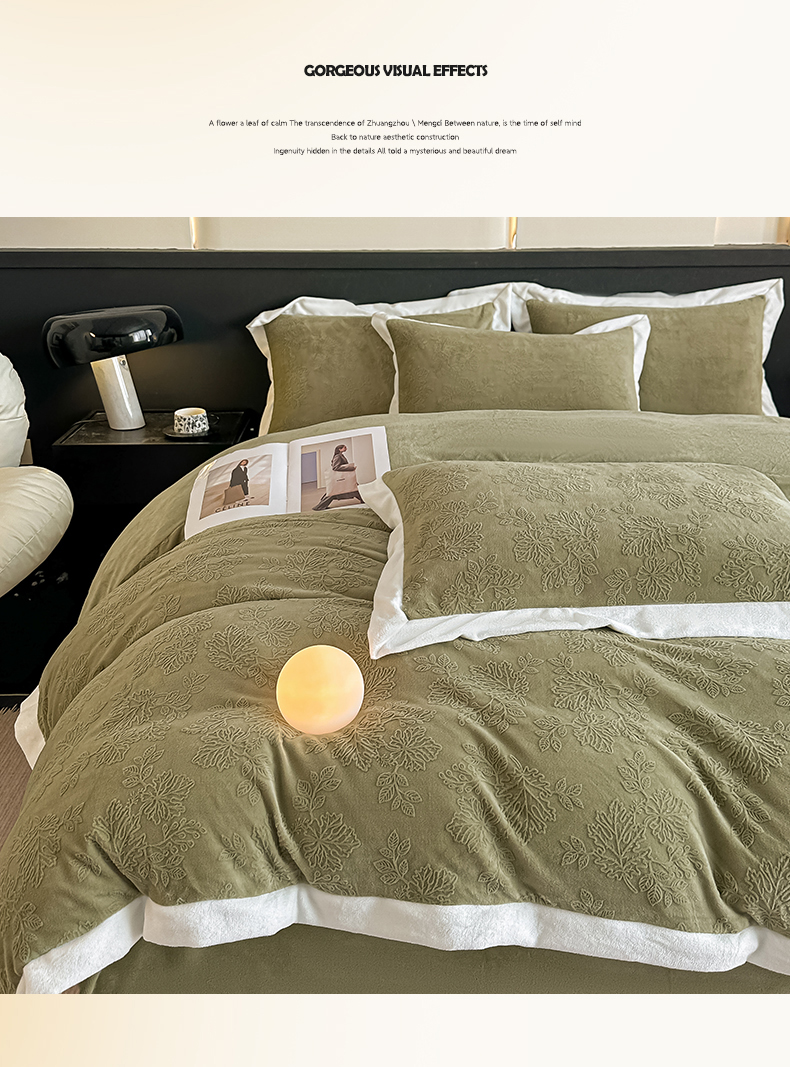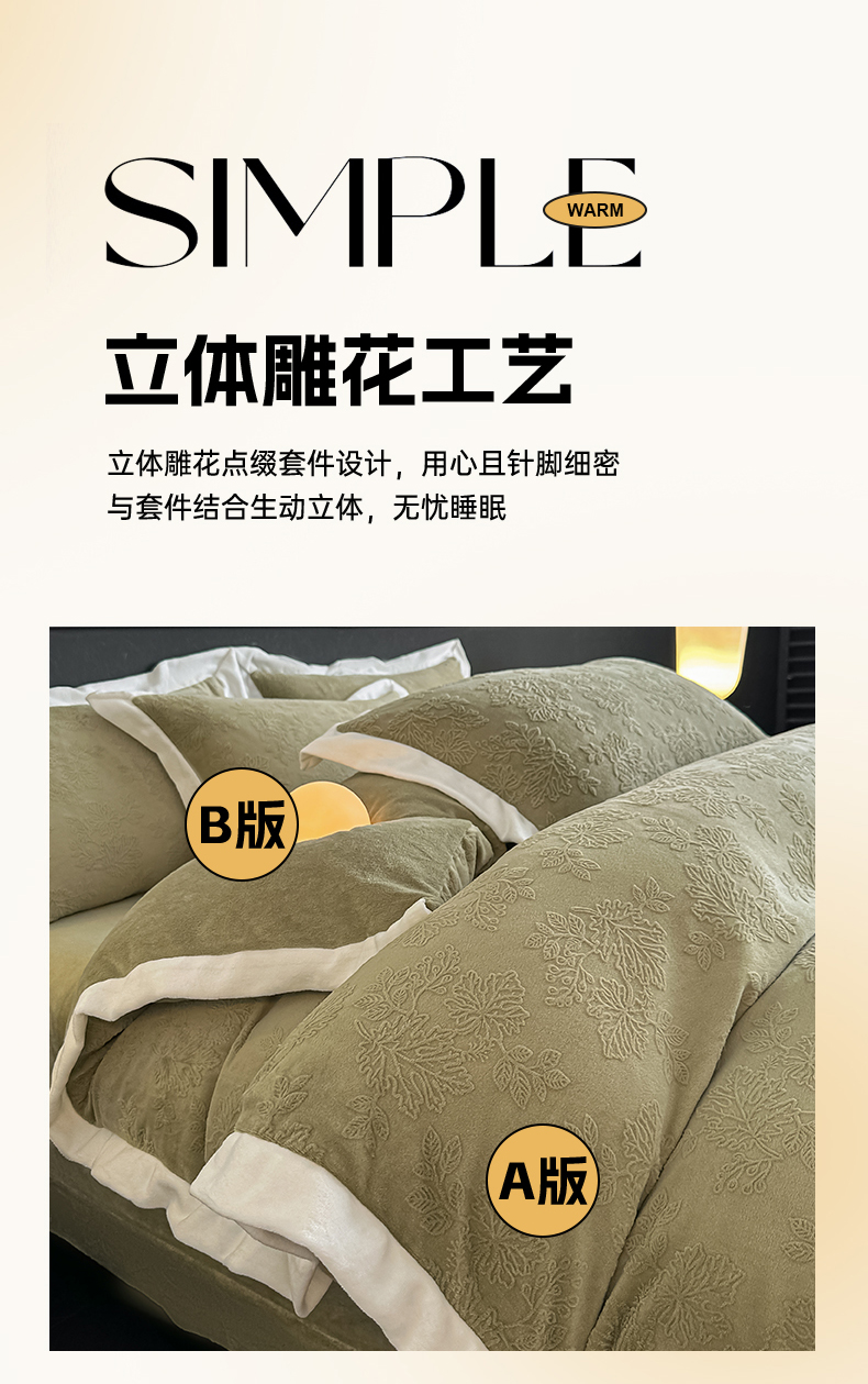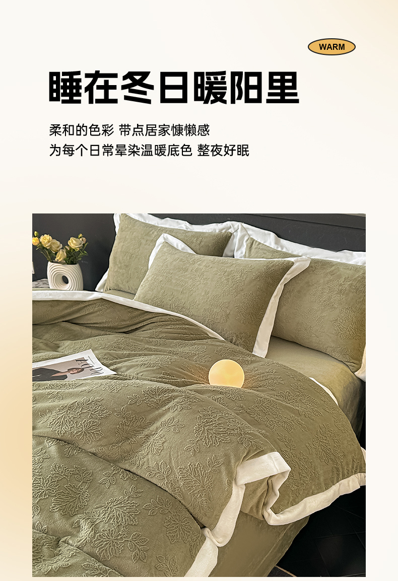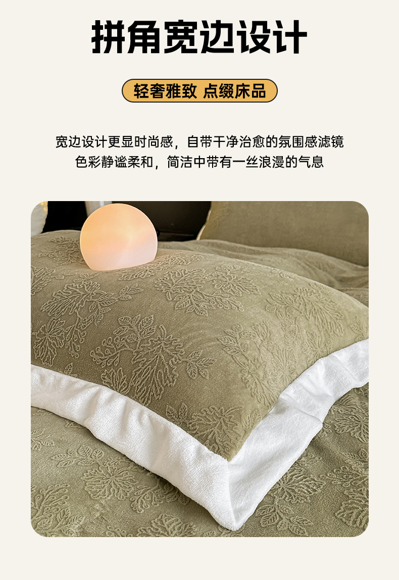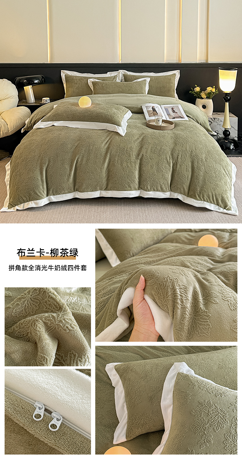当前位置: 91家纺网 > 商品网购 > 床品套件 > 四件套 > 牛奶绒四件套 > 亿梵家居 2025秋冬新款-拼角款A类全消光牛奶绒立体5D雕花绒四件套 布兰卡-柳茶绿
