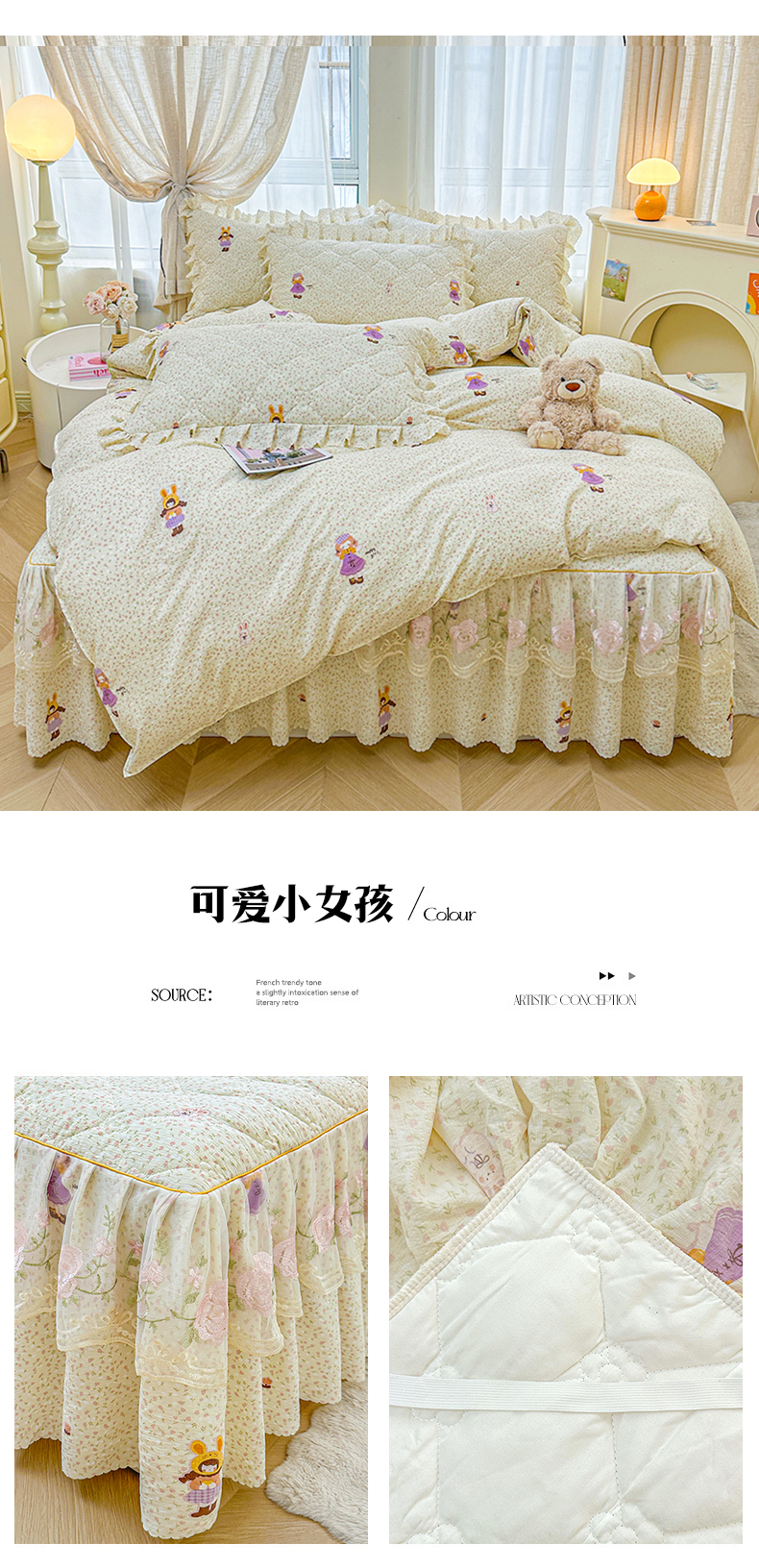(总)艾裙海 2025新款蕾丝边牛奶绒床盖四件套,花间兔,米奇妹妹,朦胧格灰兰,花漾-紫,花间兔-绿,梦想家-绿,几何-灰,南瓜派-兰,樱桃之恋,七彩叶子